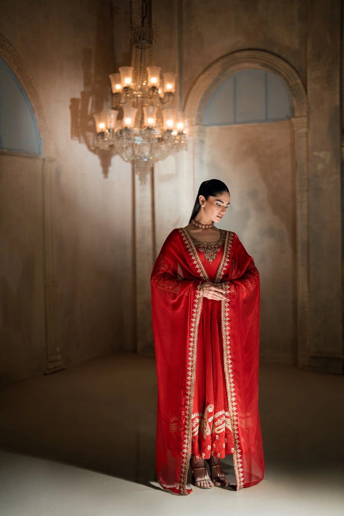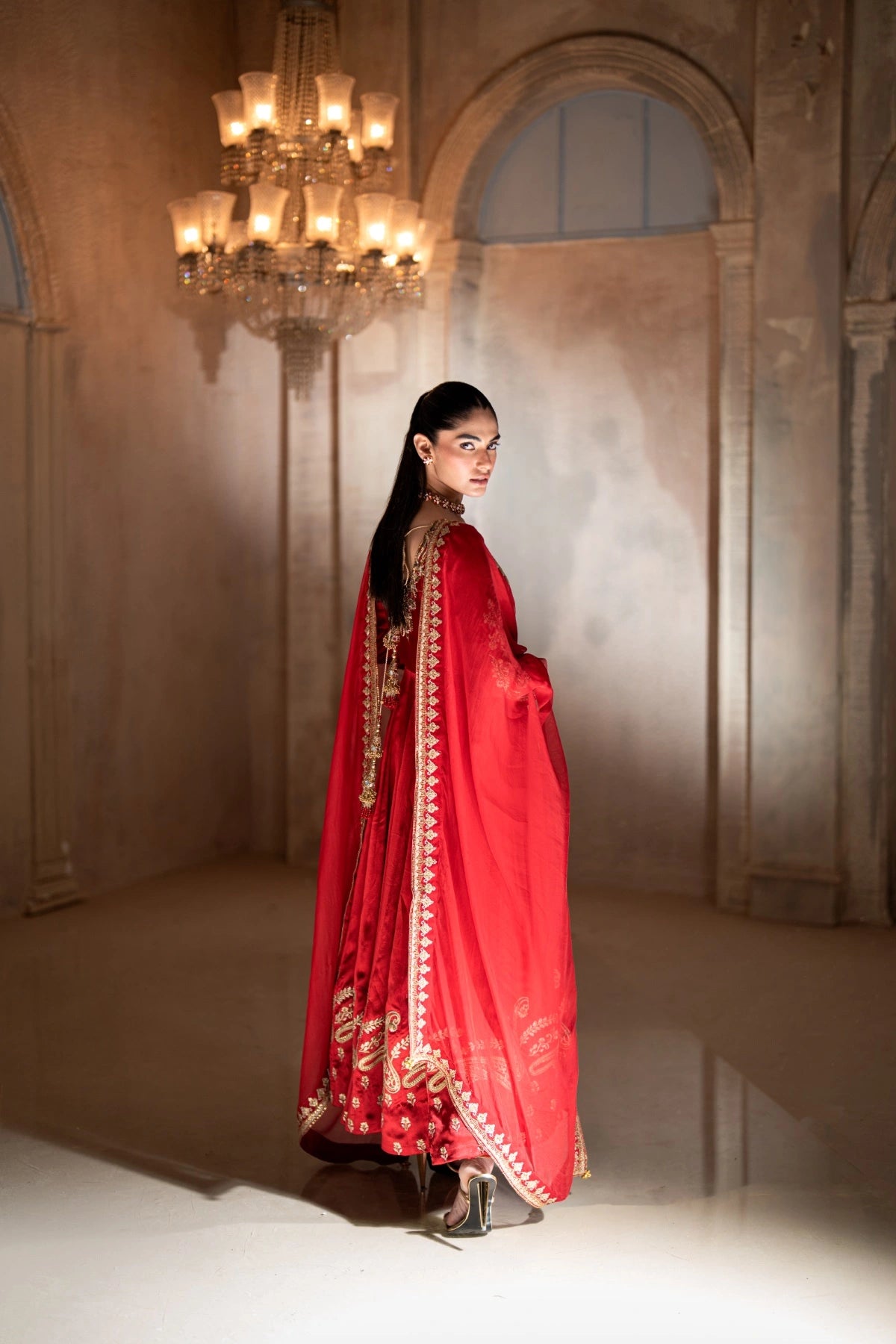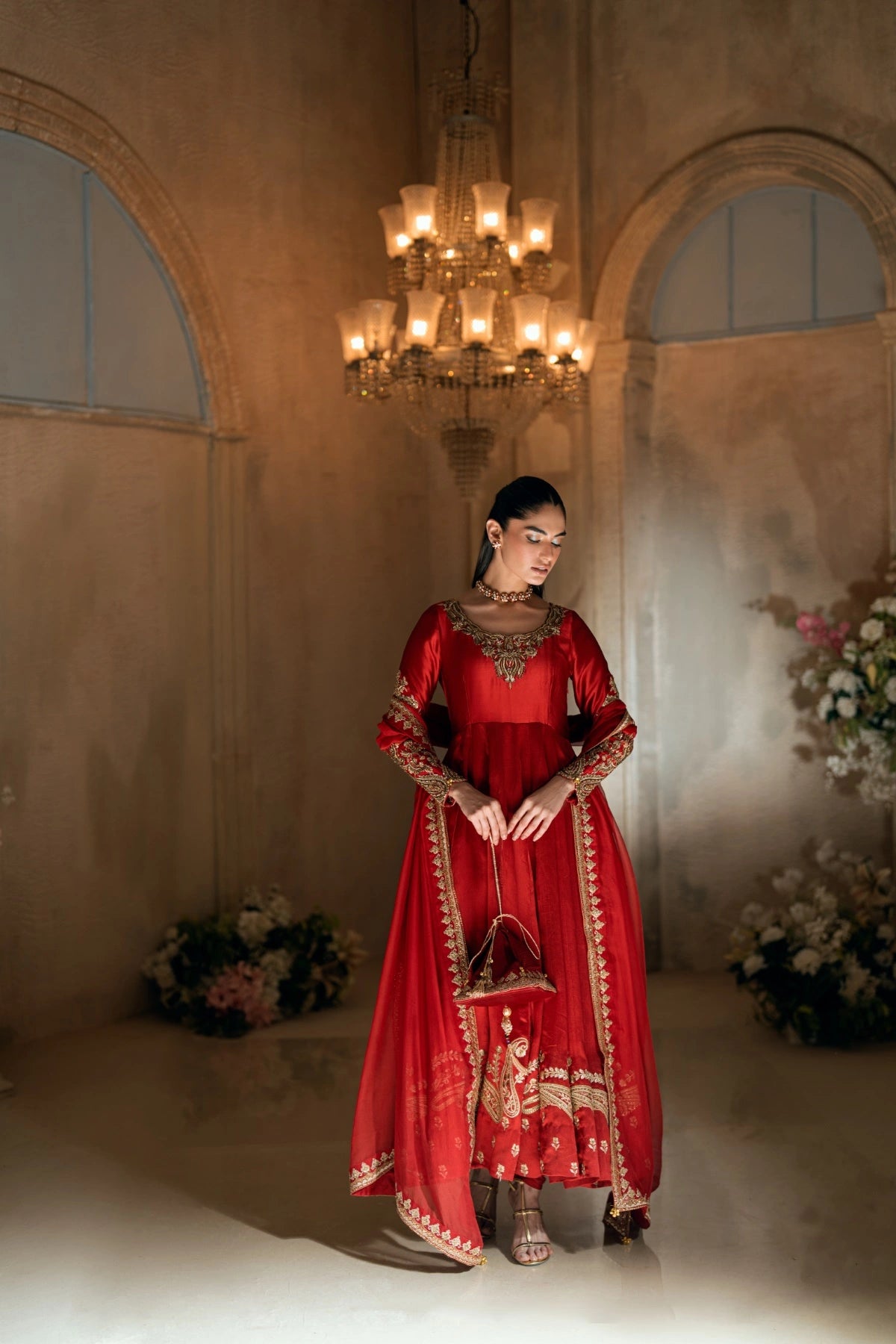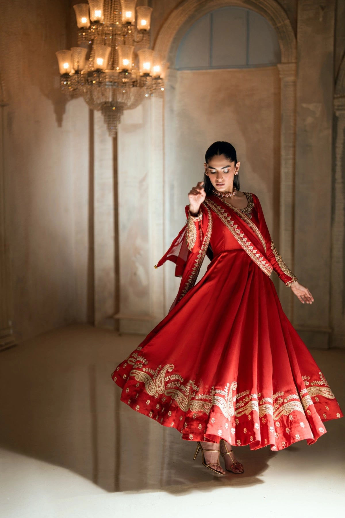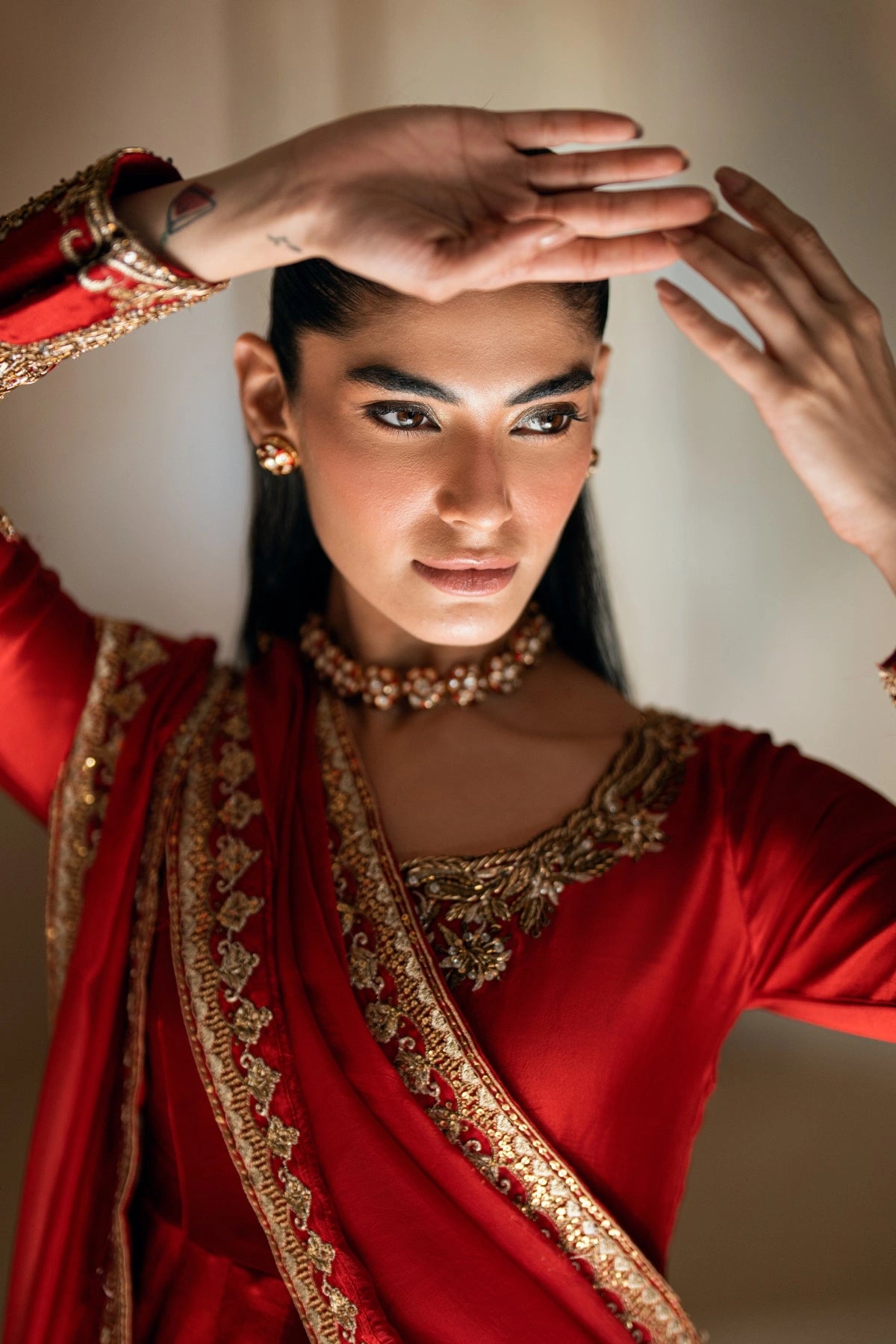 Masterfully tailored from premium sheesha silk, this breathtaking red peshwas features a dramatic 24-panel silhouette that flows with regal grace. The flared hem is enriched with intricate gold embroidery, creating depth and movement with every step. Meticulous handwork of kora, dabka, and stones adorns the neckline and sleeves, catching the light with a refined brilliance, while delicate ghungroo accents add a traditional rhythm to the design.