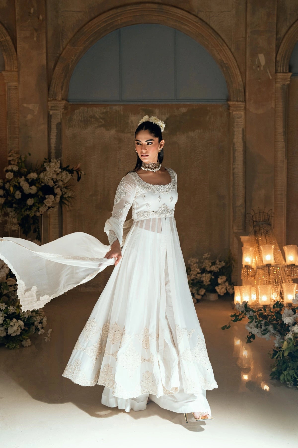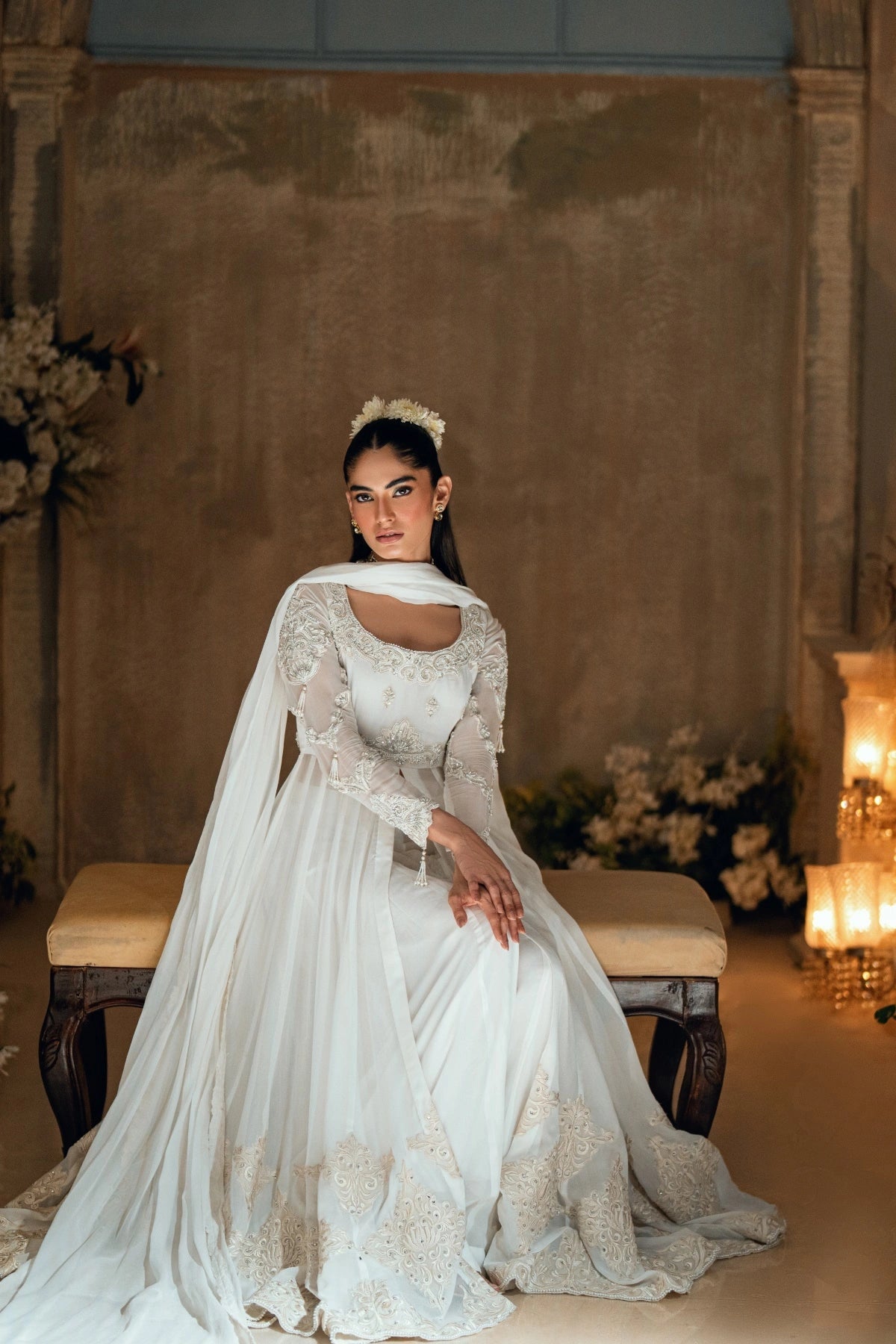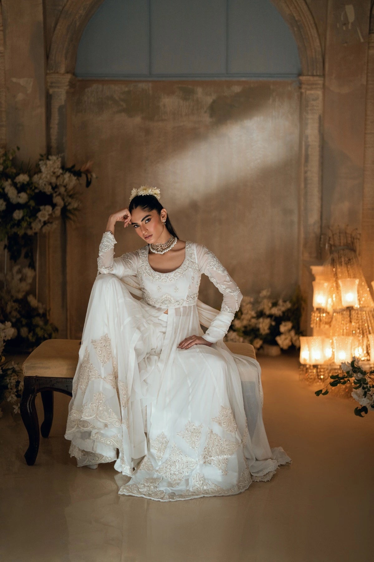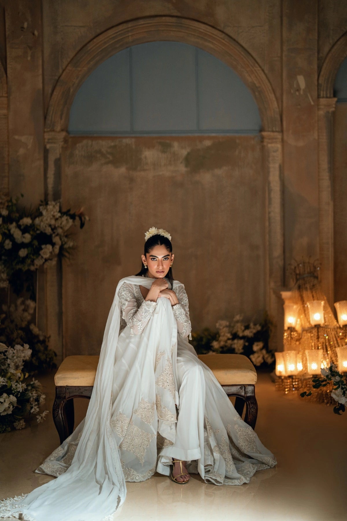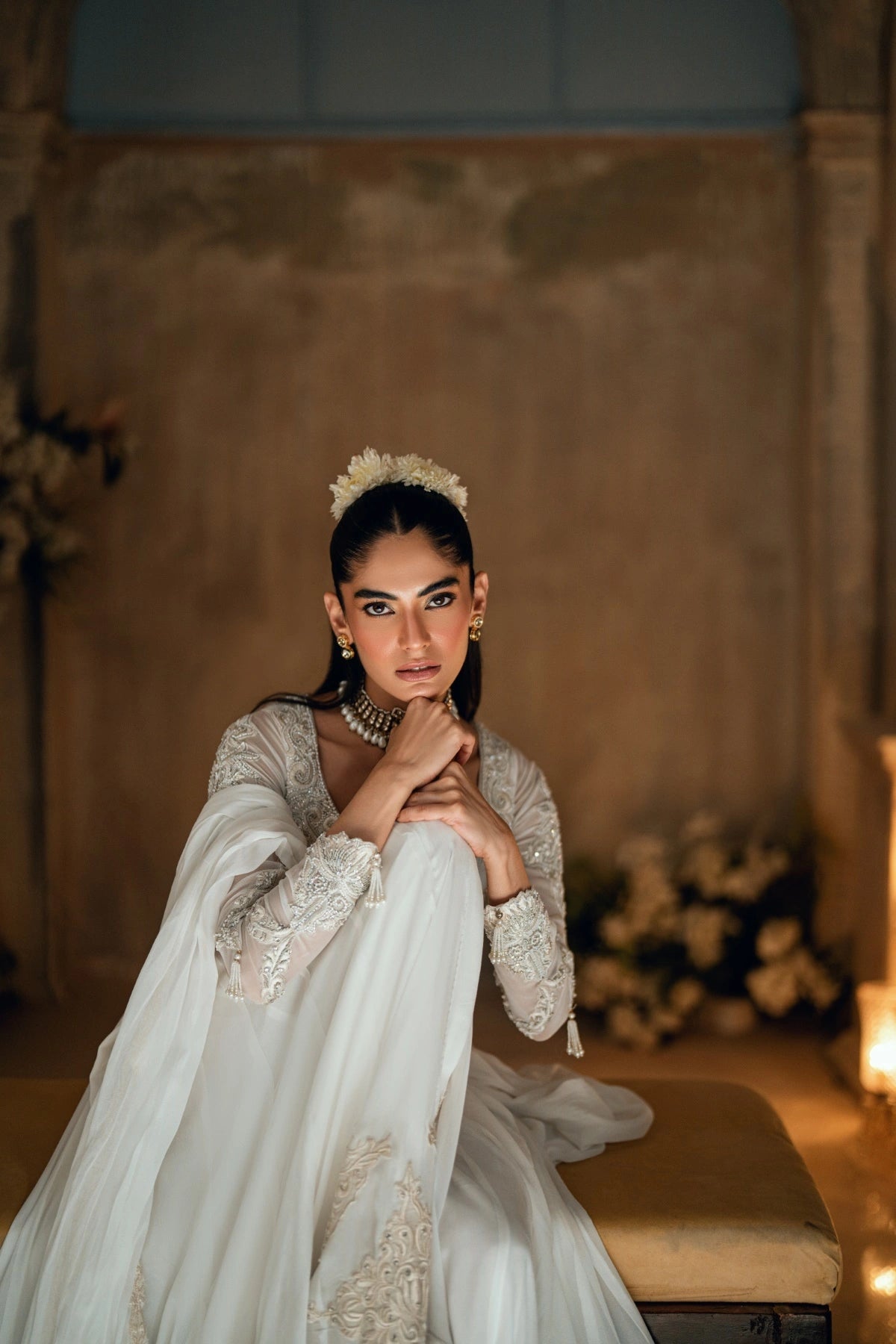 Crafted in airy white chiffon, this front-open pishwas is designed to fall effortlessly, creating a soft, flowing silhouette that feels both regal and restrained. The bodice and sleeves are meticulously hand-embroidered with white pearls and stones, forming a delicate surface texture that continues seamlessly into the embroidered hem — subtle, refined, and deeply elegant rather than ornate.