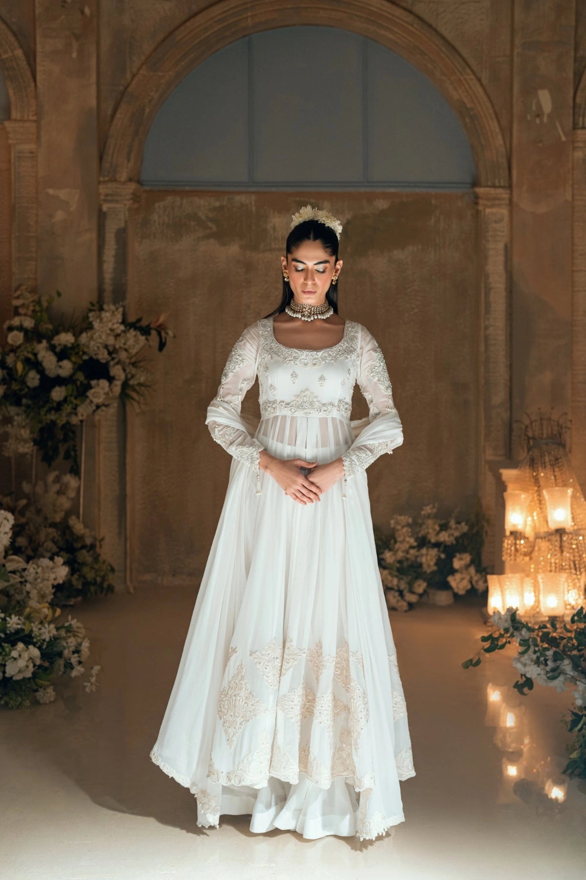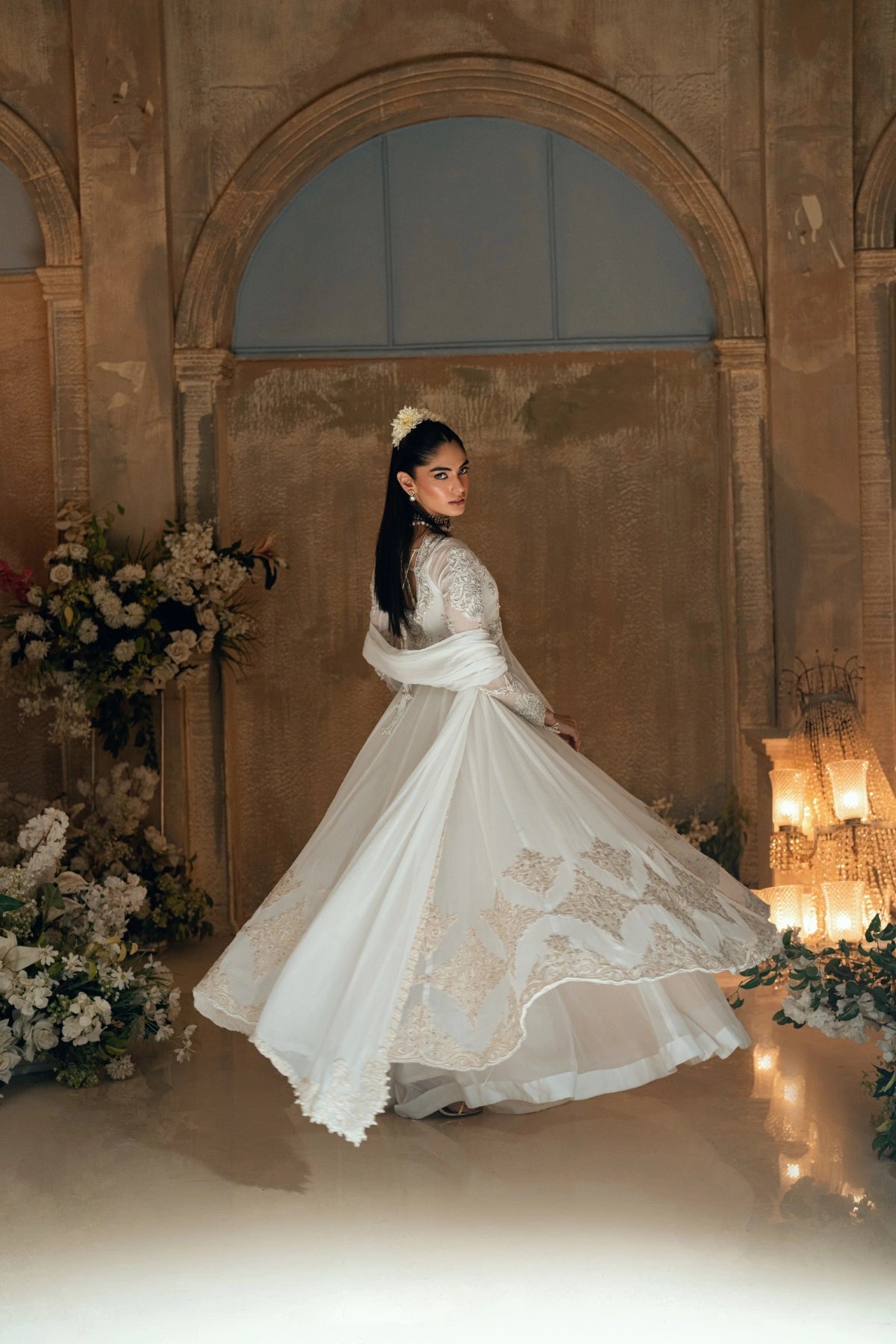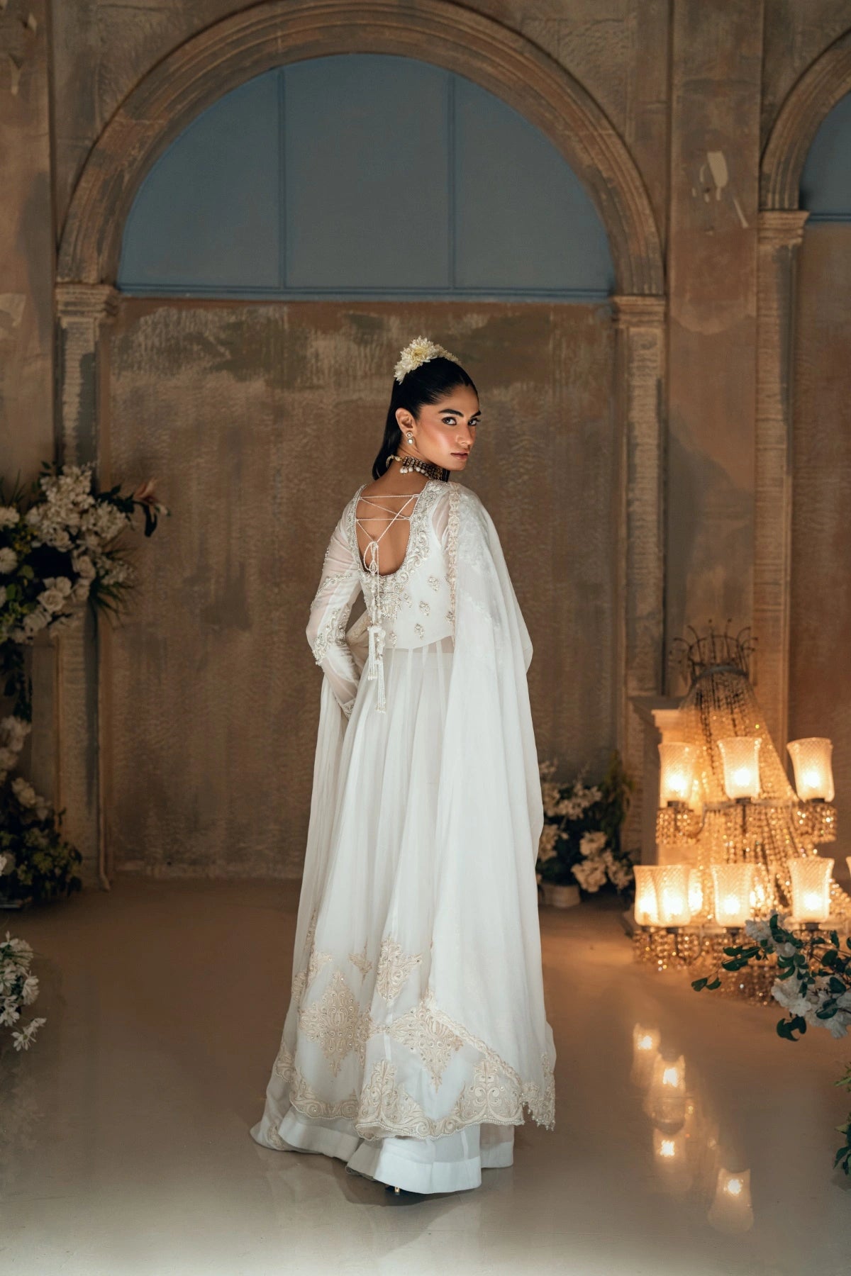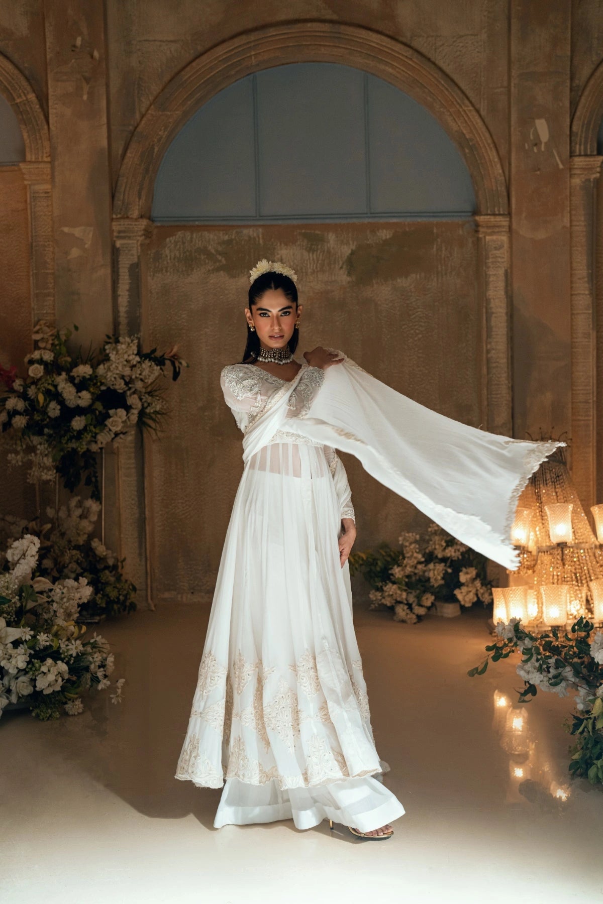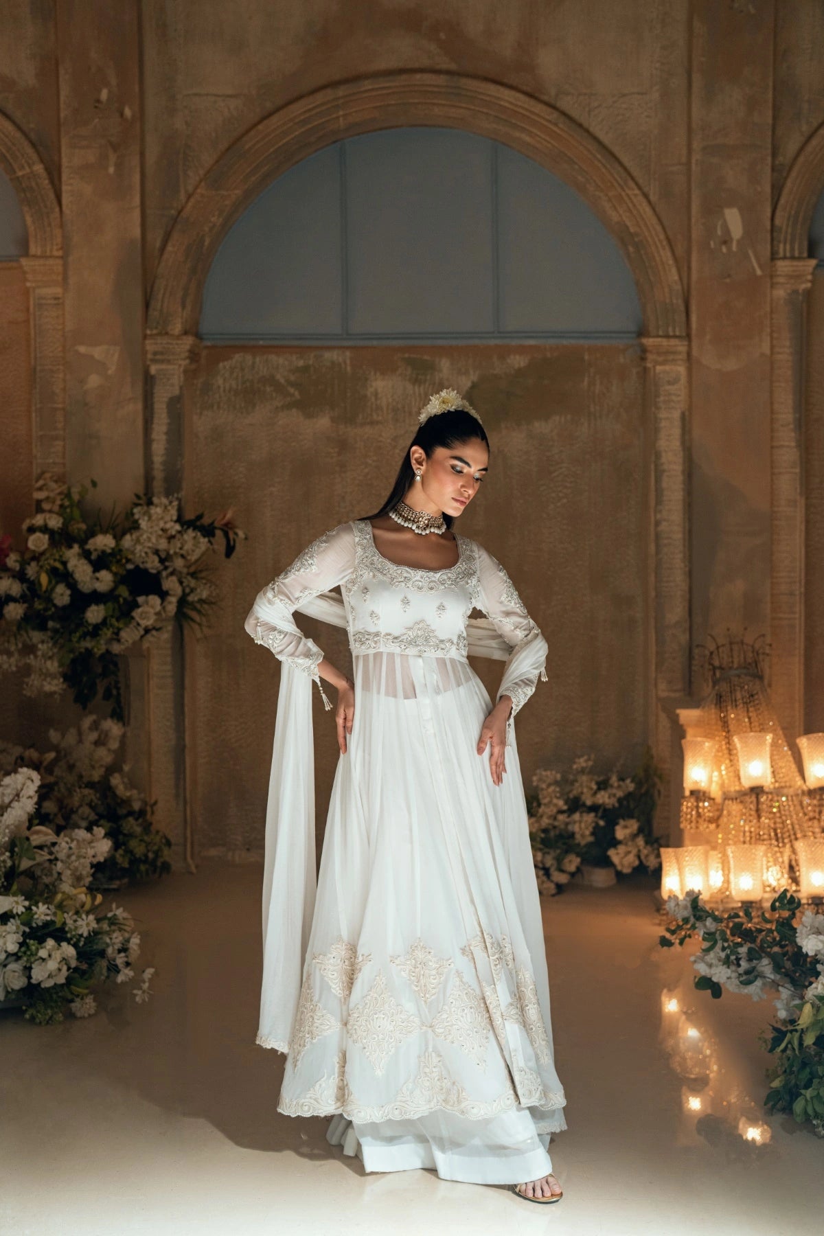 Crafted in airy white chiffon, this front-open pishwas is designed to fall effortlessly, creating a soft, flowing silhouette that feels both regal and restrained. The bodice and sleeves are meticulously hand-embroidered with white pearls and stones, forming a delicate surface texture that continues seamlessly into the embroidered hem — subtle, refined, and deeply elegant rather than ornate.