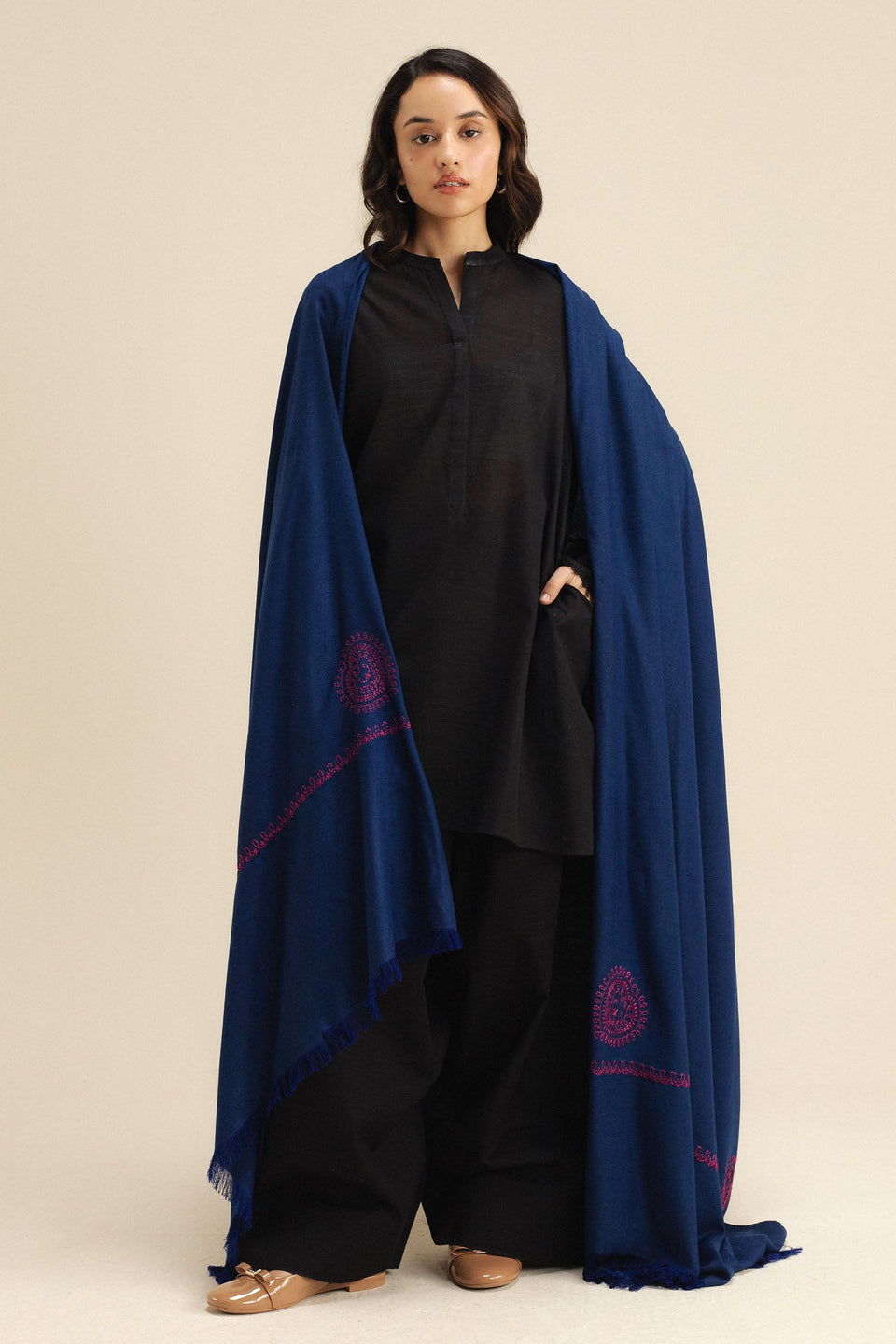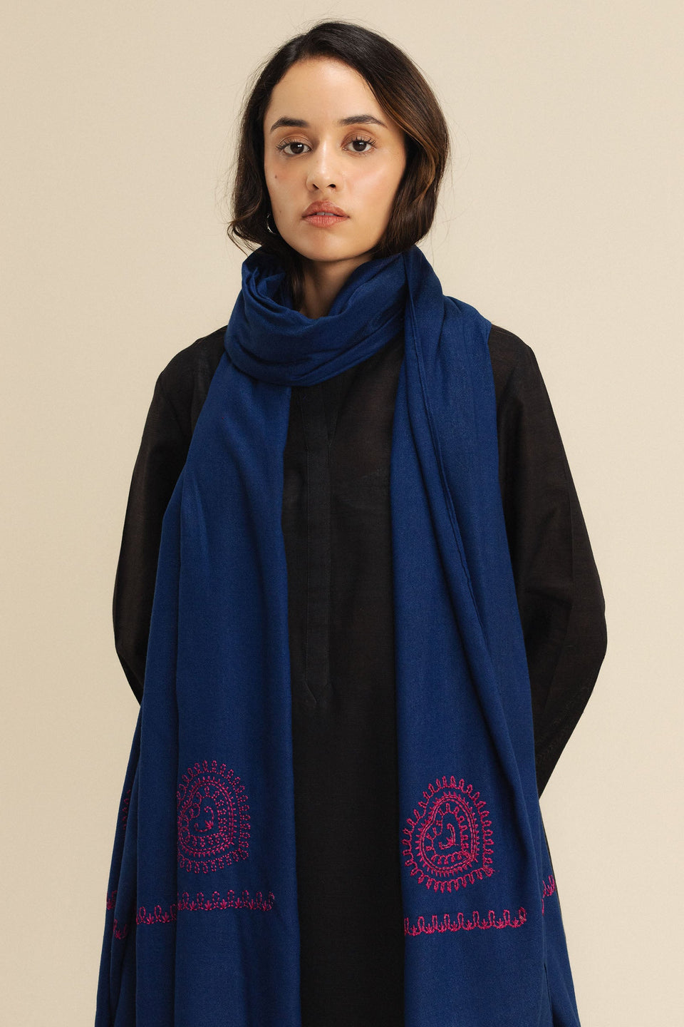 A blue wool peach shawl adorned with intricate magenta embroidery on the pallu, perfect for elevating any look.
