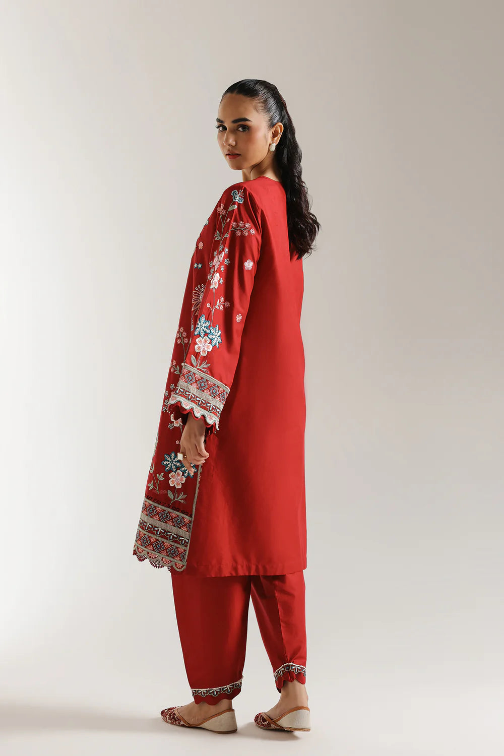 Unleash a burst of vibrant sophistication with this stunning pink embroidered ensemble. The rich pink kurta is a canvas for an exquisite display of multi-colored floral embroidery, intricately woven in shades of blue, green, and hints of white. The embroidery richly adorns the V-neckline, cascading down the front of the shirt in a symmetrical design. The full sleeves feature complementary embroidery and a unique patterned border along the cuffs, adding to the garment's distinctive charm. The bottom hem of the shalwar is also beautifully detailed with a wide, embroidered border that adds a touch of traditional elegance. Perfect for festive celebrations, cultural events, or making a memorable impression at any gathering, this ensemble truly stands out with its vibrant appeal.