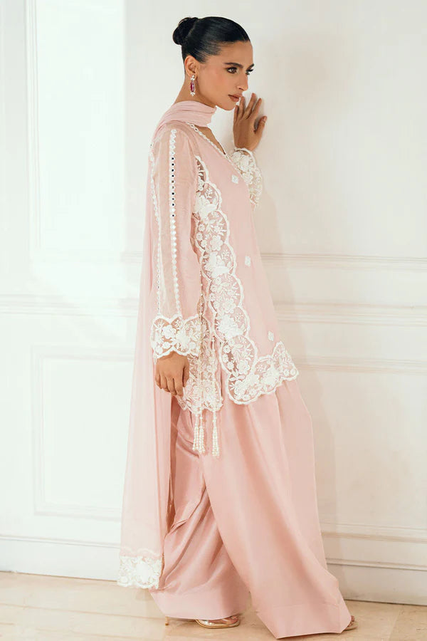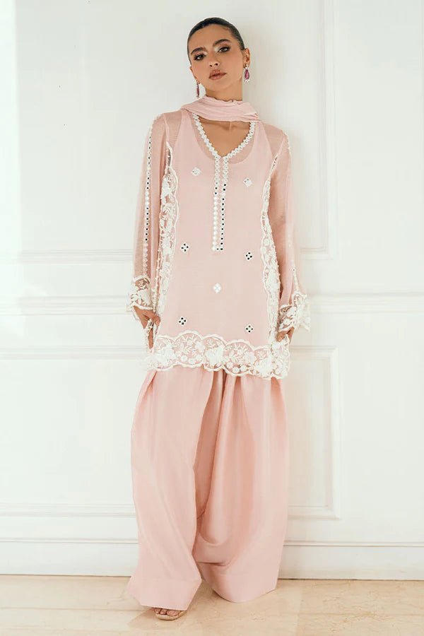 Huria captures timeless grace in a delicate soft pink pure cotton net shirt, embellished with thread and mirror work on the shirt and sleeves. An appliqué beaded cutwork border runs seamlessly along all four sides of the shirt and the dupatta pallus, adding a touch of refined luxury.