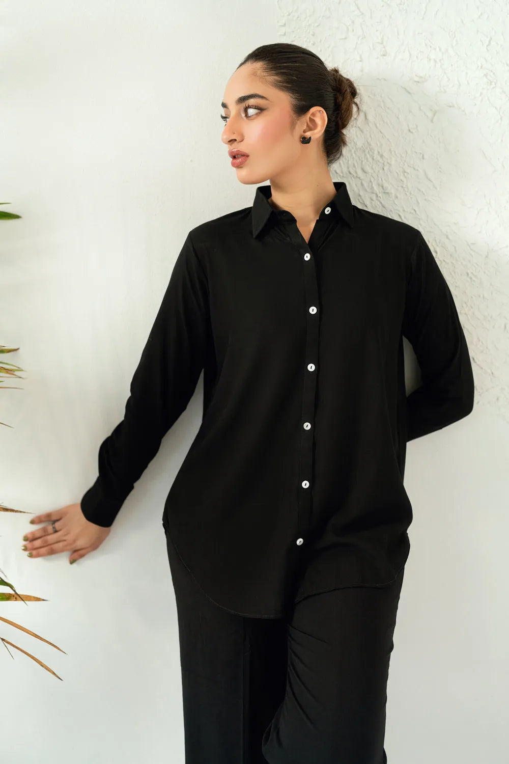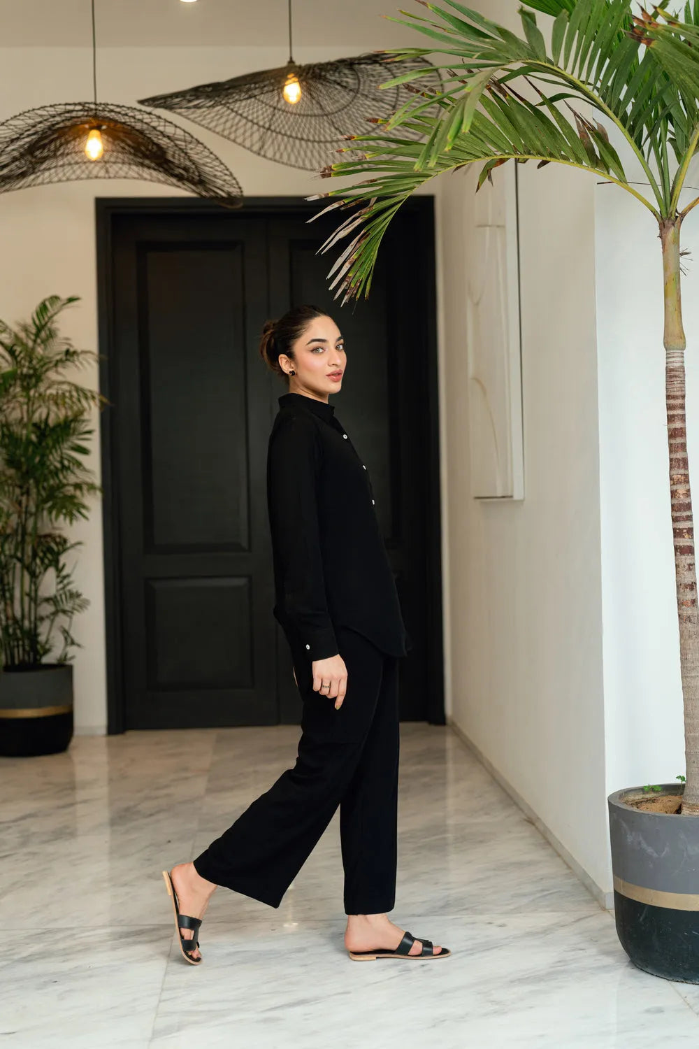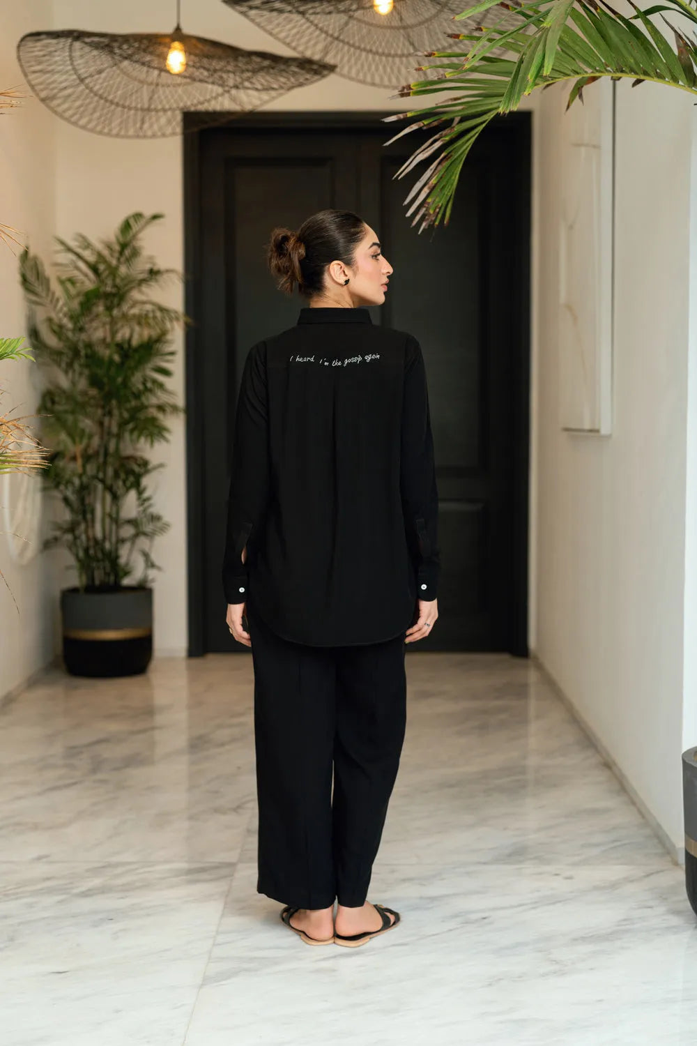 This outfit comprises of a short button down shirt, comprising of a tennis collar and cuffed sleeves, the back of the shirt features the signature embroidered text, “I heard im the gossip again”, paired with classic straight culottes