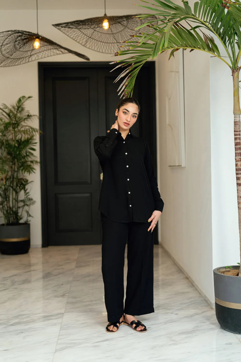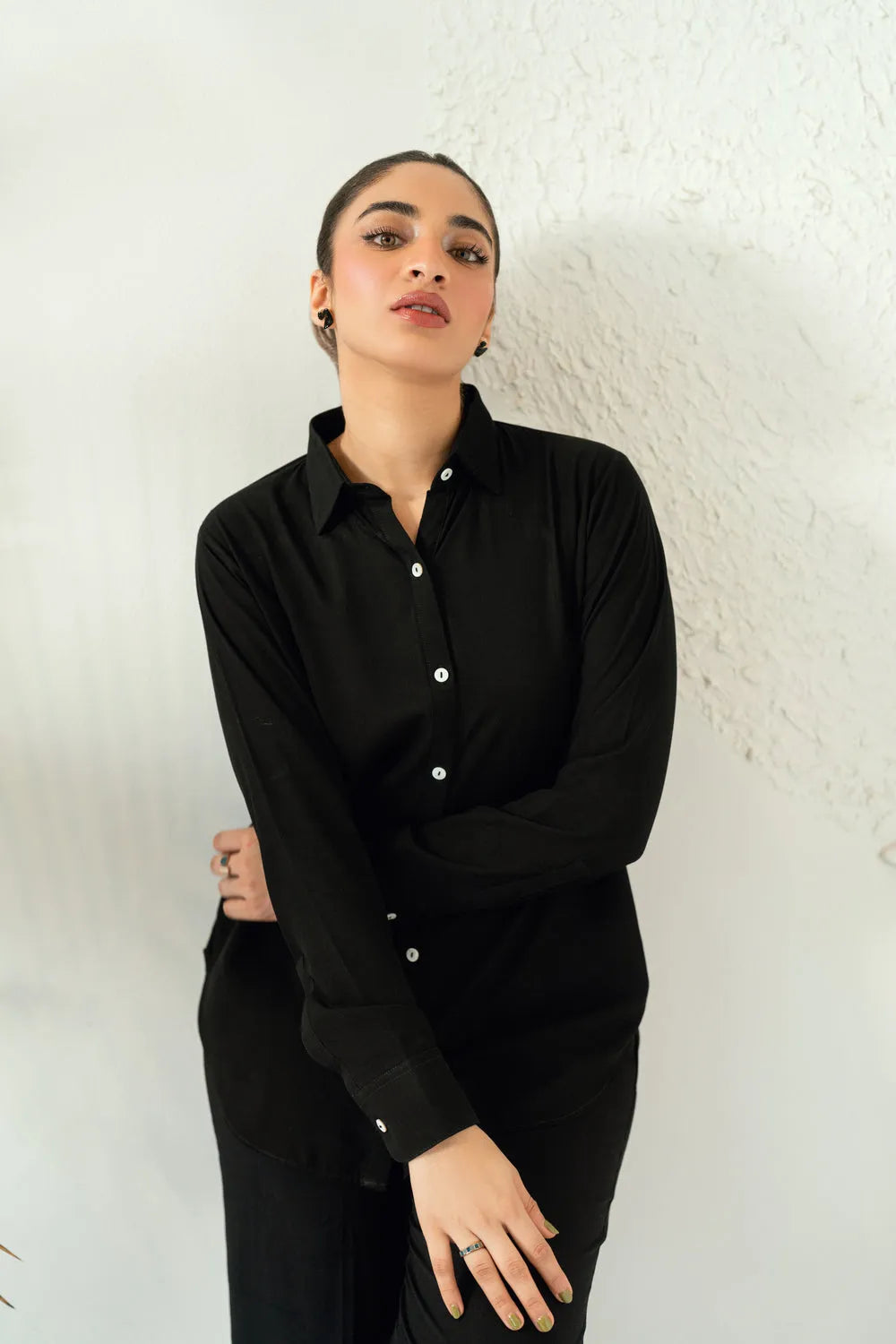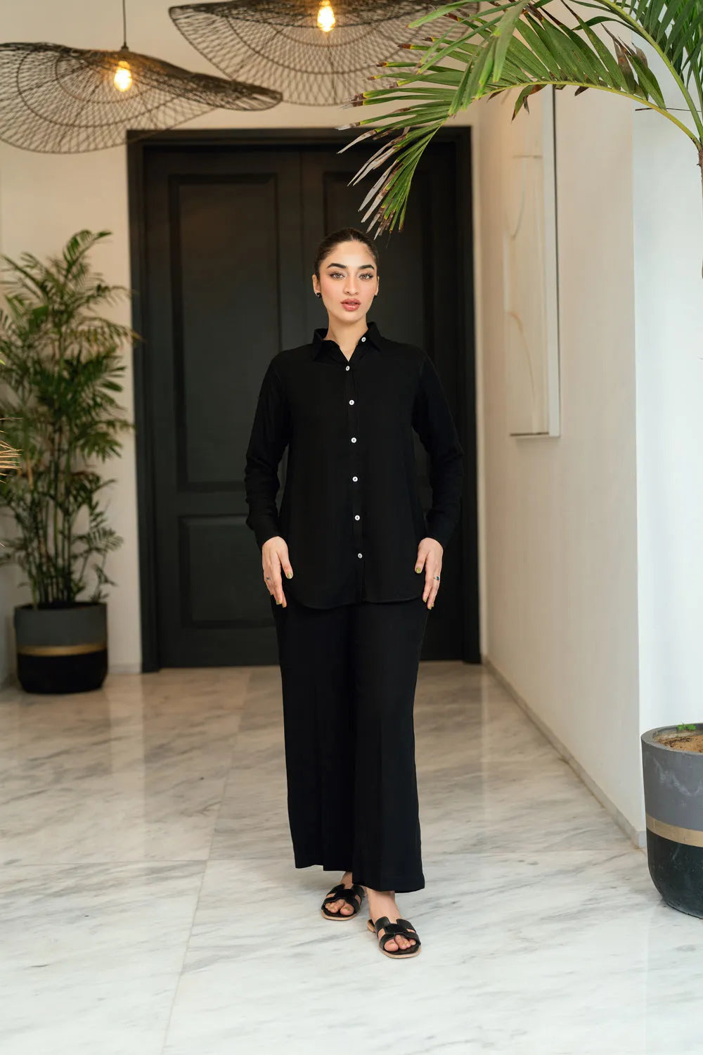 This outfit comprises of a short button down shirt, comprising of a tennis collar and cuffed sleeves, the back of the shirt features the signature embroidered text, “I heard im the gossip again”, paired with classic straight culottes