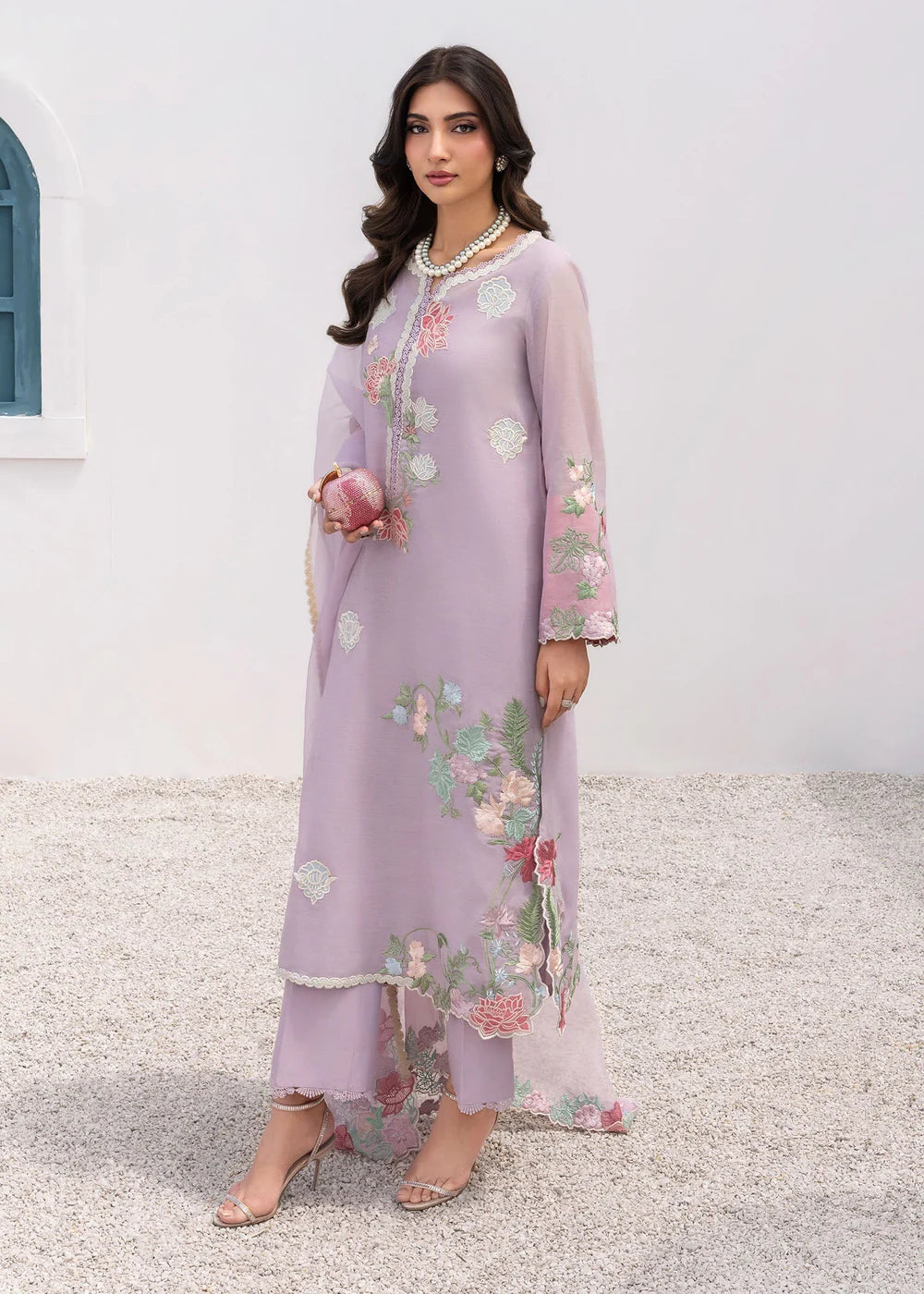Additional Description: The Poem of Lavender. A celebration of soft romance , Irisé is a design that evokes the delicate poetry of lavender kissed sky. Embroidered in ghara technique in soft blue hue, and appliquéd in bright coral lilies this ensemble radiates elegance and grace. The sleeves, adorned with with cut our embroidery and a contrasting coral finish, offer a gentle pop of color. . The airy cotton net dupatta, has embroidered cutout corners on all four side and ivory borders finishing the lengths. The soft, romantic embroidery enhances this ensembles inherent grace.