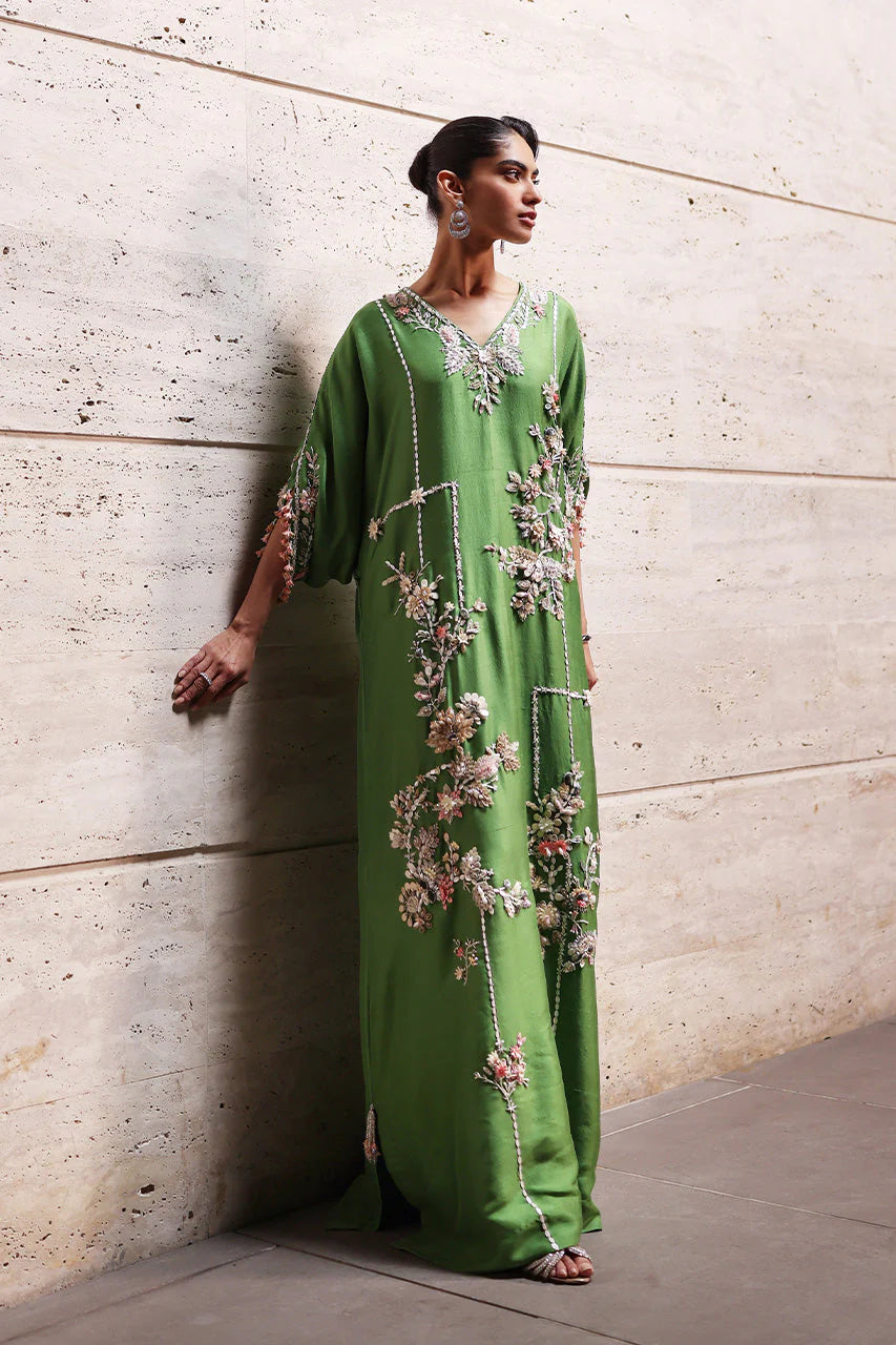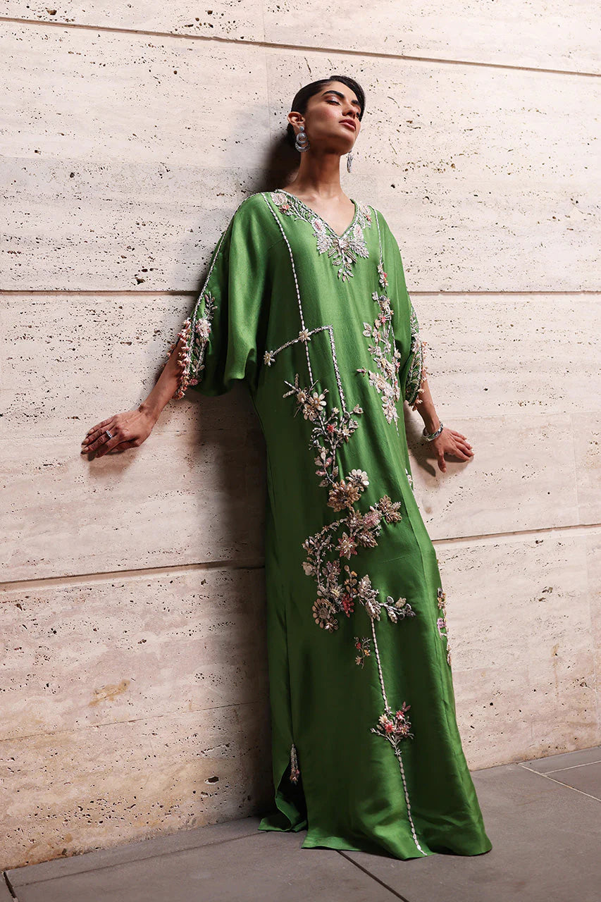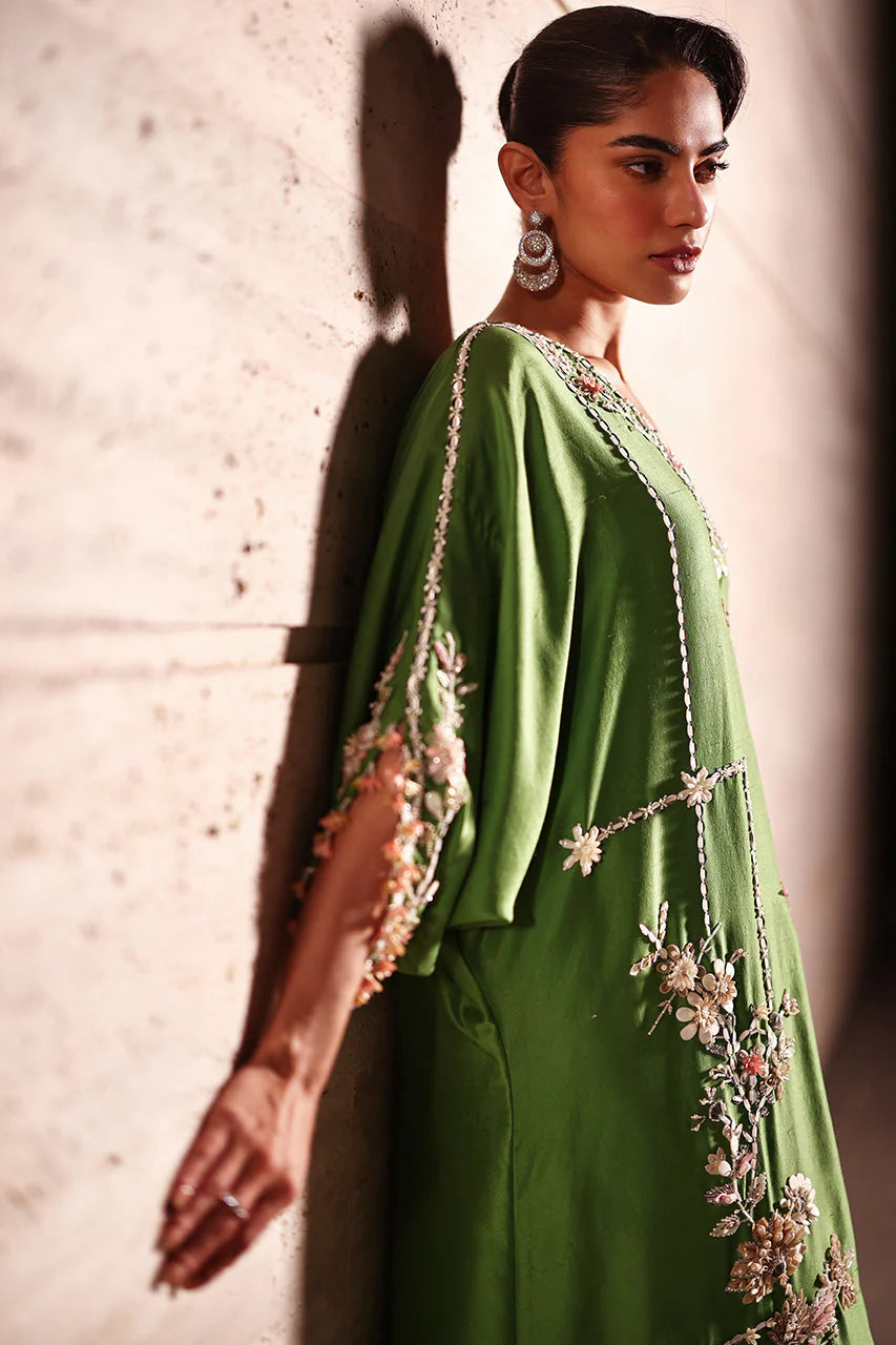 A green raw silk kaftan carries a floral dream, with meticulous arrangements around the neckline to bouquets asymmetrically placed along its length, connected with intricately detailed lines. The sleeves echo the floral bliss too, crafted from soft-hued sequins, fabric florals, beads, and crystals that catch light delicately. Beaded tassels mark the side slits and sleeves, completing the contemporary composition, with a solid green crepe silk shella, edged with matching tassels, layered lightly atop.