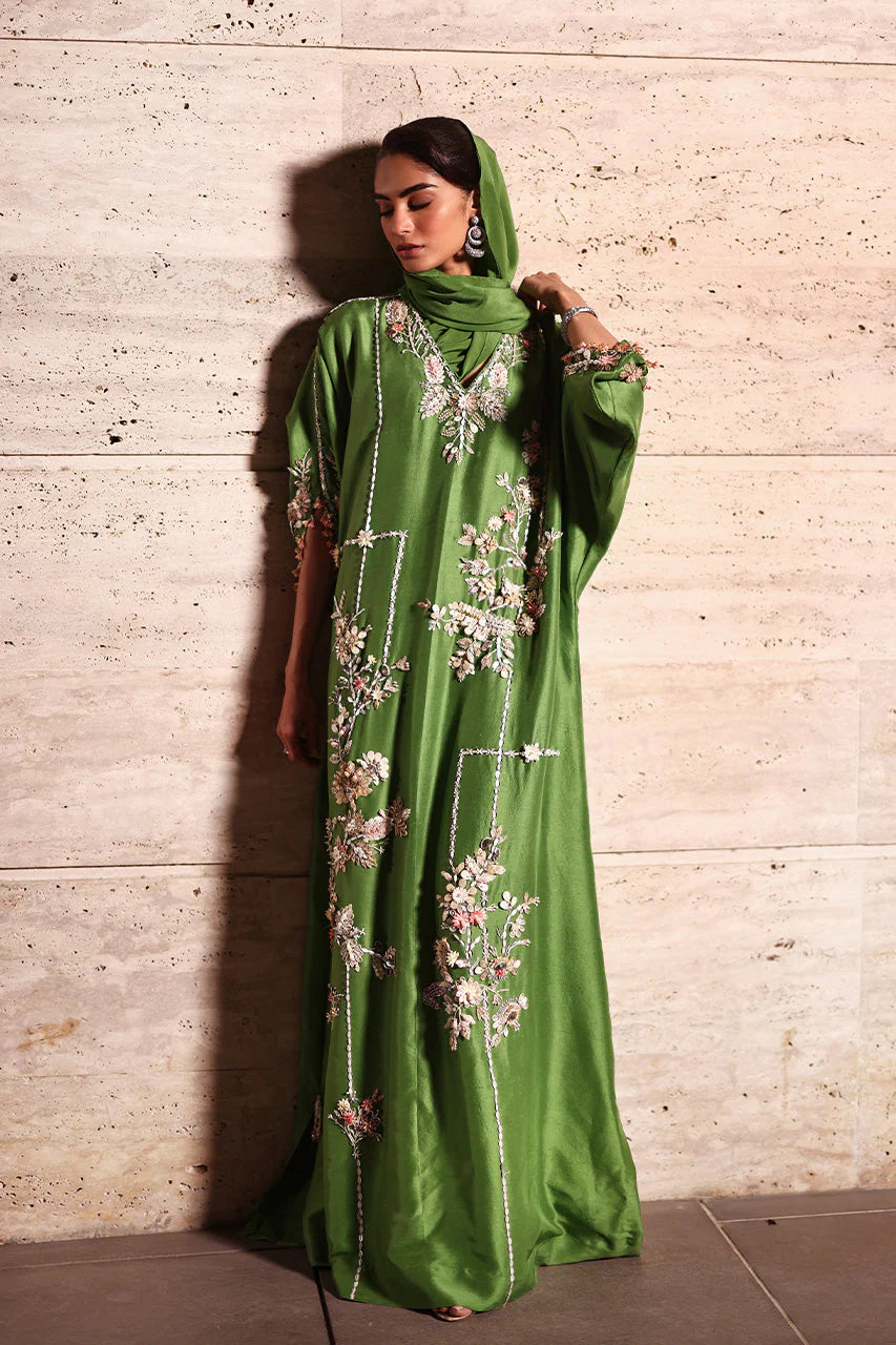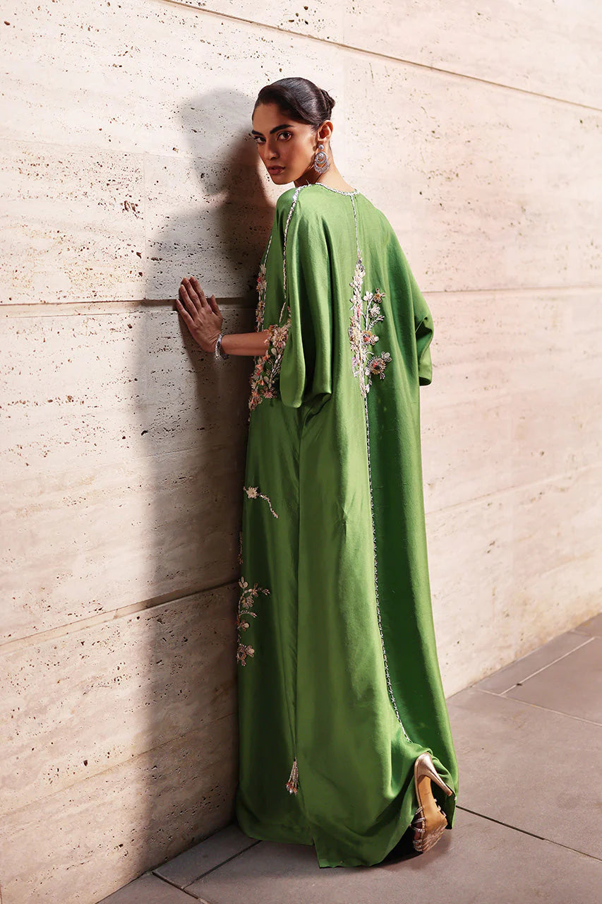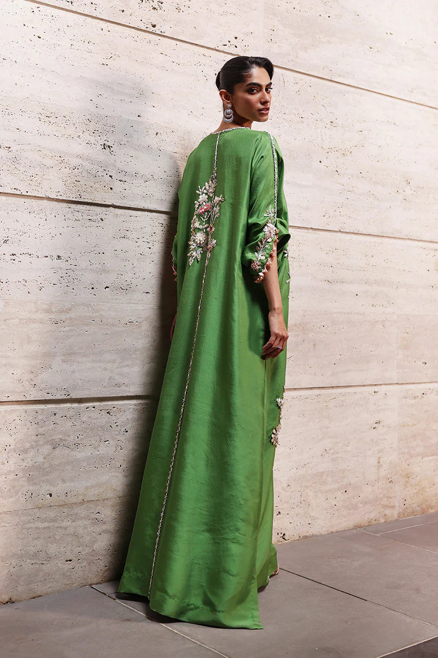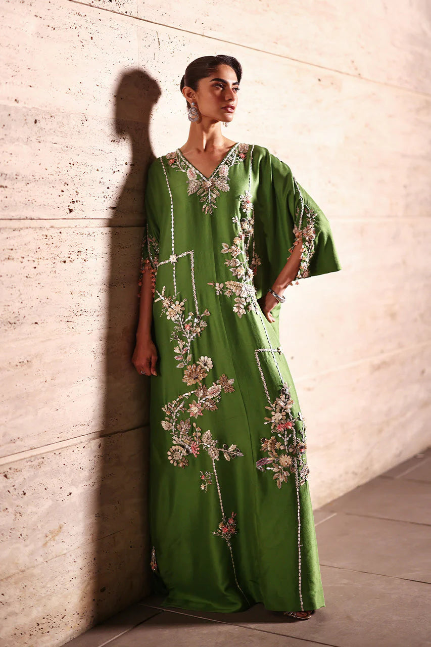 A green raw silk kaftan carries a floral dream, with meticulous arrangements around the neckline to bouquets asymmetrically placed along its length, connected with intricately detailed lines. The sleeves echo the floral bliss too, crafted from soft-hued sequins, fabric florals, beads, and crystals that catch light delicately. Beaded tassels mark the side slits and sleeves, completing the contemporary composition, with a solid green crepe silk shella, edged with matching tassels, layered lightly atop.