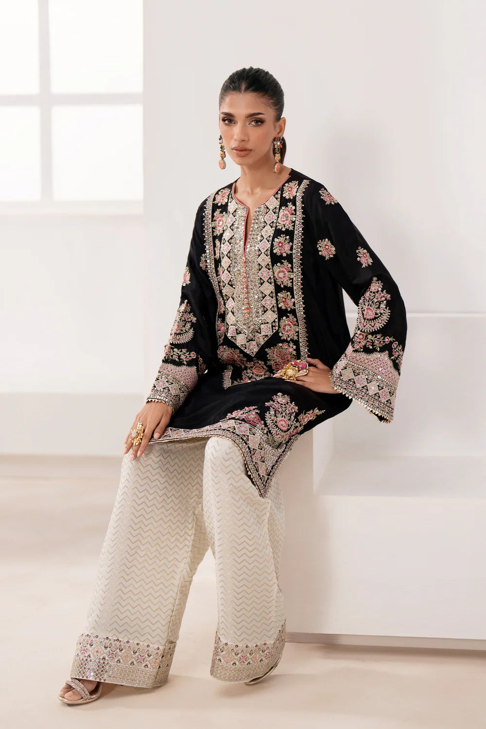 Immerse yourself in regal sophistication with this exquisite embroidered suit. The black shirt is a canvas for intricate, multi-colored embroidery in shades of pink, gold, and green. A heavily detailed placket and border, along with elaborate motifs on the sleeves, create a stunning visual. The ensemble is completed with wide-leg shalwar in a luminous, off-white fabric featuring a sophisticated geometric pattern and a delicately embellished border. This suit is the perfect blend of traditional artistry and modern elegance, designed to make a memorable statement.