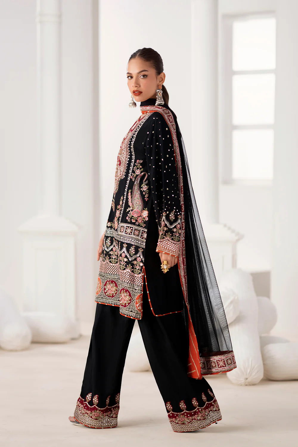 Envelop yourself in this breathtaking embroidered suit, a masterpiece of rich detail and traditional artistry. The black shirt is heavily embellished with intricate embroidery in deep crimson, gold, and green, creating a stunning visual feast. The elaborate patterns cover the neckline, sleeves, and hemline, reflecting a fusion of traditional motifs and contemporary style. The ensemble is completed with straight shalwar and a delicate, coordinating black dupatta with an embroidered border. This suit is designed for grand occasions, ensuring you make a statement of sophisticated elegance.