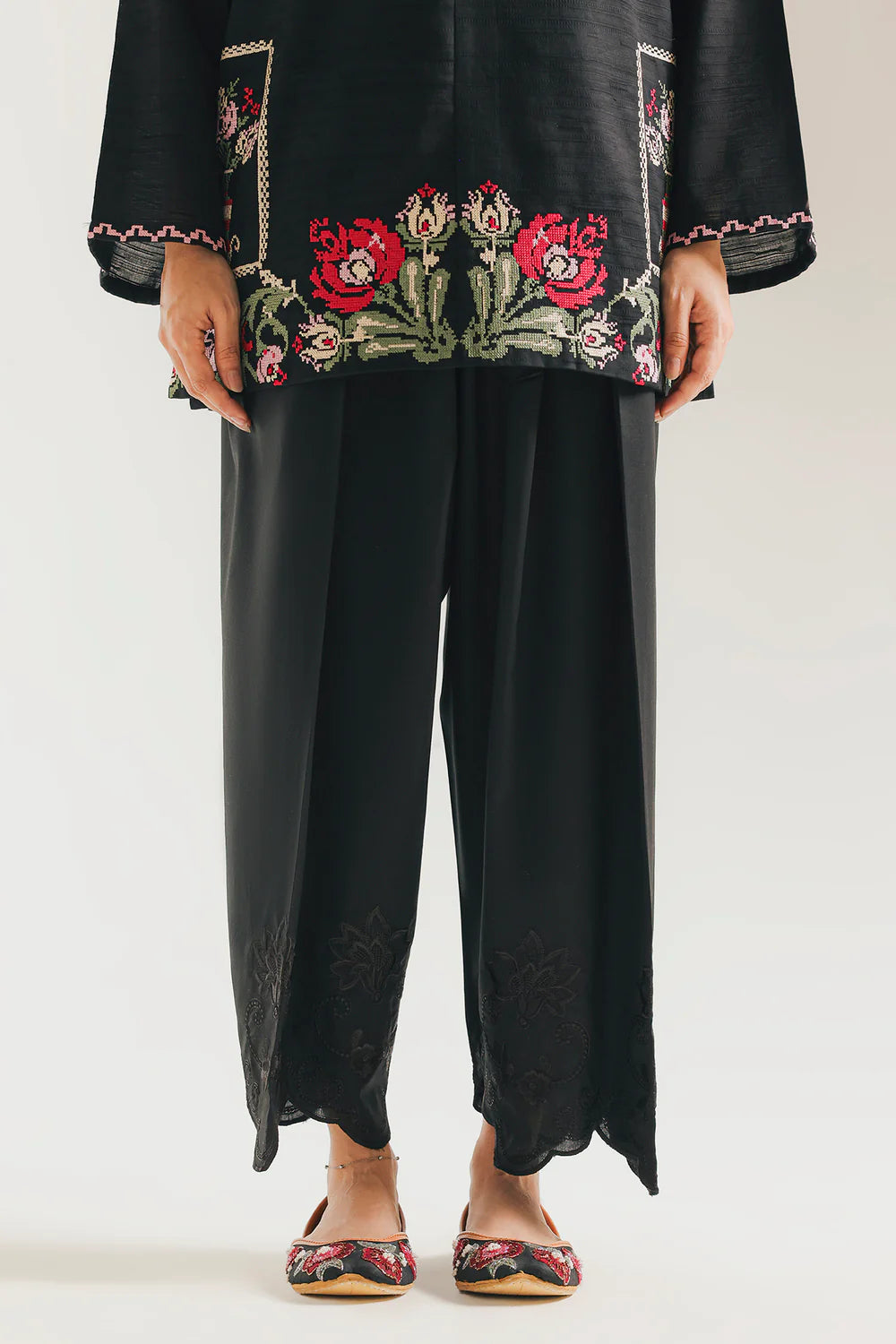 rendered in a deep black hue, offering a refined and versatile addition to any wardrobe. The design features a relaxed, wide-leg silhouette that is elevated by a modern high-low, scalloped hemline. Delicate tone-on-tone embroidery, featuring intricate floral and leaf motifs, accents the borders, providing a subtle yet artistic touch to the premium fabric.