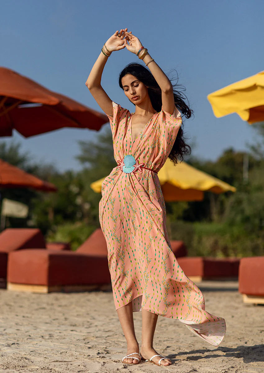 Set against a warm coral-peach base, the kaftan is printed with climbing vine motifs in fresh jade green, creating a soft yet striking contrast. The result? A beachside essential that’s equal parts laidback and luxe.