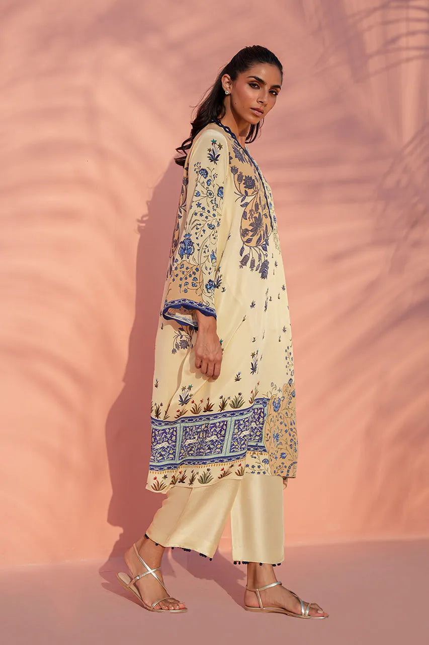 A relaxed crepe shirt in soft cream tones is brought to life with intricate botanical motifs in deep azure. The silhouette features fluid lines and wide sleeves, accented with contrasting scalloped borders and a patterned neckline for subtle definition. Finished with a statement printed hem panel, the design balances ease with visual depth. Paired with matching pure rawsilk culottes detailed with soft pleats, the look feels effortlessly composed.