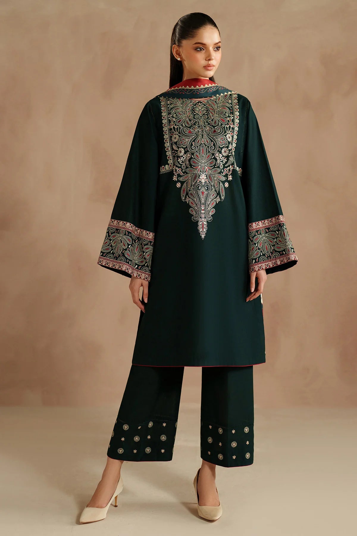 This expertly crafted ensemble features richly embroidered Khaddar on the front and sleeves, complemented by intricately detailed embroidered Khaddar sleeves and a refined bottom border. The back and bottom panels are made from dyed Khaddar, adding depth and texture. Completing the set is an embroidered viscose twill shawl that offers softness and visual elegance, making this outfit perfect for sophisticated occasions and comfortable wear.