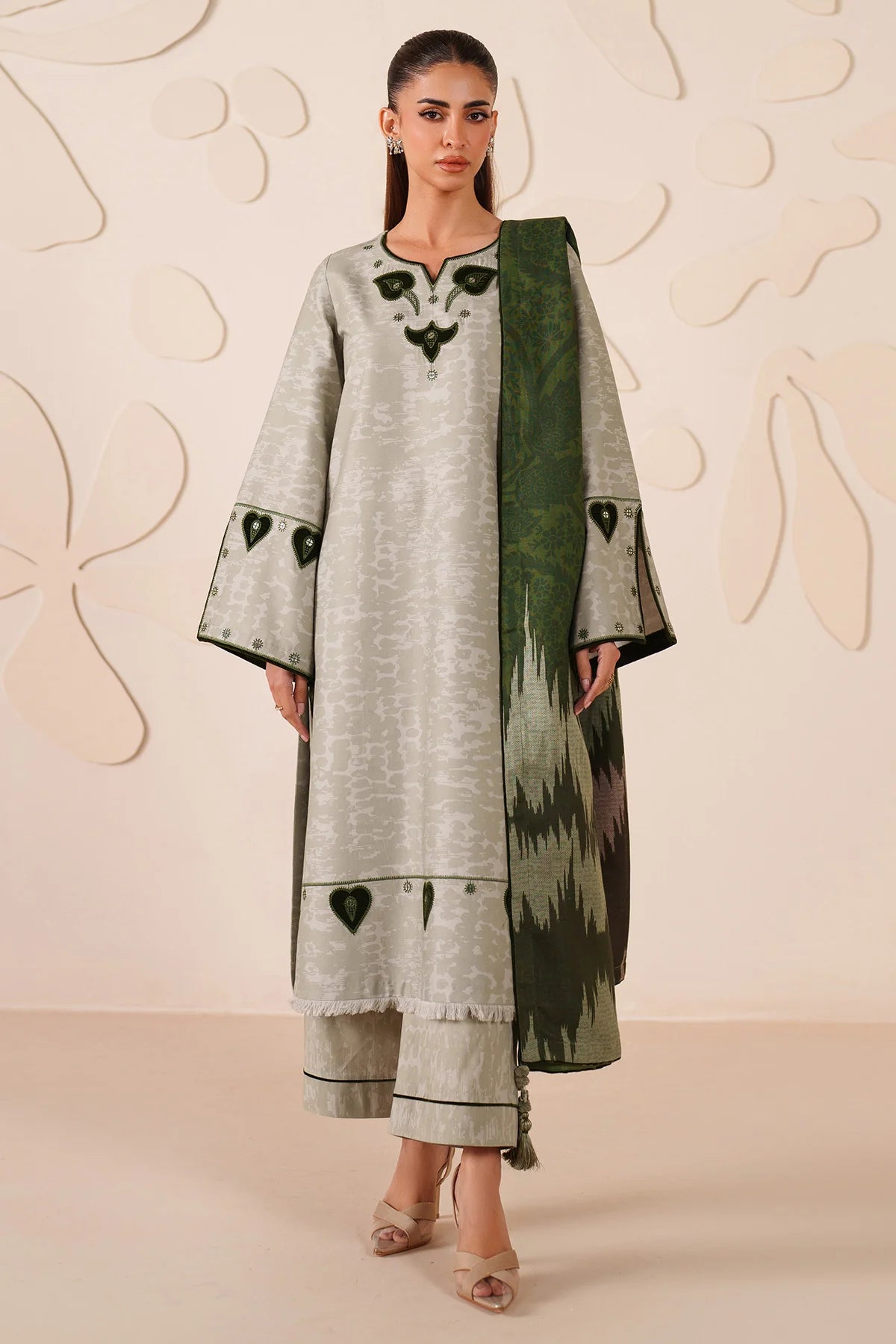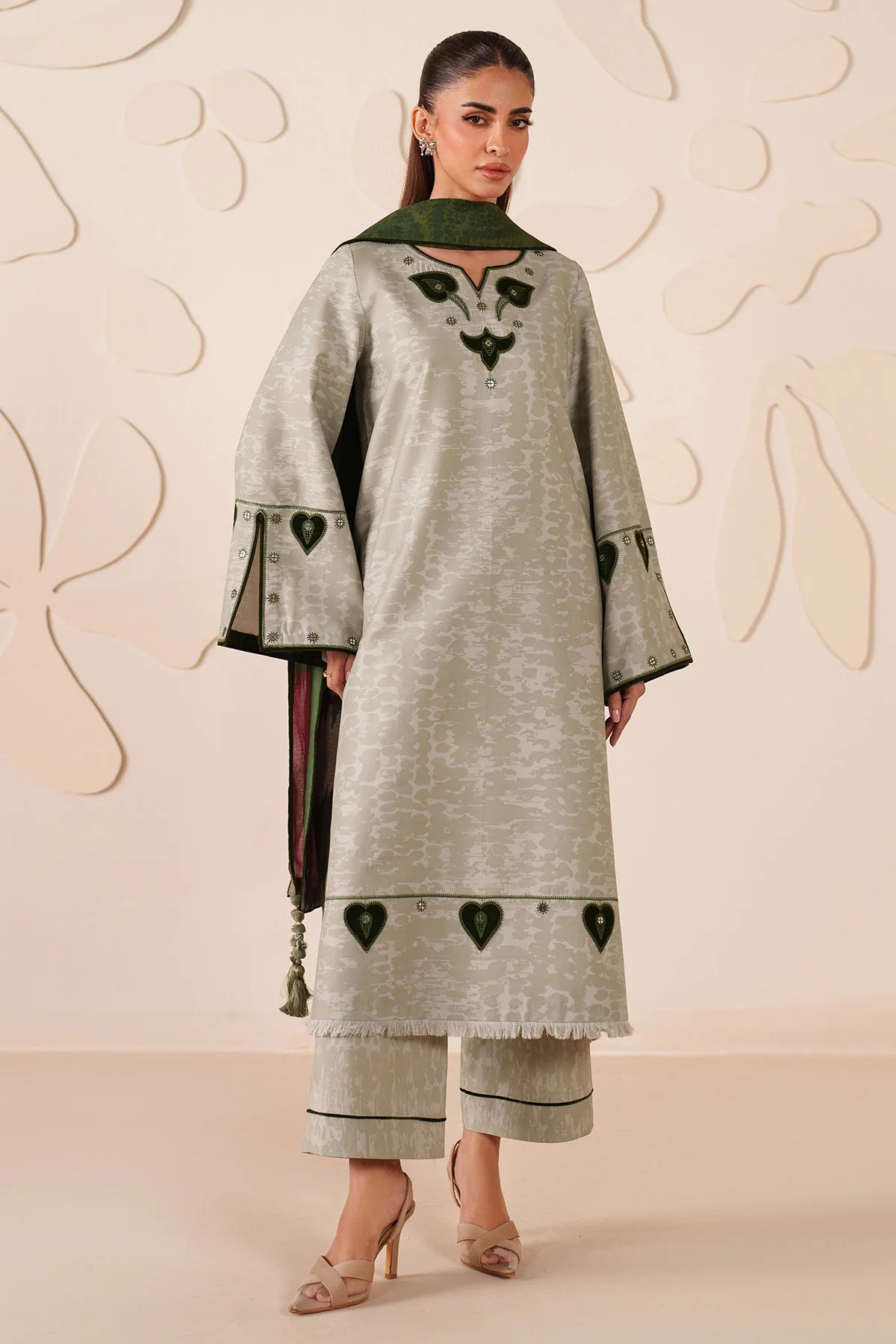 This elegant outfit features an embroidered premium viscose front and sleeves, showcasing refined craftsmanship and luxurious texture. The digitally printed viscose back and bottom add a modern, stylish contrast. Finished with a digital printed pashmina shawl, the ensemble offers a perfectly balanced, sophisticated look.