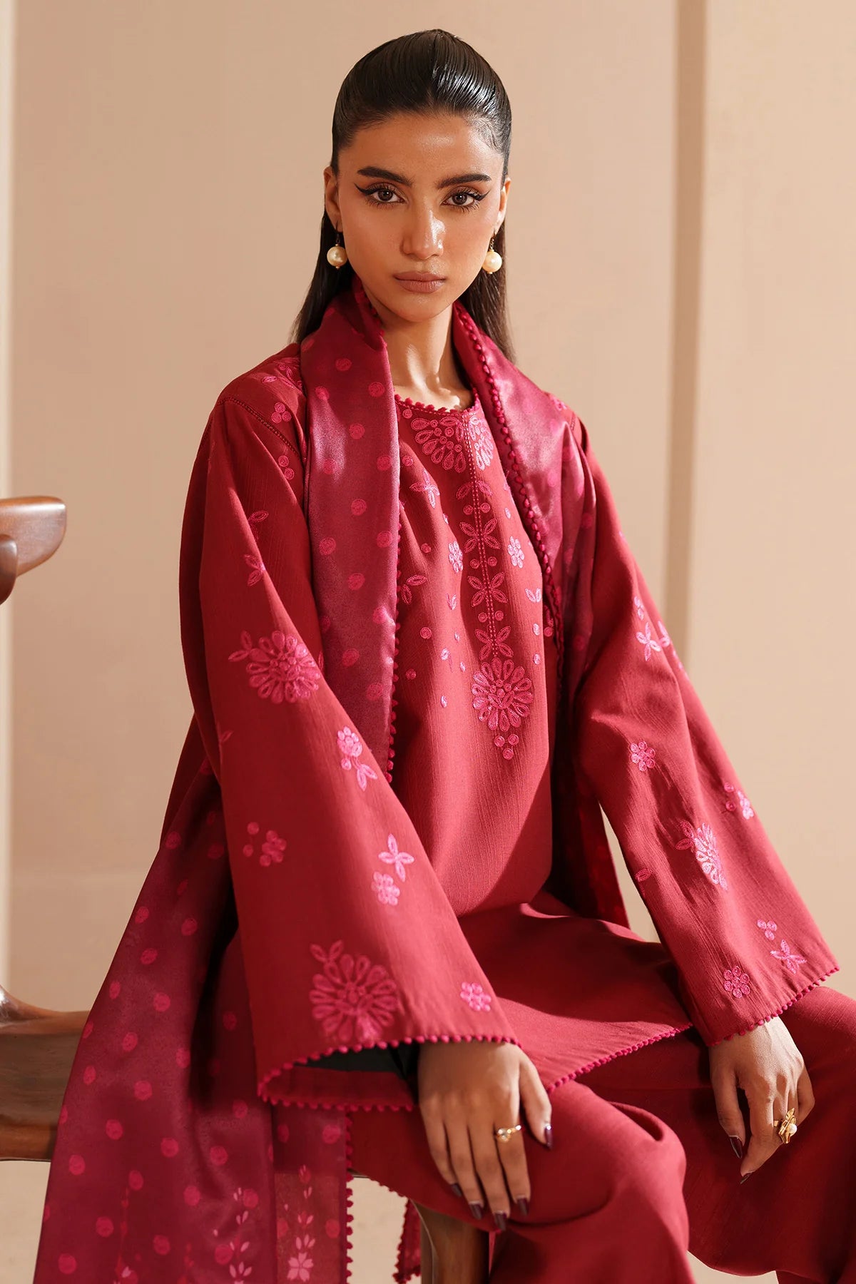 This refined winter ensemble features an embroidered premium khaddar front and sleeves, reflecting elegant craftsmanship and warmth. The dyed premium khaddar back and bottom are enhanced with an embroidered bottom border for a graceful finish. Paired with a digital printed twill viscose shawl, it completes a sophisticated and cozy seasonal look.