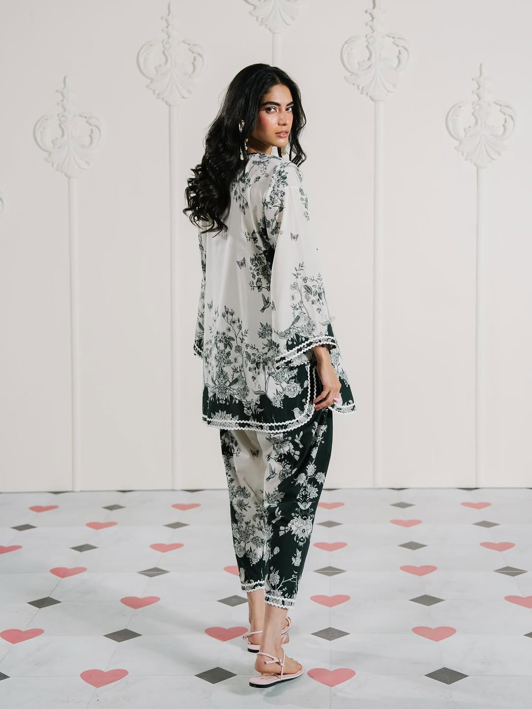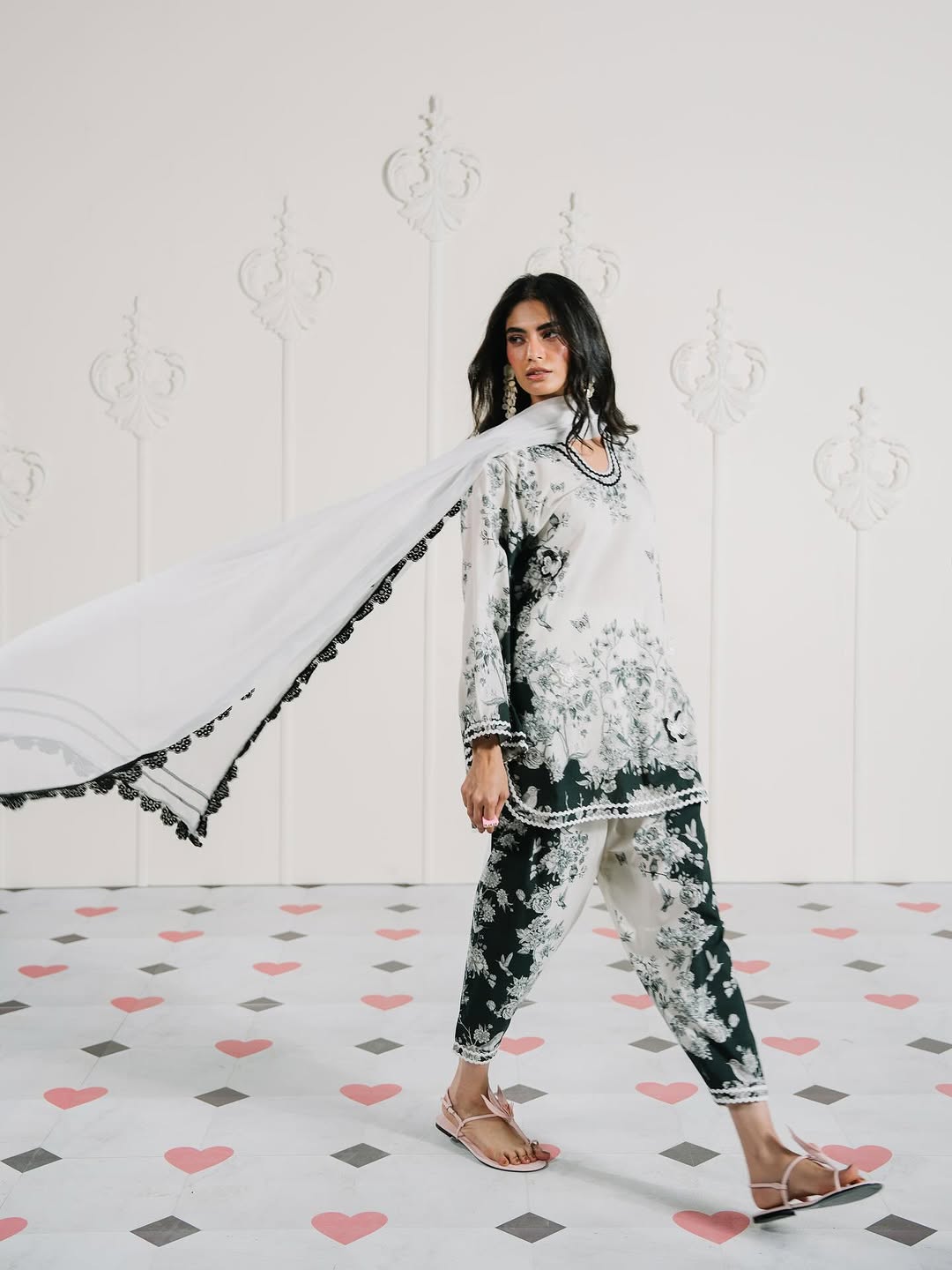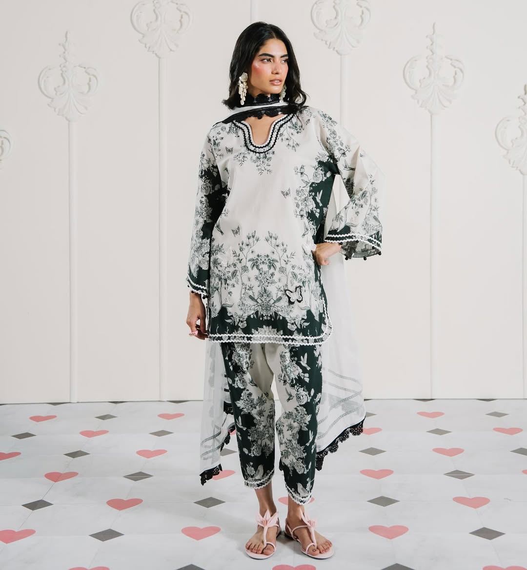 Printed lawn ensemble from our "Monochrome Marvel Collection. Paired with a contrasting dupatta embellished with laces.