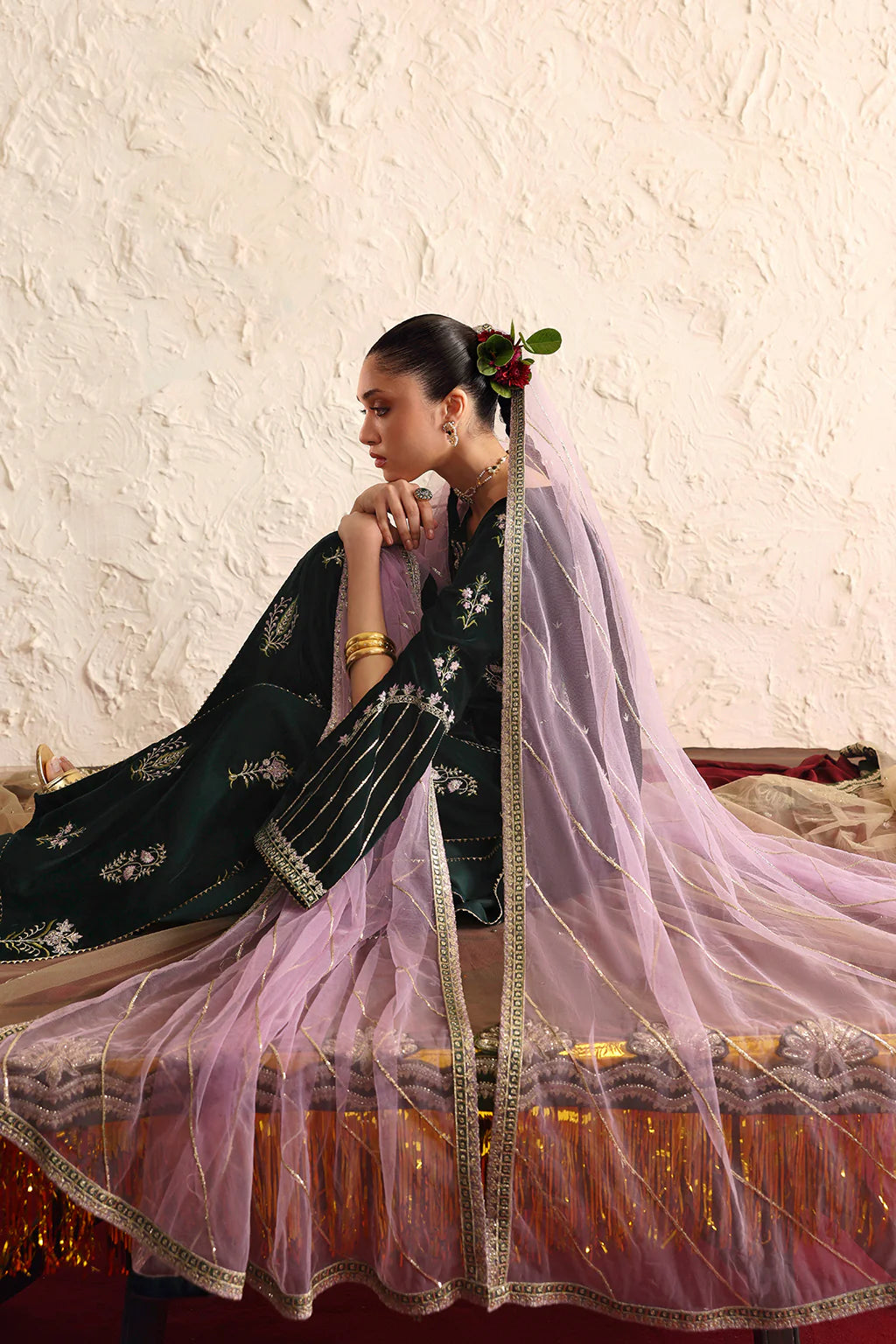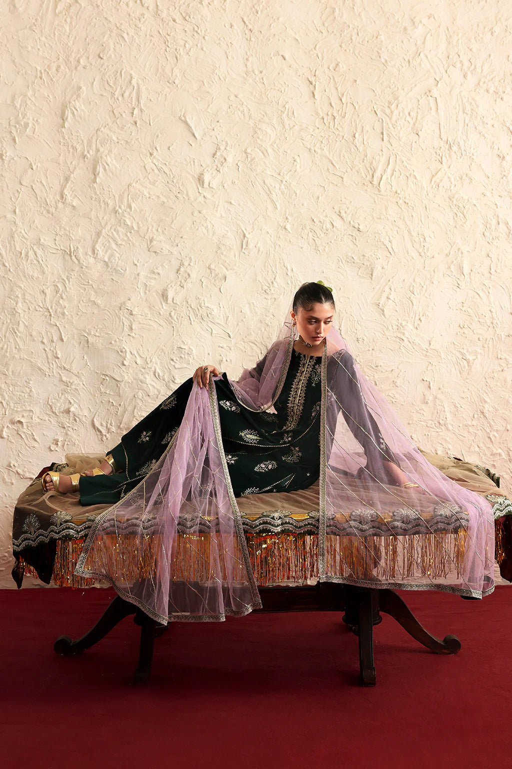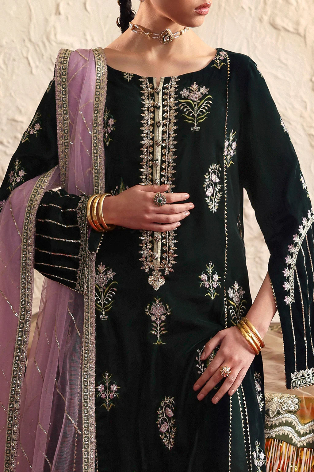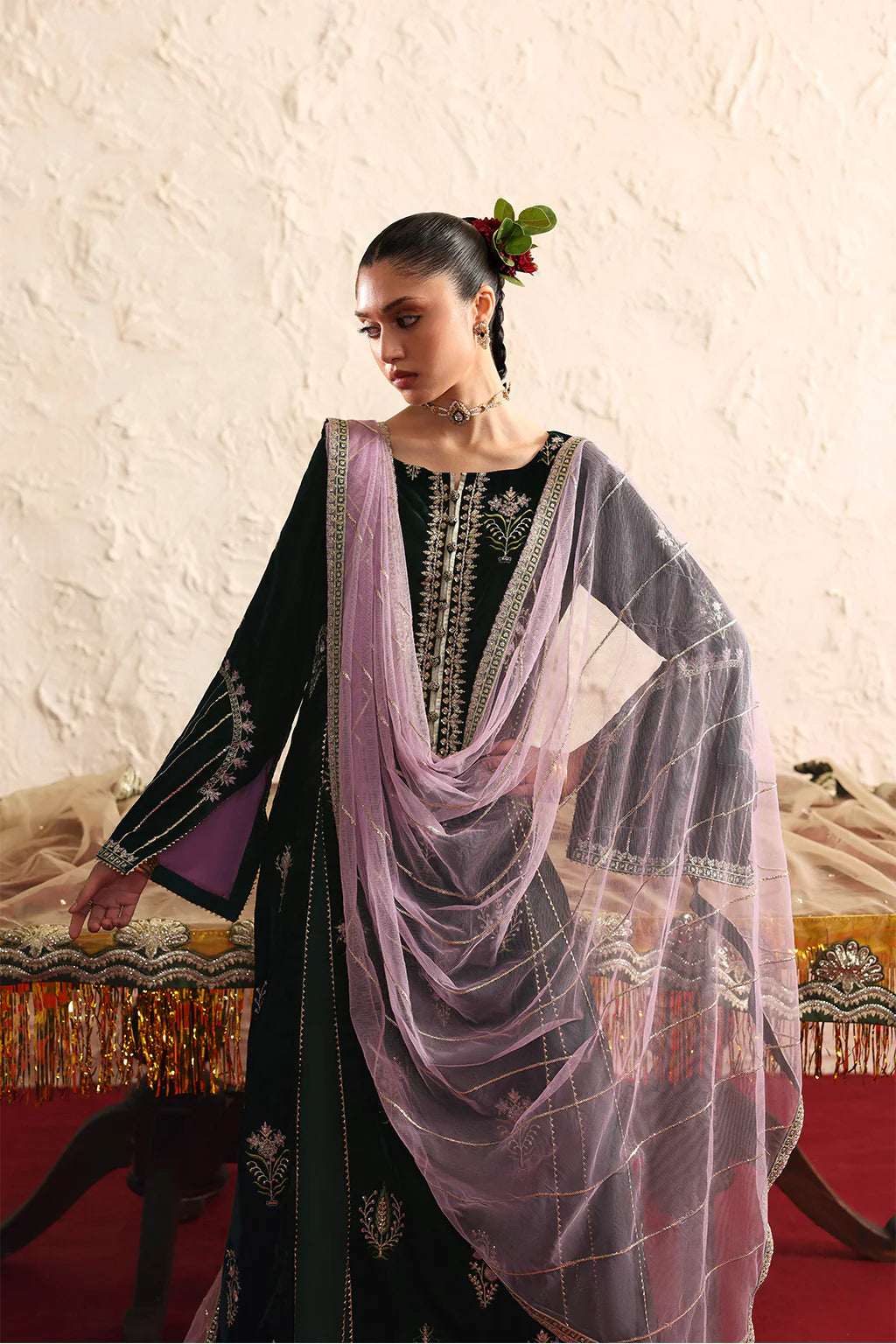 An elegant velvet shirt designed with a contemporary fusion cutline, beautifully enriched with a harmonious blend of embroidery and adda work that adds depth and intricacy to the entire ensemble. The look is completed with a contrasting, delicately embroidered net dupatta and flared pants, creating a regal yet modern silhouette perfect for festive and formal occasions.