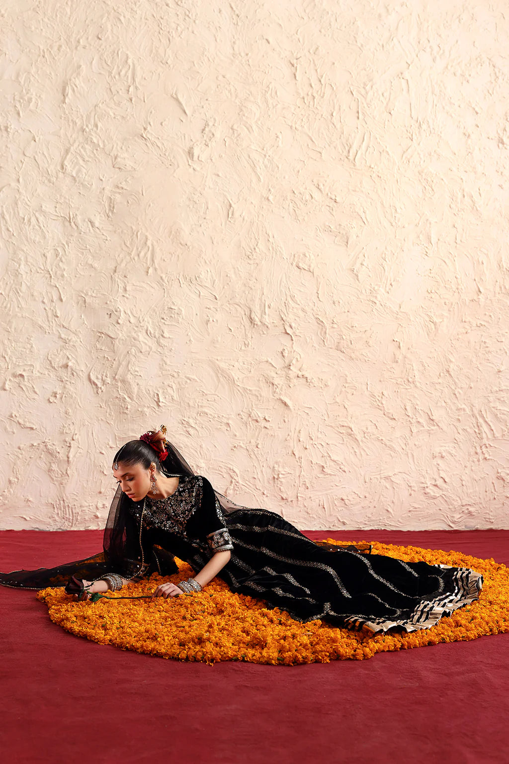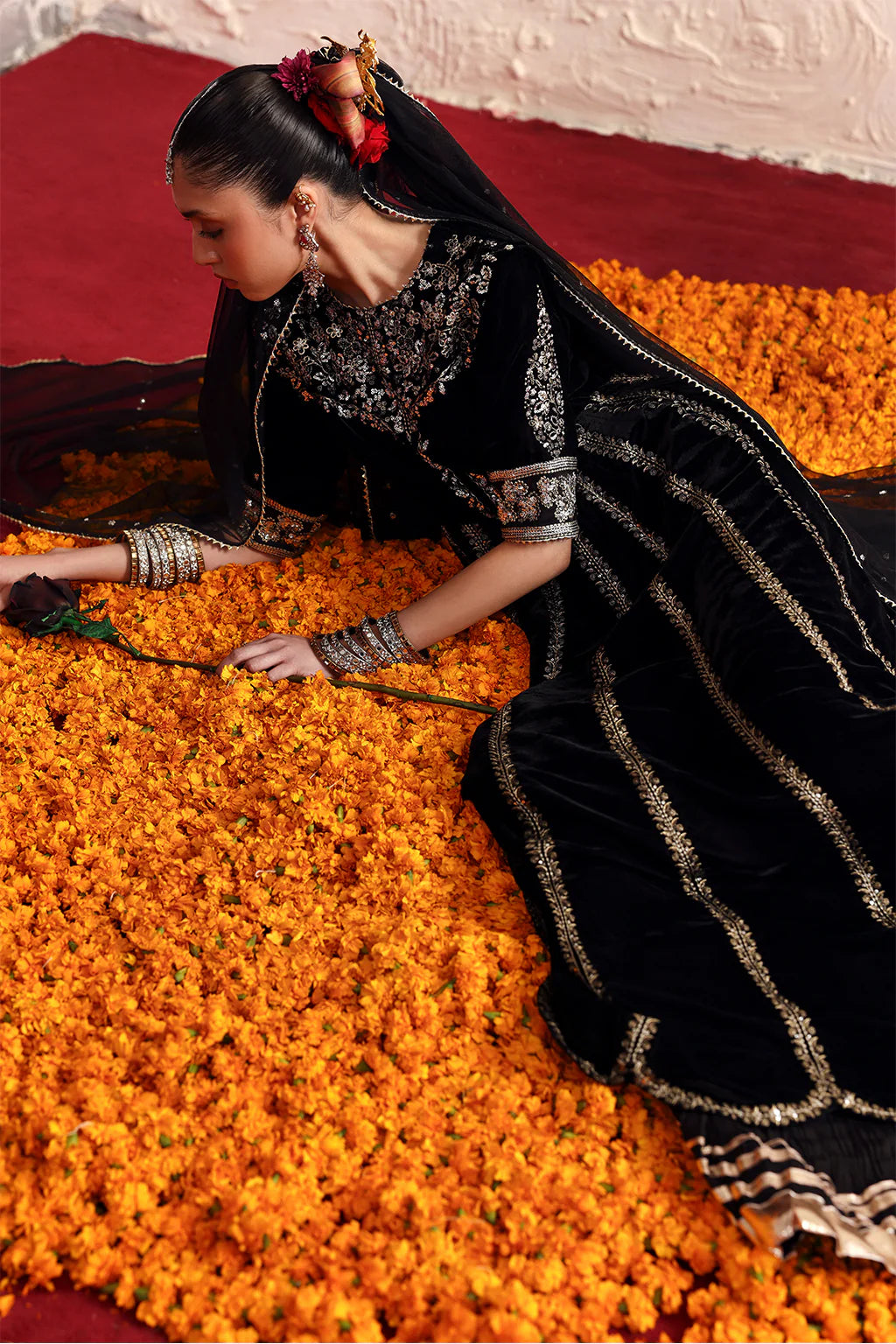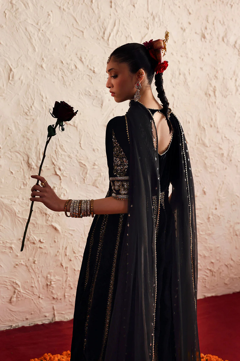 A luxurious velvet peshwas featuring intricate silver embroidery flows gracefully with its rich fall. It is paired with a delicate net dupatta adorned with matching embroidered details.