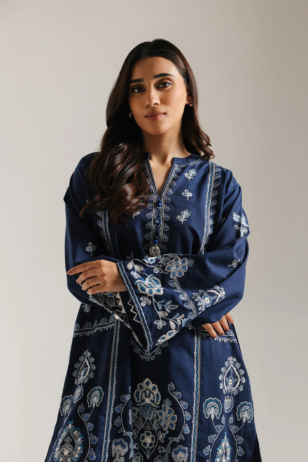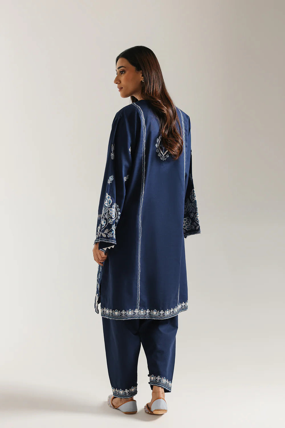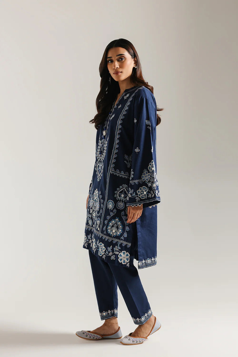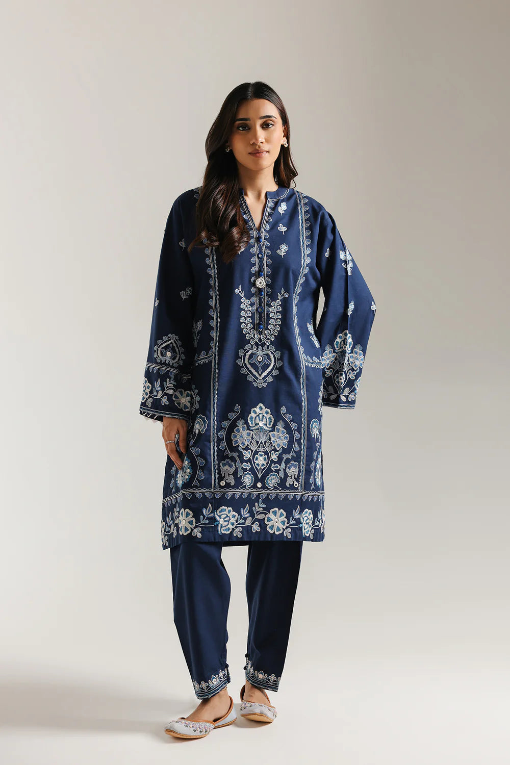 Dive into the rich heritage of craftsmanship with this stunning indigo blue embroidered suit. The straight-cut kurta is a masterpiece of intricate artistry, featuring dense traditional embroidery in contrasting white and light blue threads that covers the entire front, sleeves, and neckline. The embroidery forms beautiful floral, stylized geometric, and paisley patterns, creating a mesmerizing visual flow. The ensemble is perfectly completed by comfortable, solid indigo shalwar that feature matching detailed embroidery at the hem, resulting in an elegant and deeply traditional outfit.