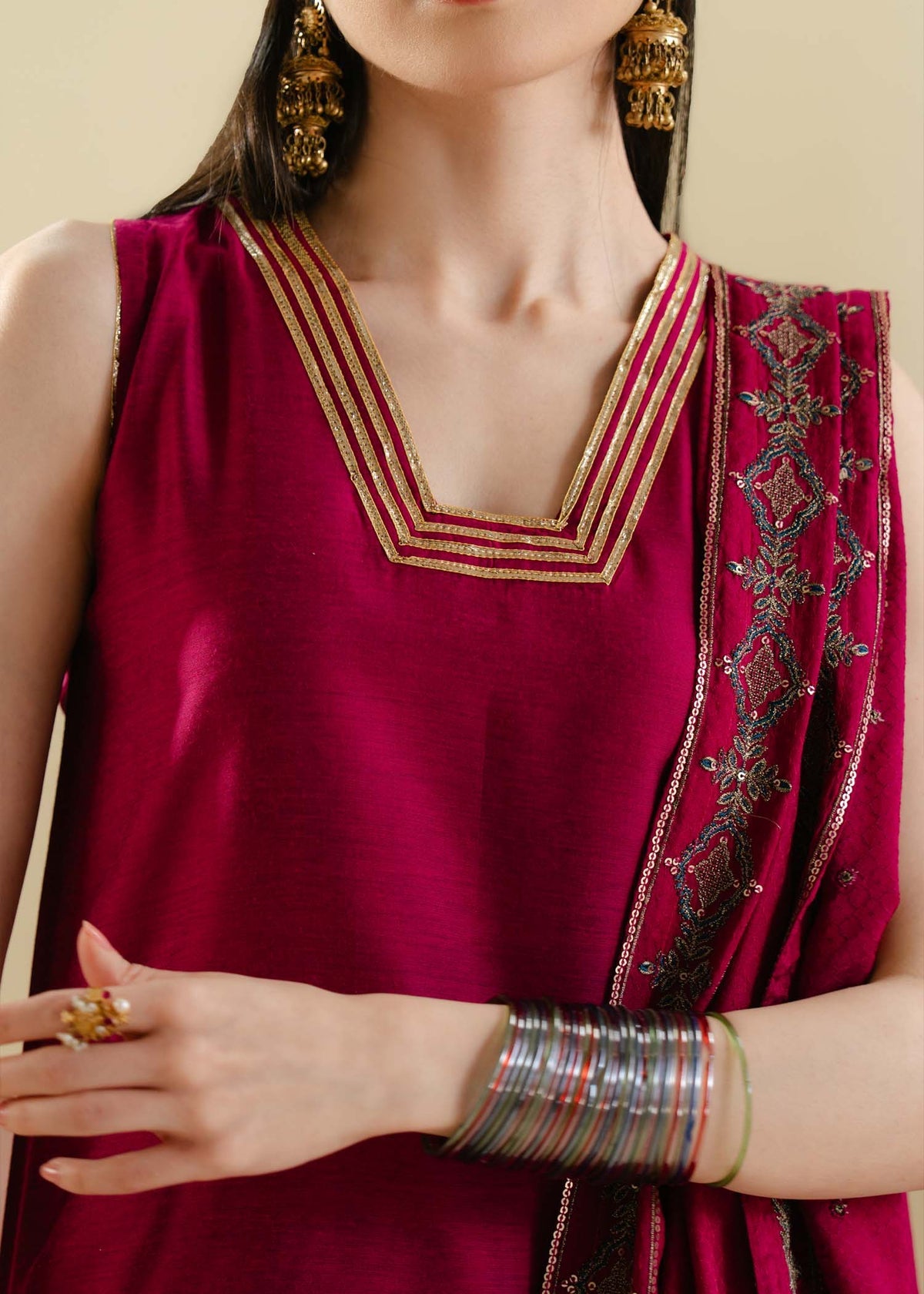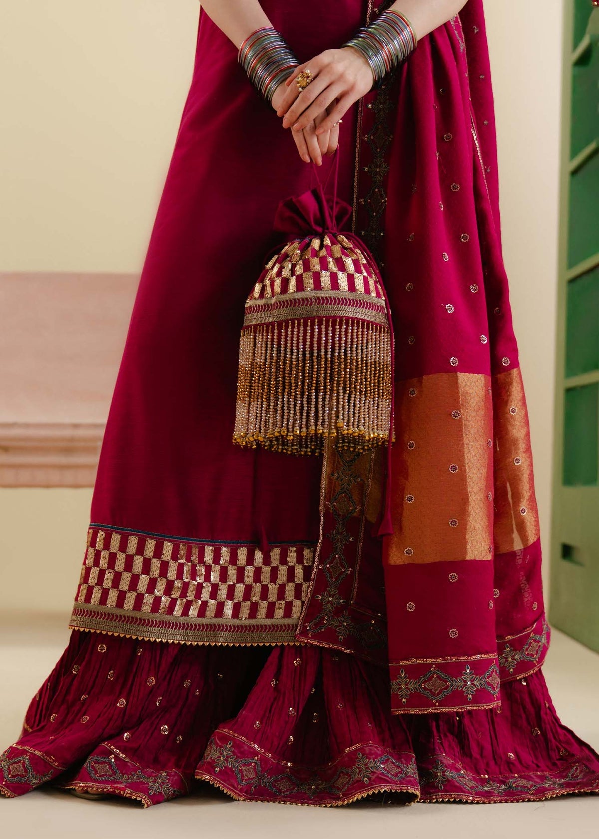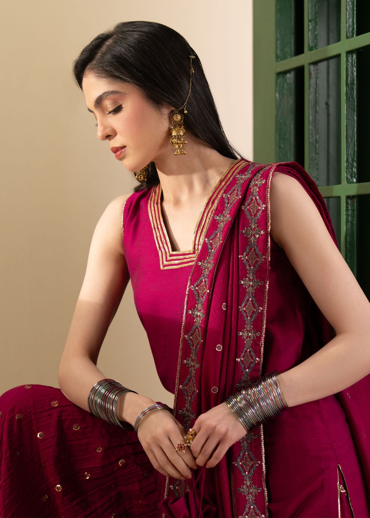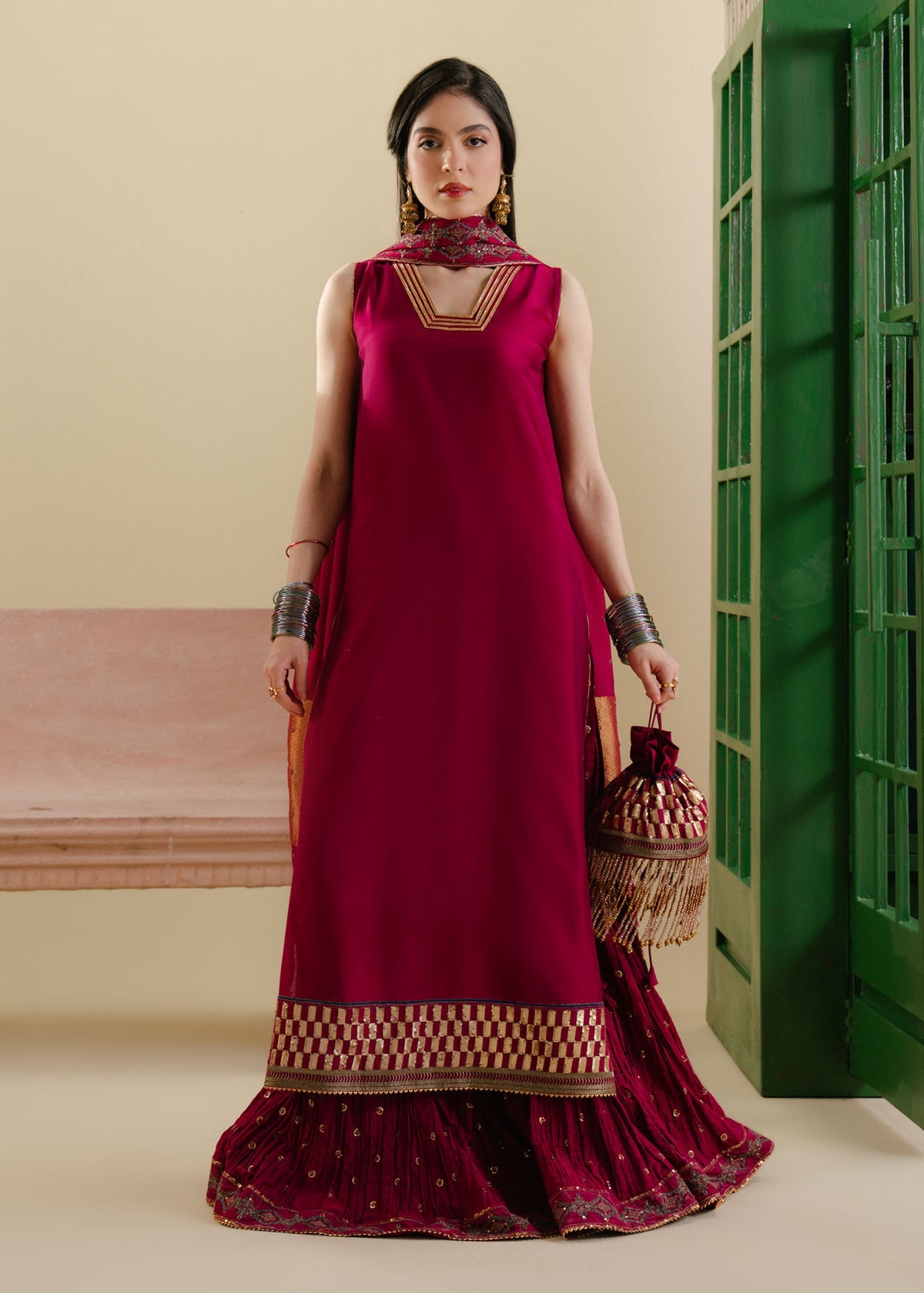 This look features a long qameez with delicate embroidered borders. Paired with a crushed embroidered sharara for a graceful silhouette and a cotton-jacquard dupatta with intricate embroidery borders.