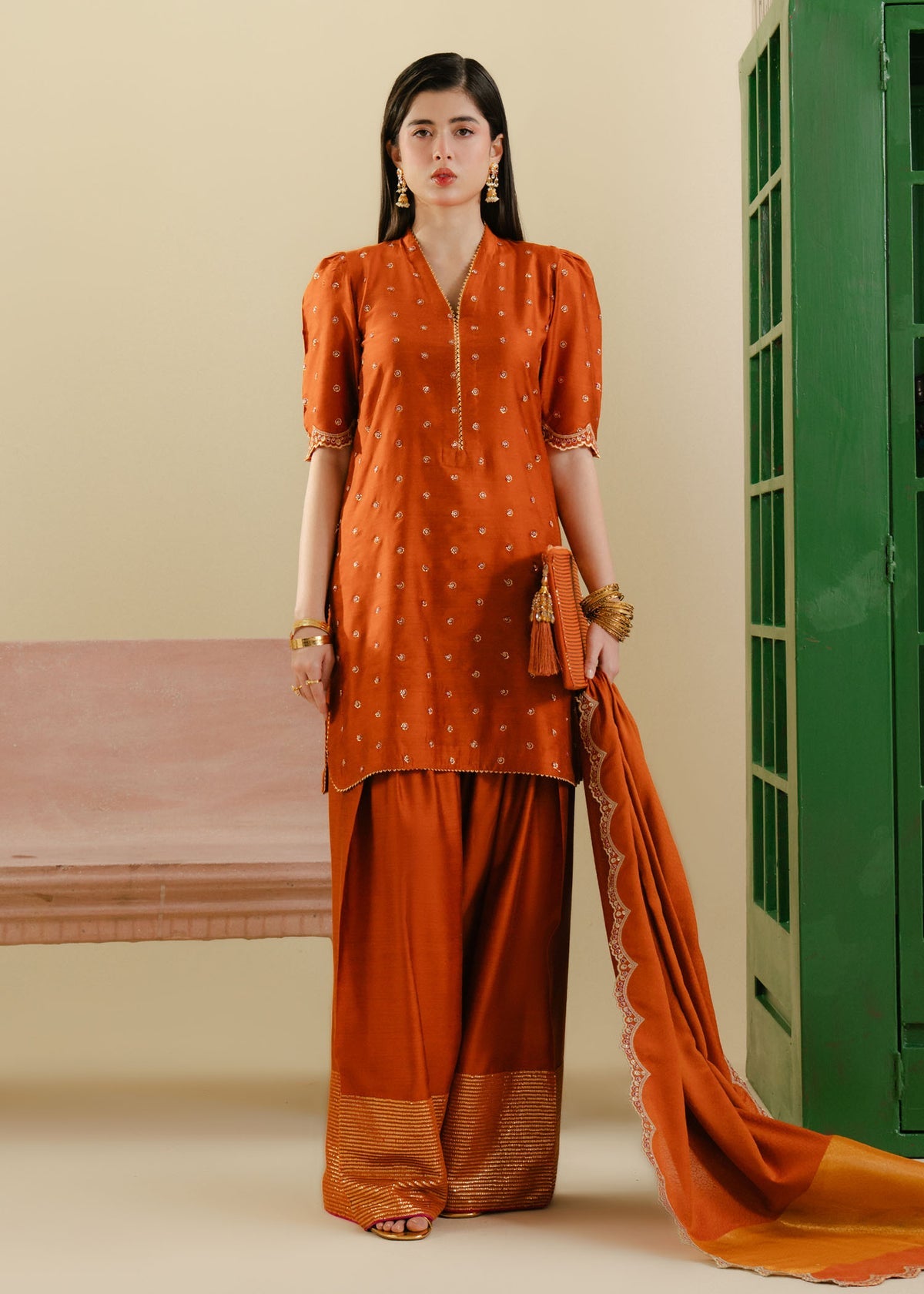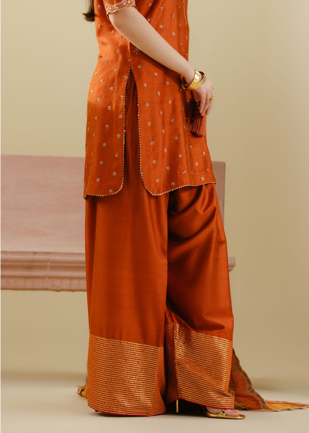 A delicately embroidered kurta with elegant scalloped sleeves, paired with a classic white farshi shalwar featuring intricate borders wihout duppata. Finished with timeless festive look.