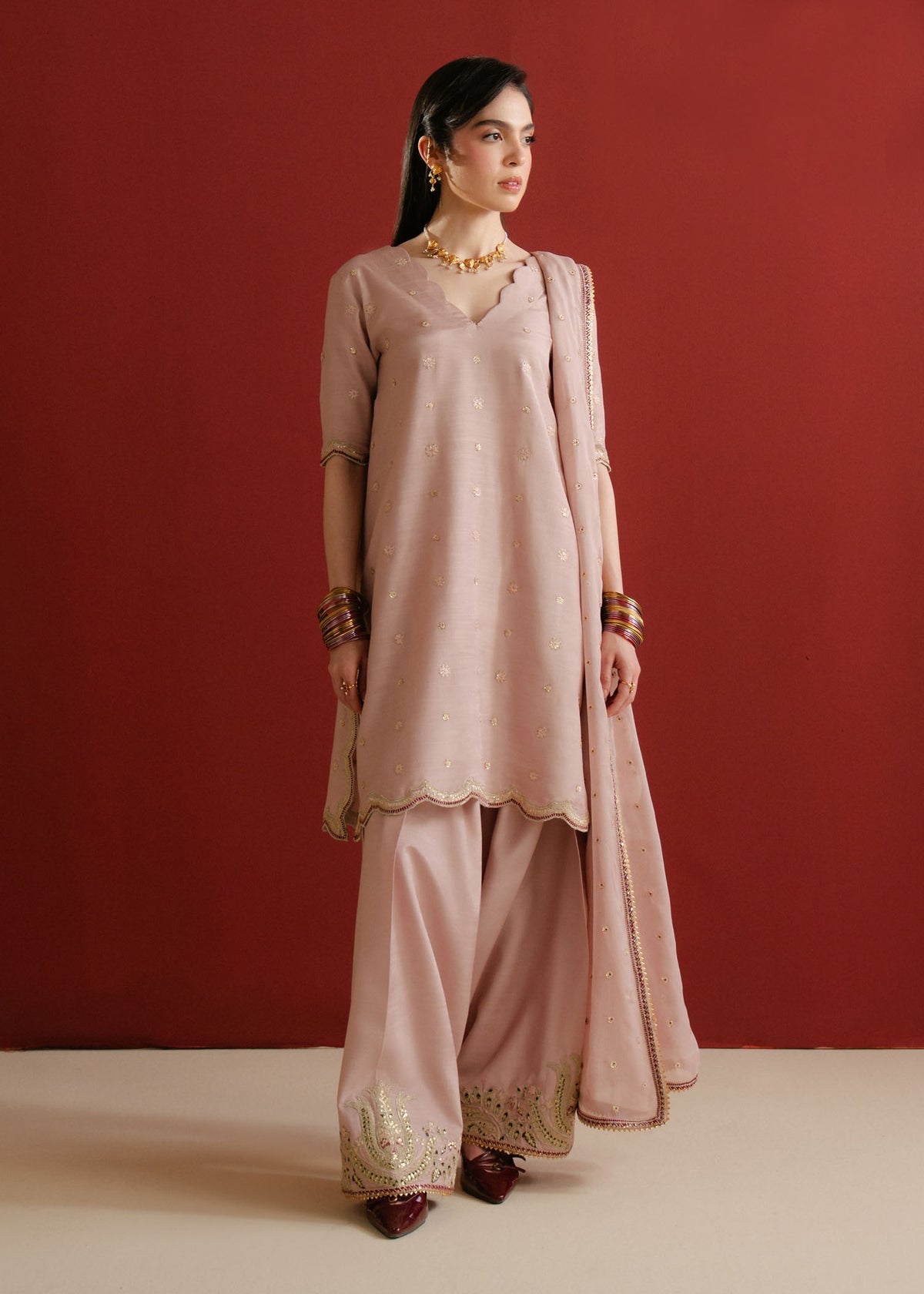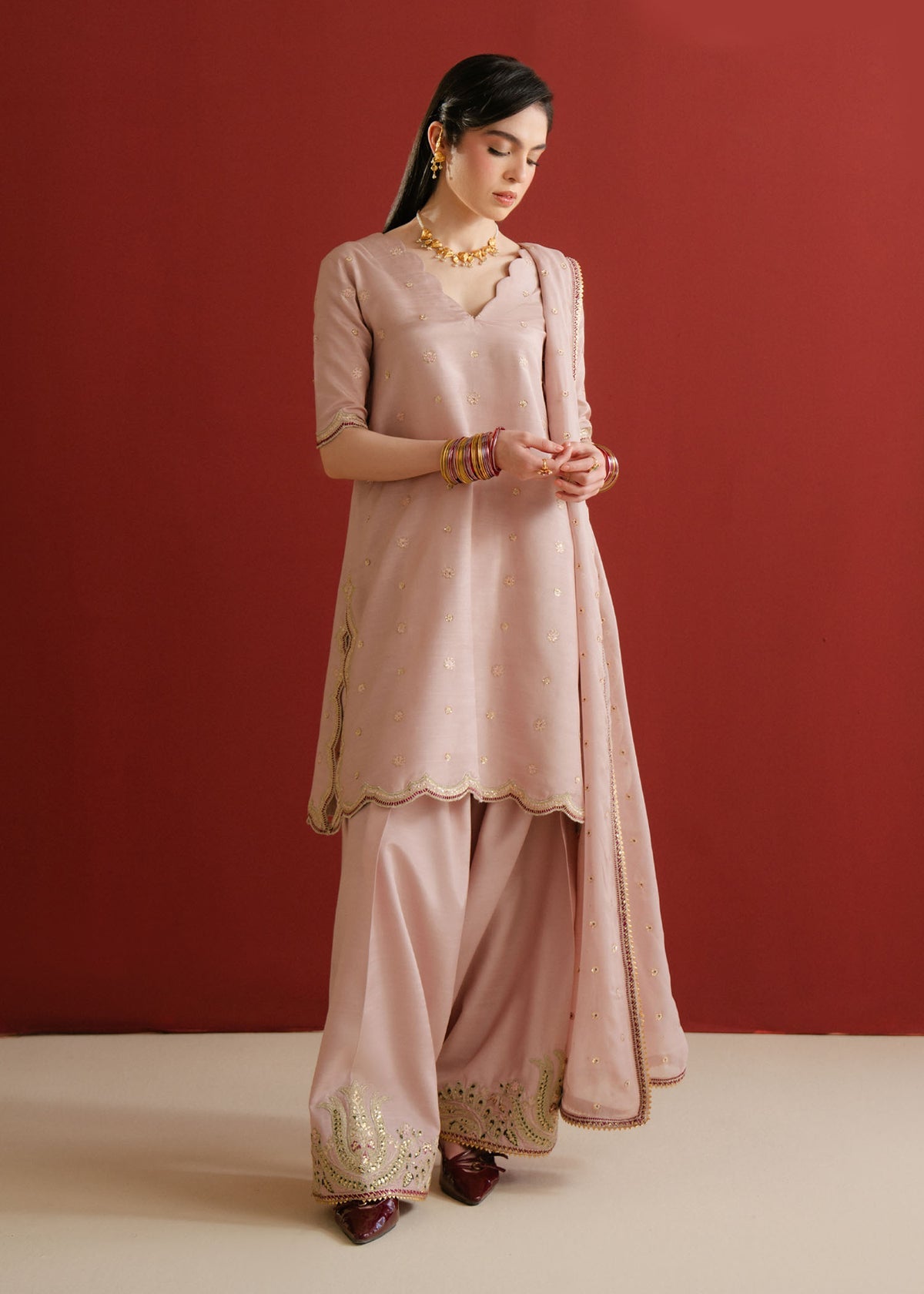 A classic yet effortless look—this short qameez features a scalloped V-neckline and half sleeves, paired with a beautifully embroidered farshi shalwar. The airy chiffon dupatta adds the perfect finishing touch.