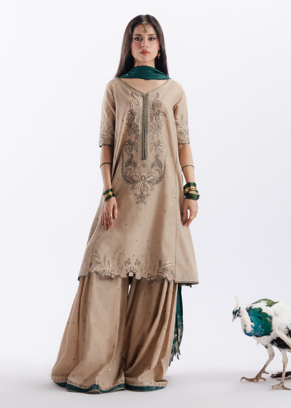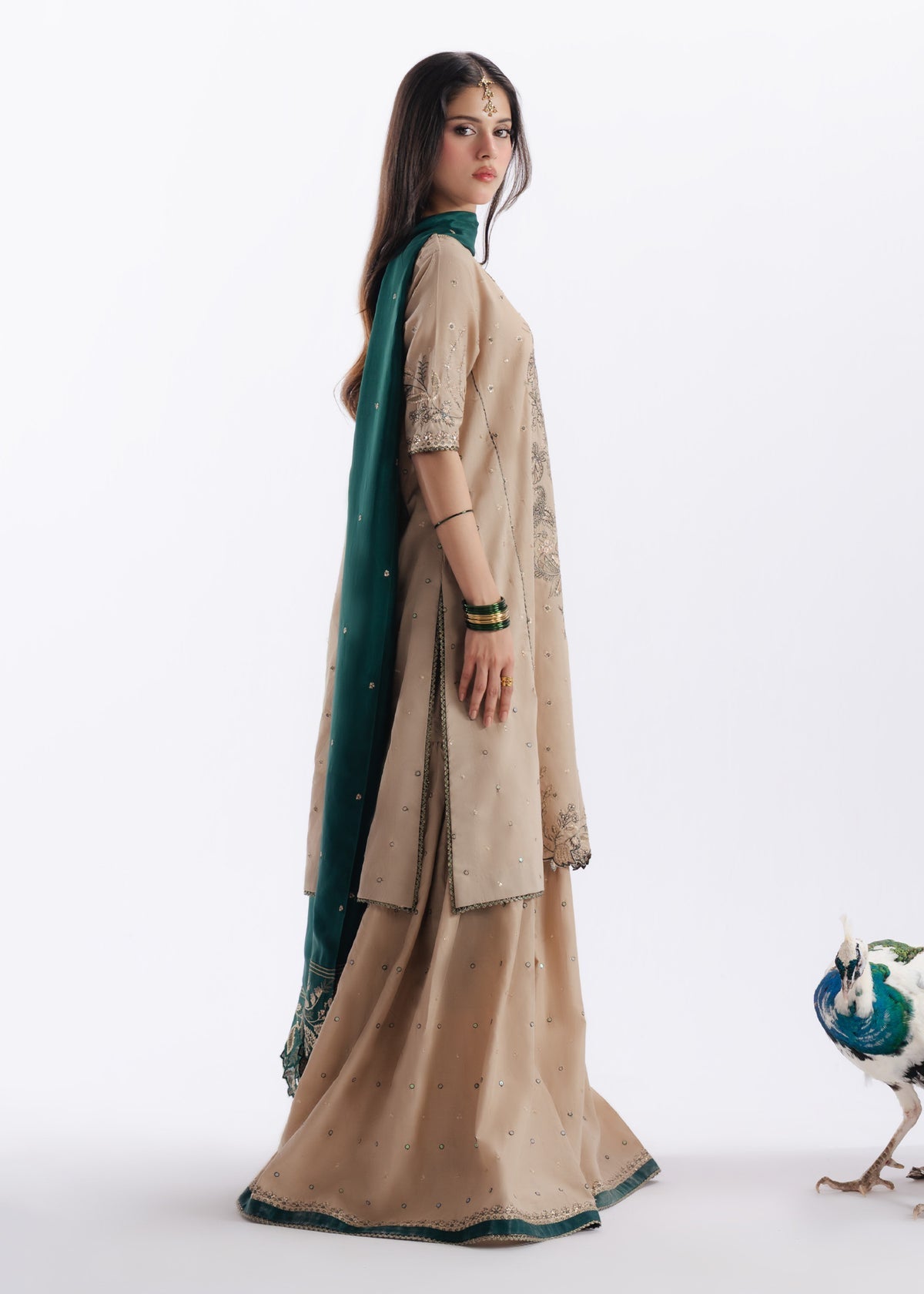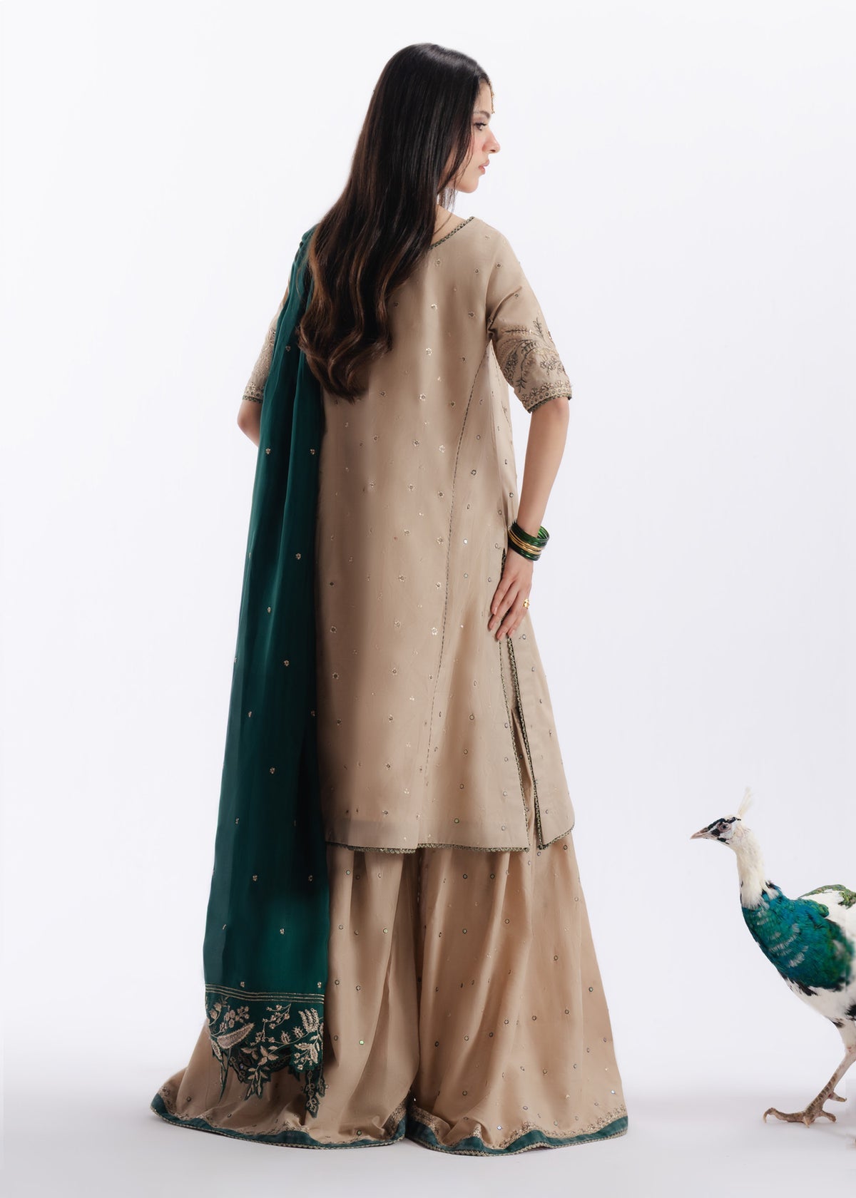 A beautifully embroidered shirt with elegant half sleeves, paired with a sharara featuring delicate embroidered borders. Completed with an intricately embroidered silk dupatta for a graceful, timeless look.