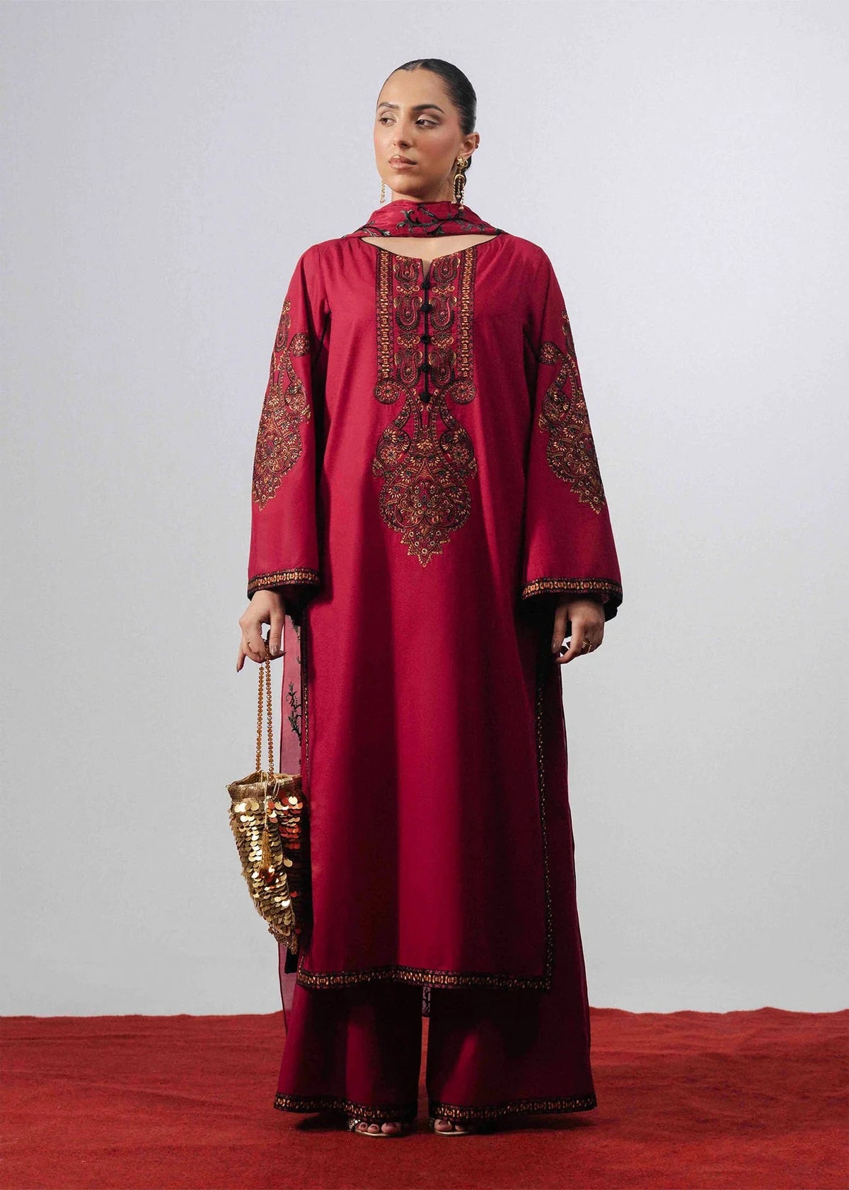 A deep fuchsia pink kurta adorned with intricate embroidery along the front and sleeves, paired with matching wide-leg trousers finished with embroidered patti at the hem. The ensemble is completed with a contrasting dupatta highlighted by rich green and black embroidery.