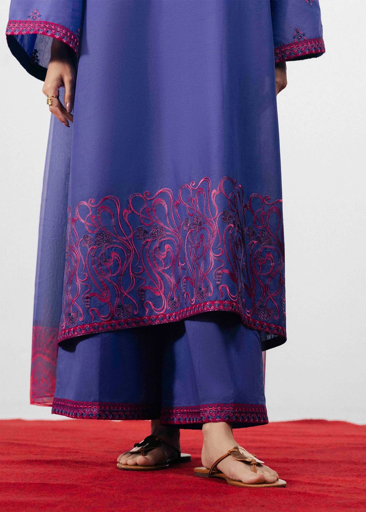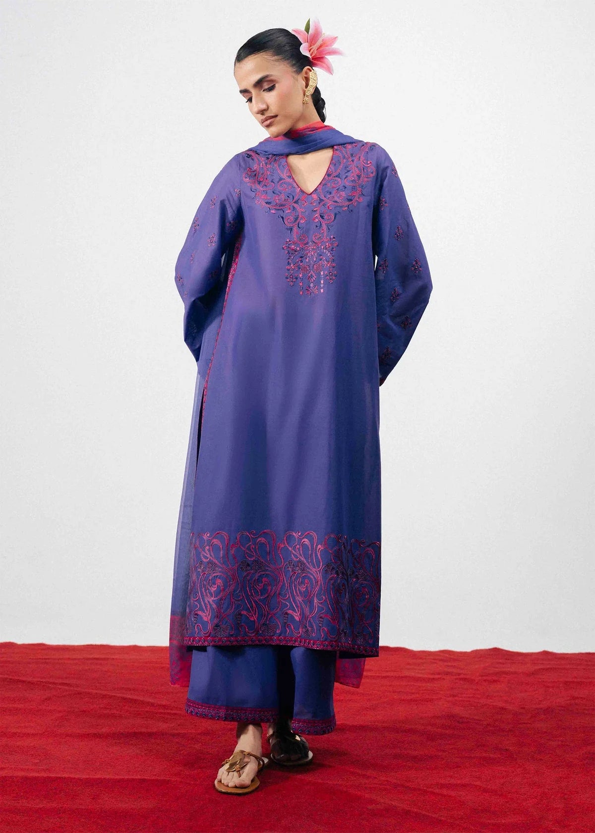 The outfit features a purple kurta accented with intricate pink embroidery across the neckline, sleeves, and hem. The flowing silhouette is enhanced with a contrasting pink appliqué patti along the side, paired with matching trousers and a coordinating printed chiffon dupatta.