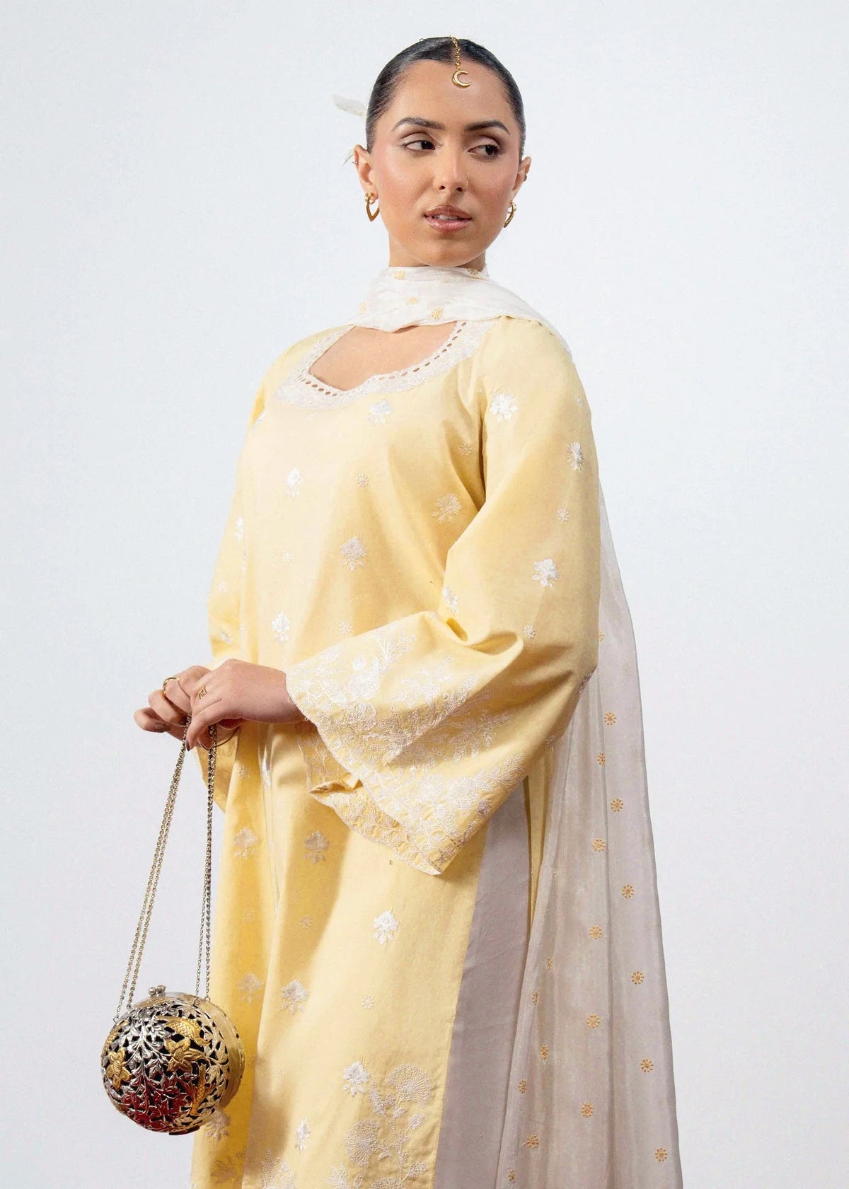 This outfit features a soft butter-yellow kurta adorned with delicate white embroidery scattered across the fabric and concentrated along the hem and sleeves. The look is paired with ivory trousers finished with cutwork embroidery, and completed with a medium silk embroidered dupatta.