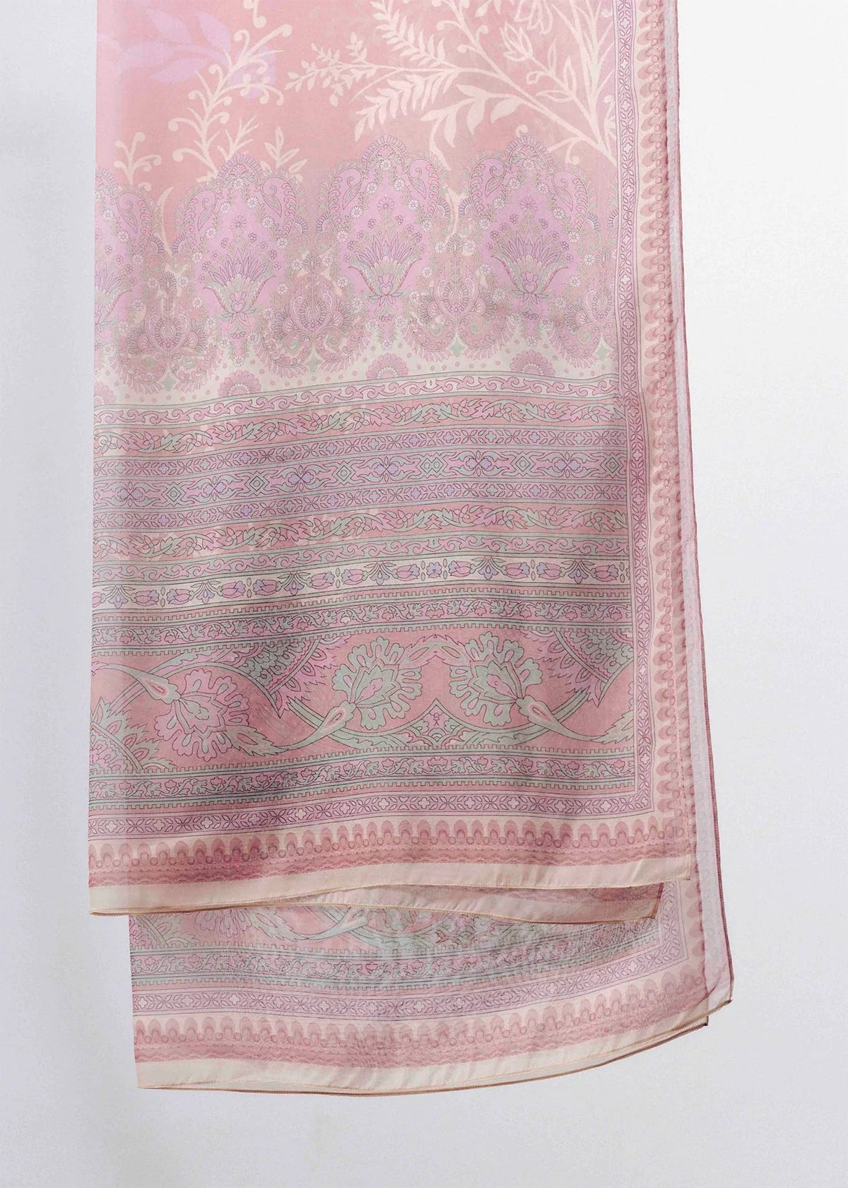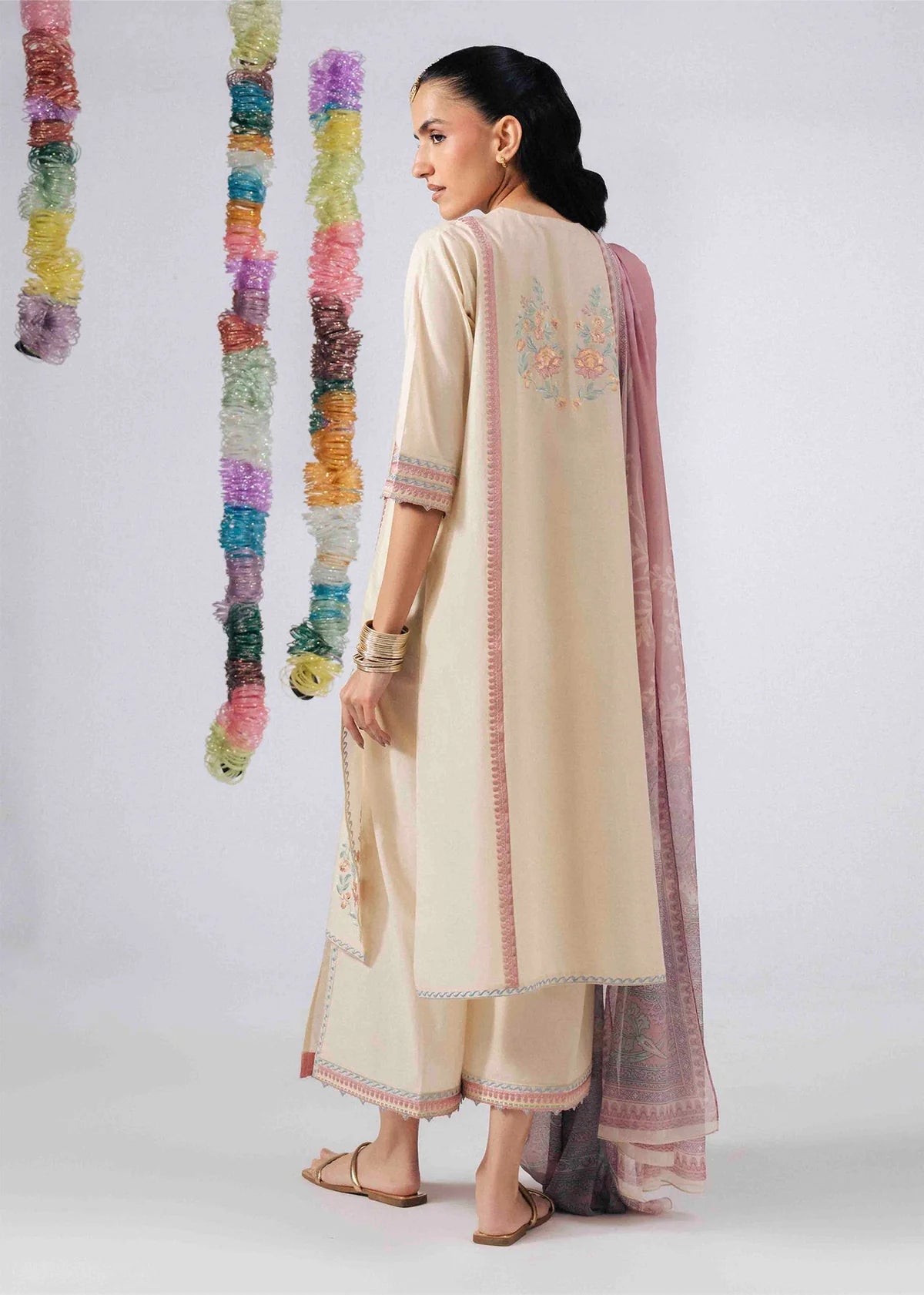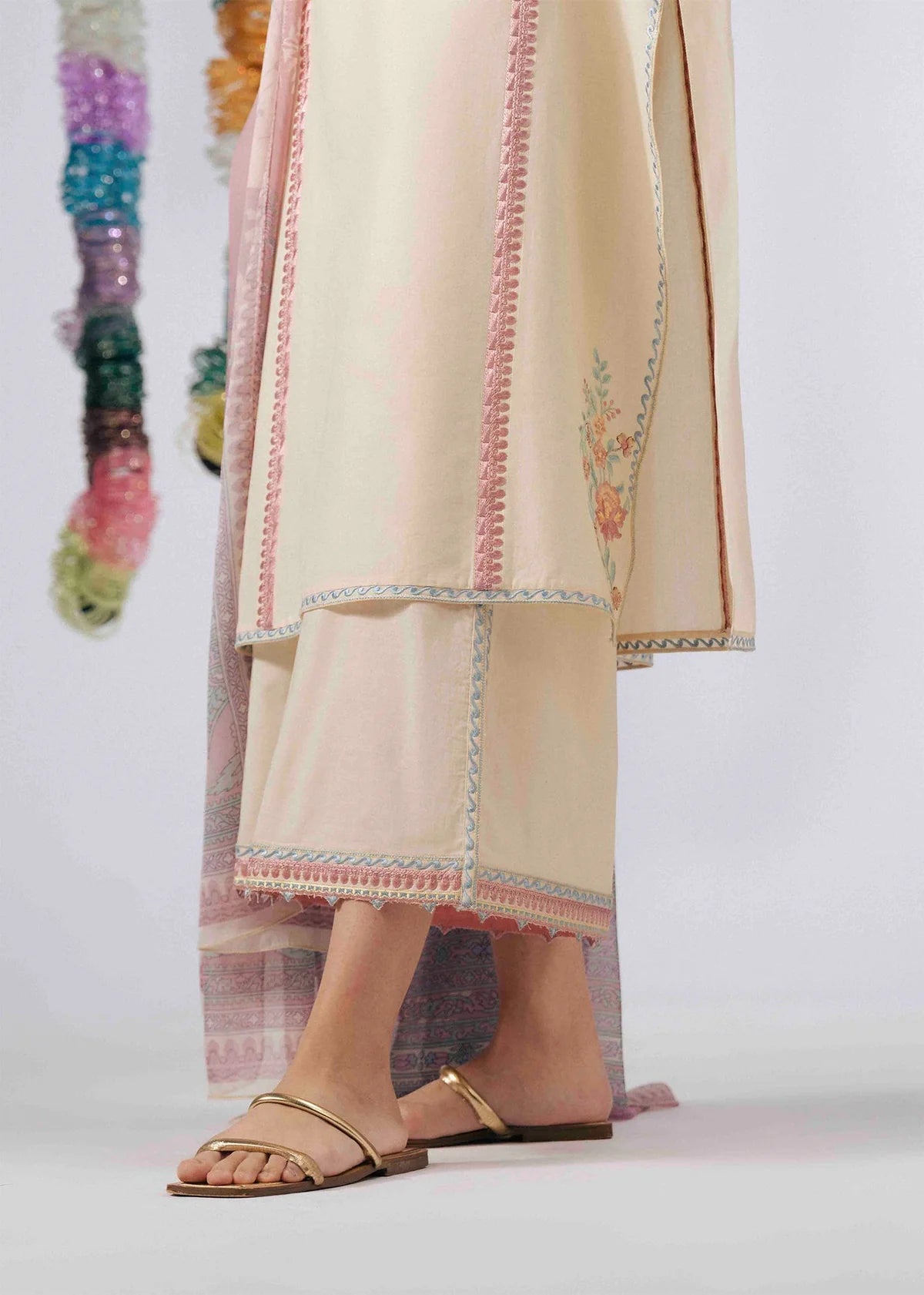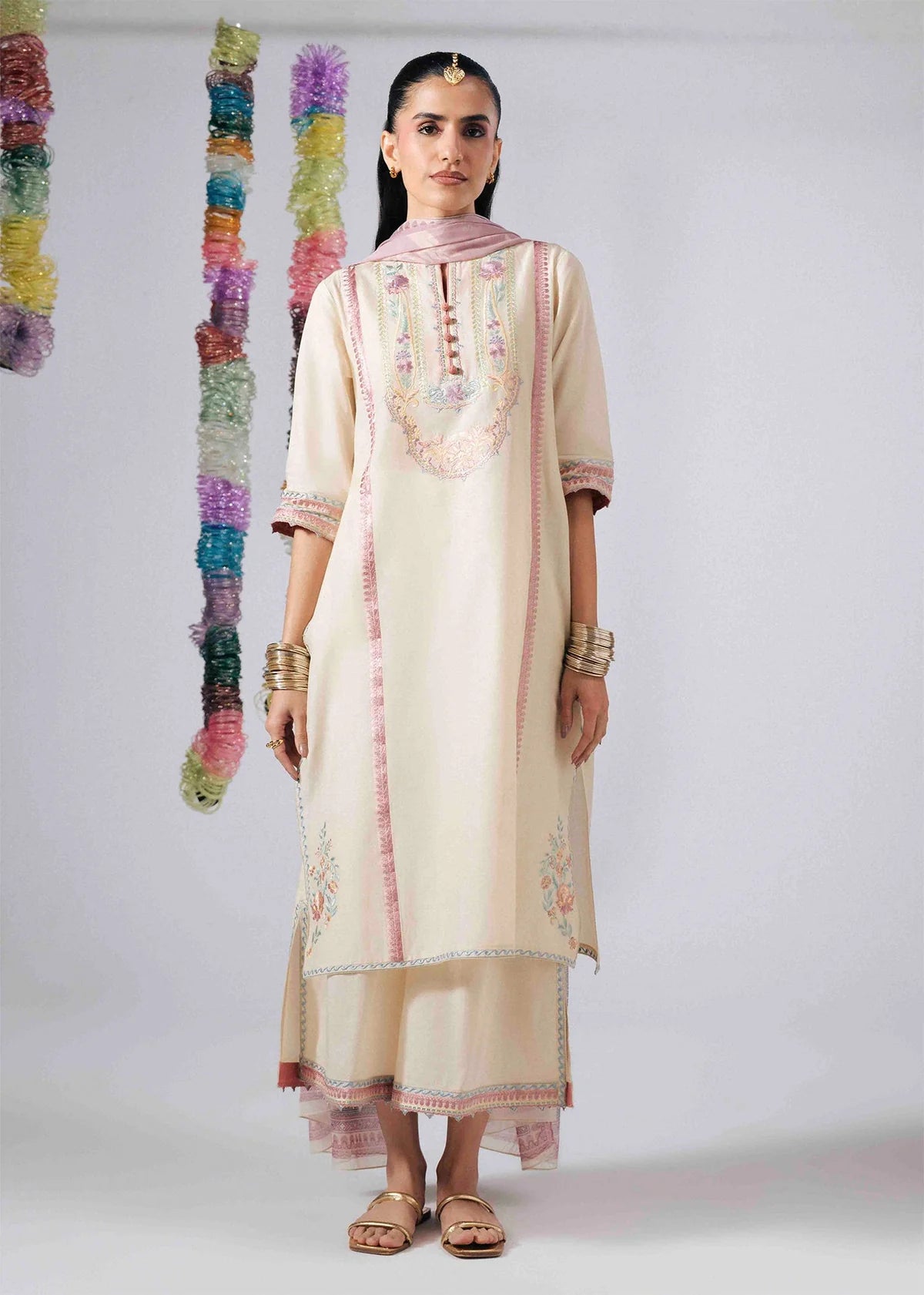 This outfit features a soft ivory kurta adorned with delicate pastel embroidery along the neckline, sleeves, and hem, accented with vertical pink patti detailing for a refined finish. Paired with matching trousers and a digital printed tissue silk dupatta.