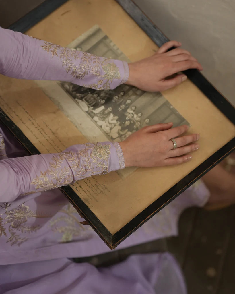This gorgeous ensemble features a lilac straight fit shirt with embroideries in the shade of pink, white, gold and green on the shirt front and all across the sleeves. It has a flattering V neckline. It is paired with a chiffon dupatta with lace details on all 4 sides and matching trousers.