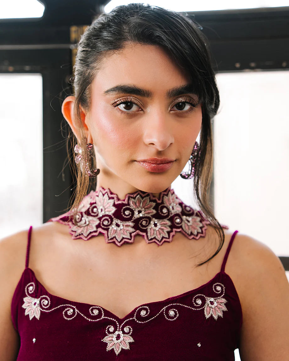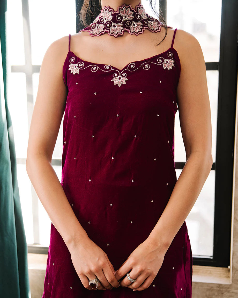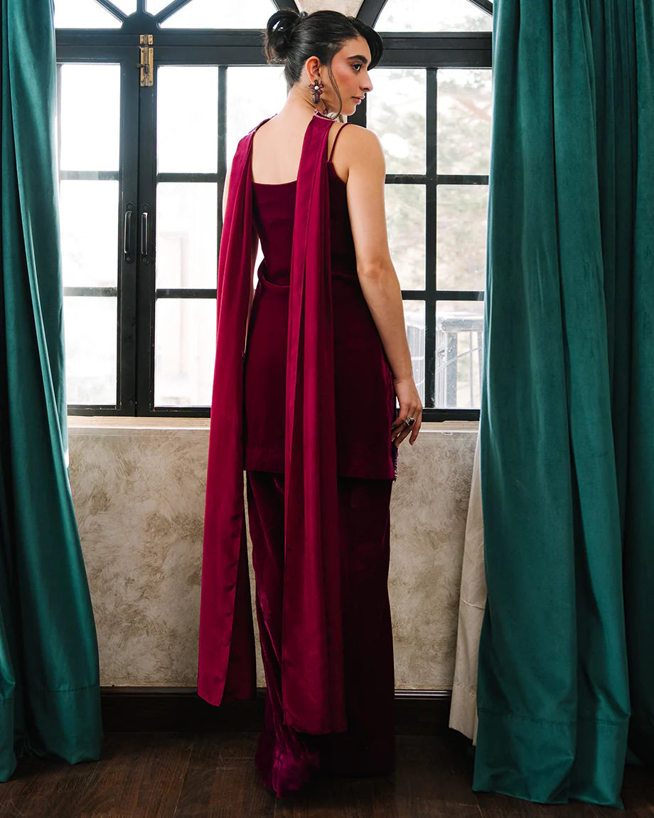 A plum 3-piece set featuring a velvet shirt and trousers with inner lining, paired with a skinny soft silk dupatta. Accented with silver and pink zari and stone handwork across the shirt and dupatta, designed for a tailored fit with an elevated semi-formal silhouette.