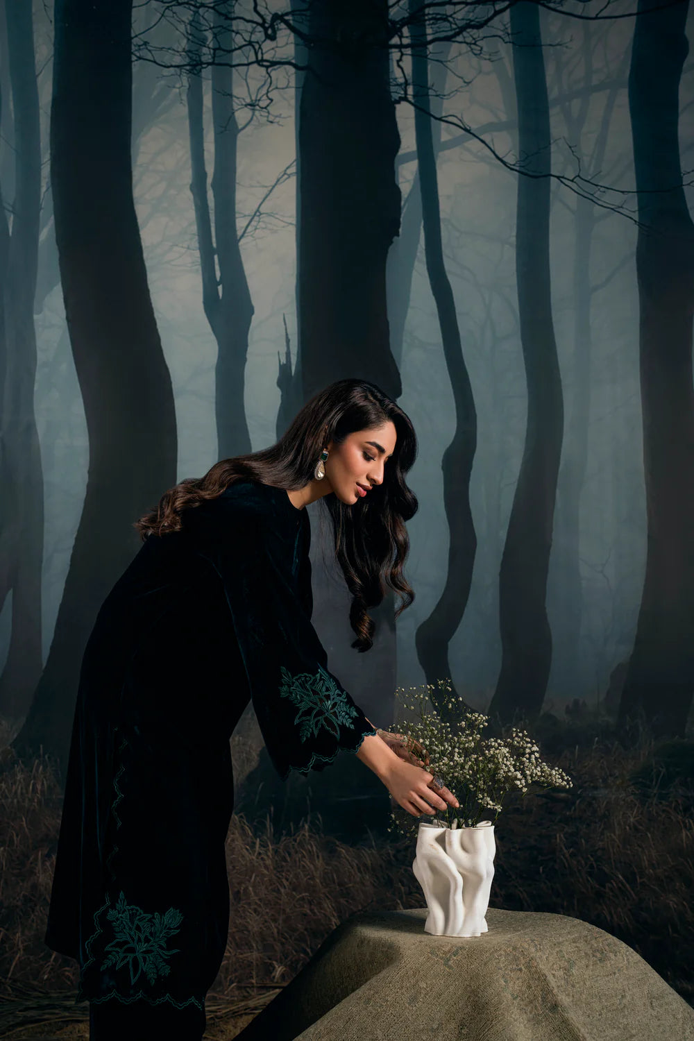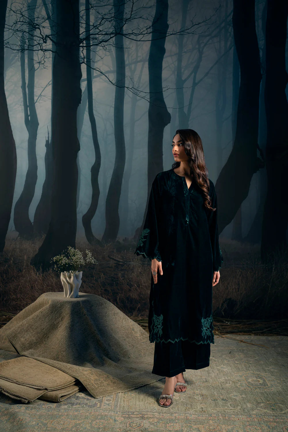 A deep emerald velvet kurta finished with subtle embroidery along the sleeves and hem, adding soft texture to its rich tone. The relaxed silhouette gives it a decent fall, paired with matching velvet culottes for a refined, cohesive look.