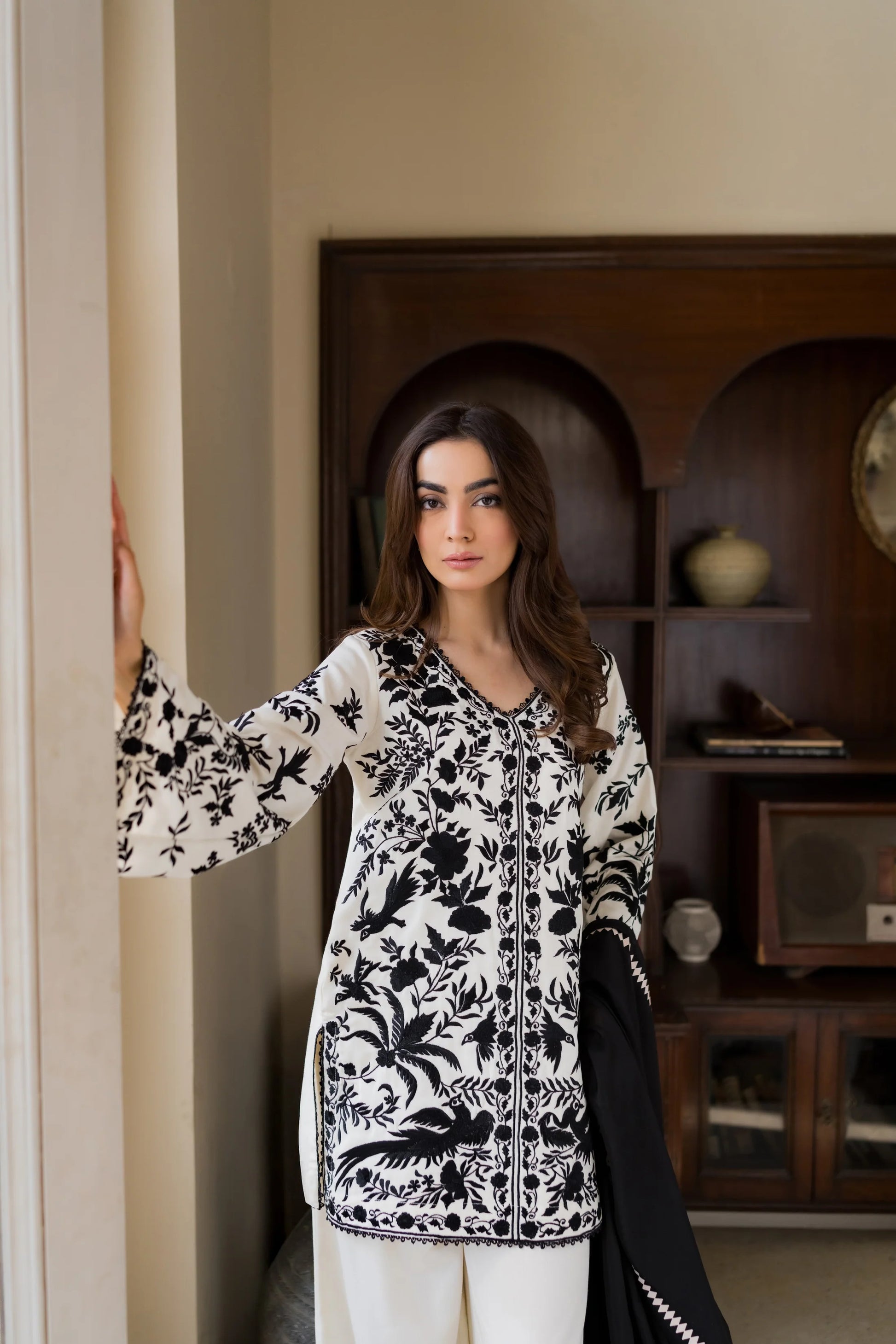 Presenting Leena — the classic black and white story redefined. Woven birds and florals bring texture to the ensemble, while a handcrafted block-printed dupatta in deep black adds depth, drama, and a touch of heritage allure.