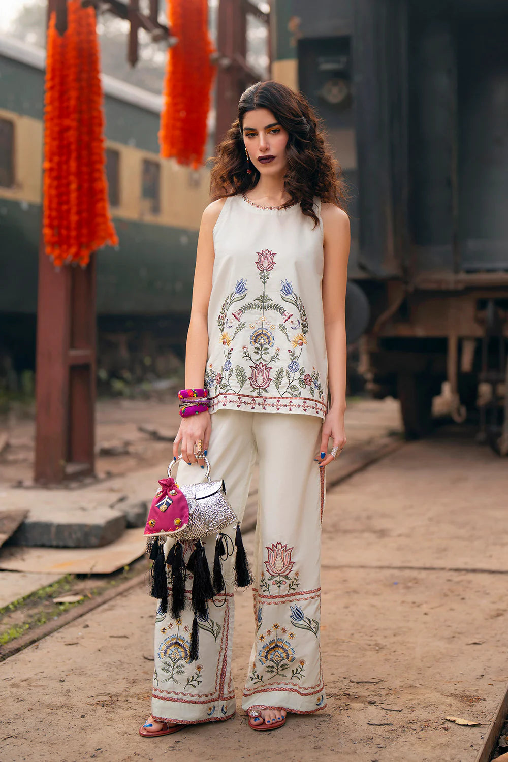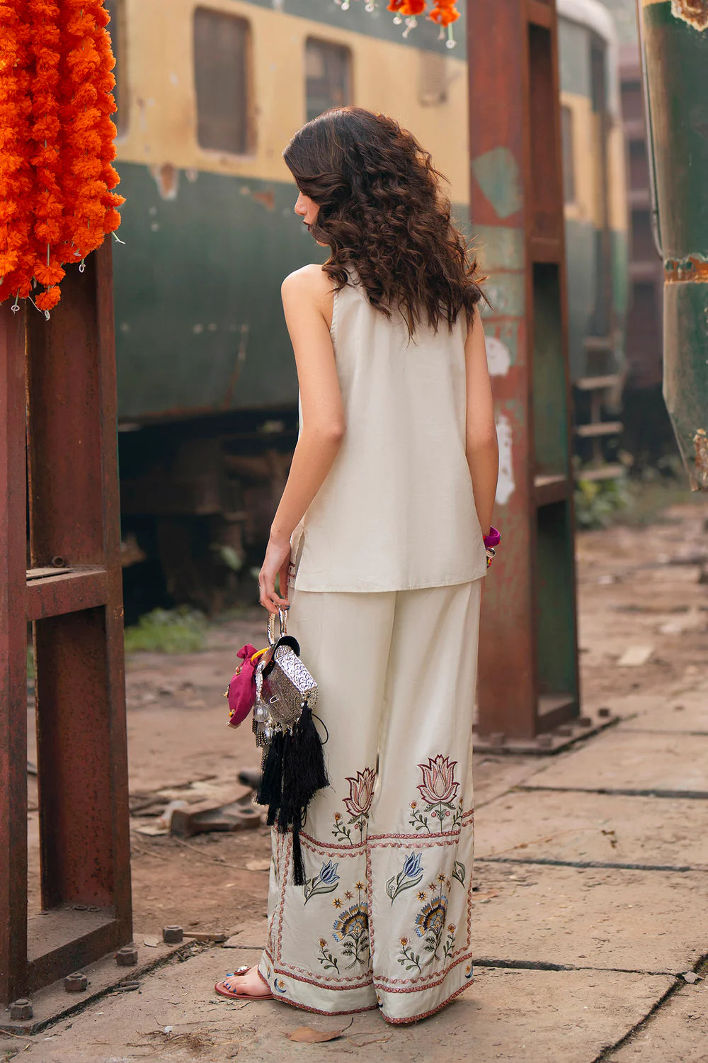 Radiate a serene and artistic charm in this two-piece ivory ensemble, featuring a sleeveless tunic with a modern, high-rounded neckline. The top is beautifully adorned with a central floral bouquet embroidery in soft shades of rose, muted gold, and forest green, accented by delicate trailing vines. The wide-leg trouser serve as a stunning focal point, featuring oversized matching floral motifs and intricate borders that wrap around the hem. With its clean lines and rich, garden-inspired needlework, this set offers a perfect balance of contemporary silhouette and traditional craftsmanship.