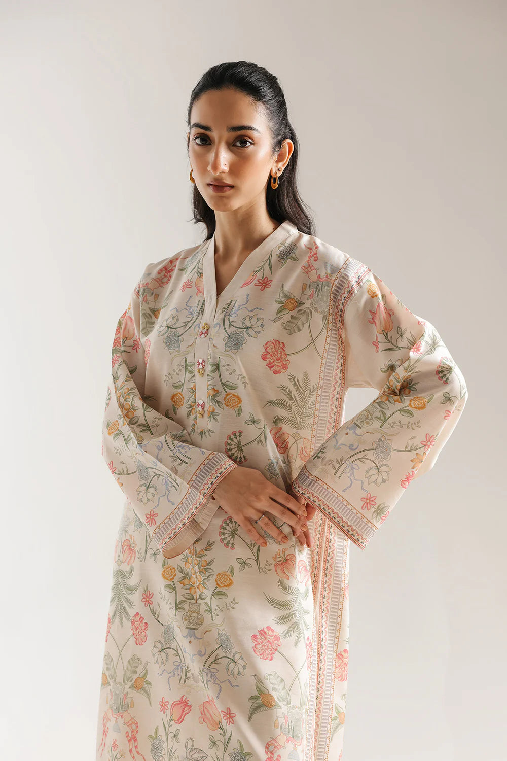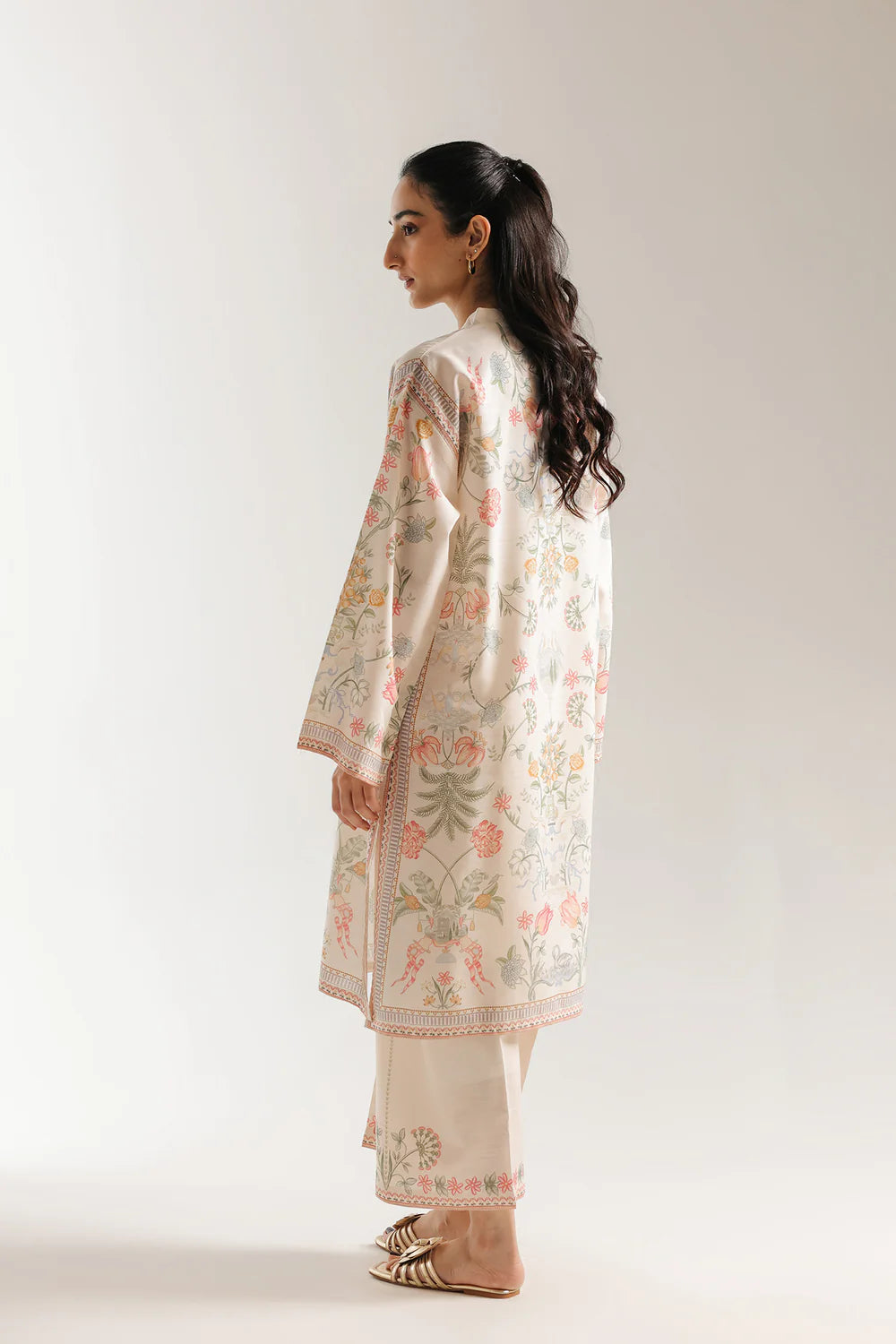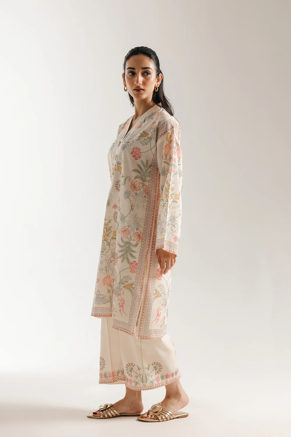 Embrace a refreshing and feminine look with this enchanting two-piece printed suit that radiates effortless elegance. The ensemble features a gracefully tailored kurta in a soft cream palette, beautifully covered in a lush botanical print of delicate pink, sunny yellow, and soft blue flowers nestled among fresh green leaves. A refined V-neckline with subtle accents adds a modern touch to the traditional silhouette, while the long sleeves are finished with intricate floral borders at the cuffs for a polished look. Complementing the shirt is matching culotte fit trouser that feature a beautiful, coordinated floral border at the hem, creating a seamless and sophisticated aesthetic. Whether you are attending a sunny daytime event or a casual afternoon gathering, this breezy and stylish outfit ensures you stay comfortable while looking timelessly chic.