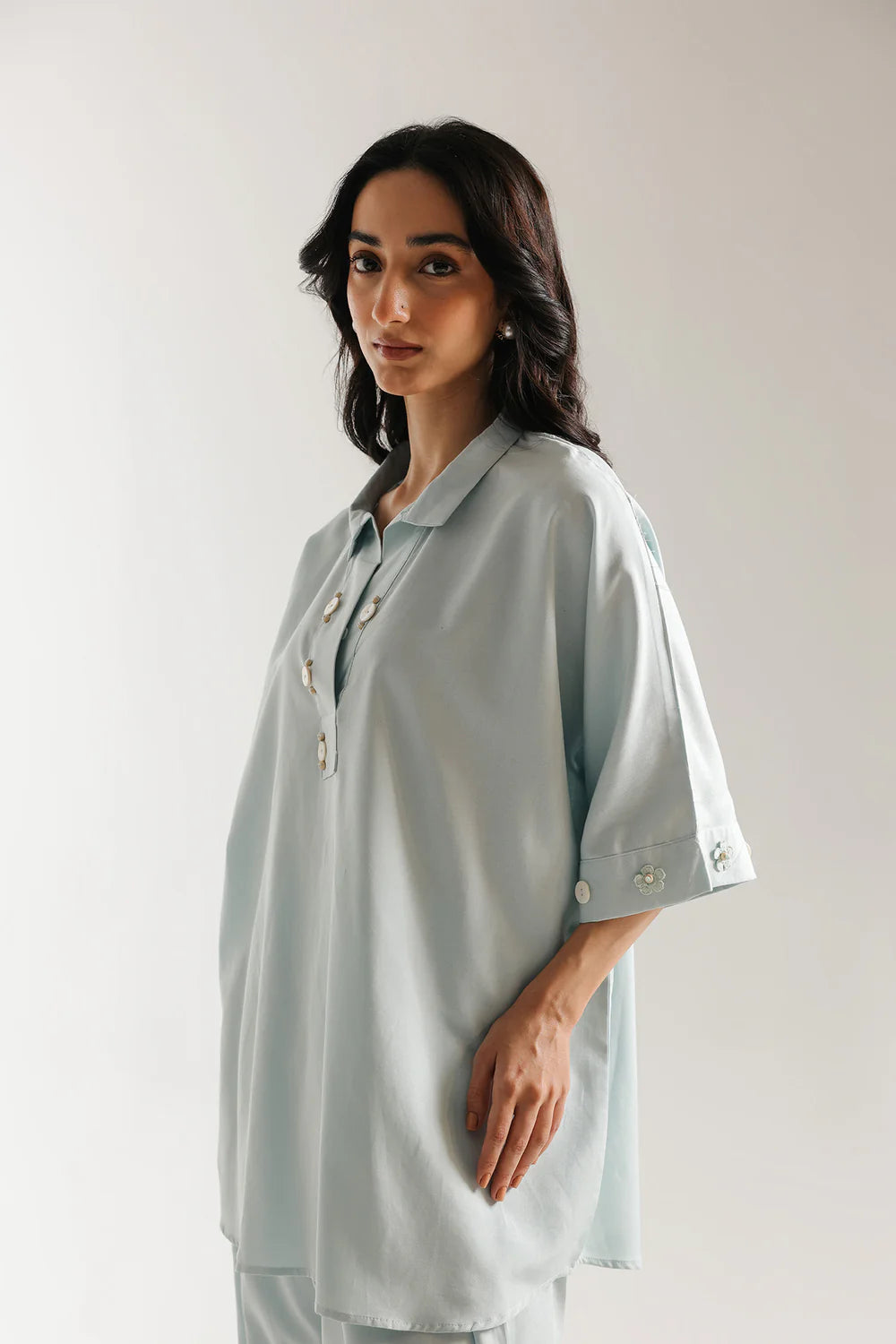 Discover contemporary ease with this refined, light aqua-coordinated set, designed for the modern individual who values both comfort and style. The oversized boxy shirt features a classic collar and refined placket closure accented with lustrous pearl-toned buttons, while elbow-length sleeves are finished with subtle metallic detailing at the cuffs. Paired with generously cut harem pants that gather elegantly at the ankles, this ensemble embraces volume and movement for an effortlessly sophisticated silhouette.