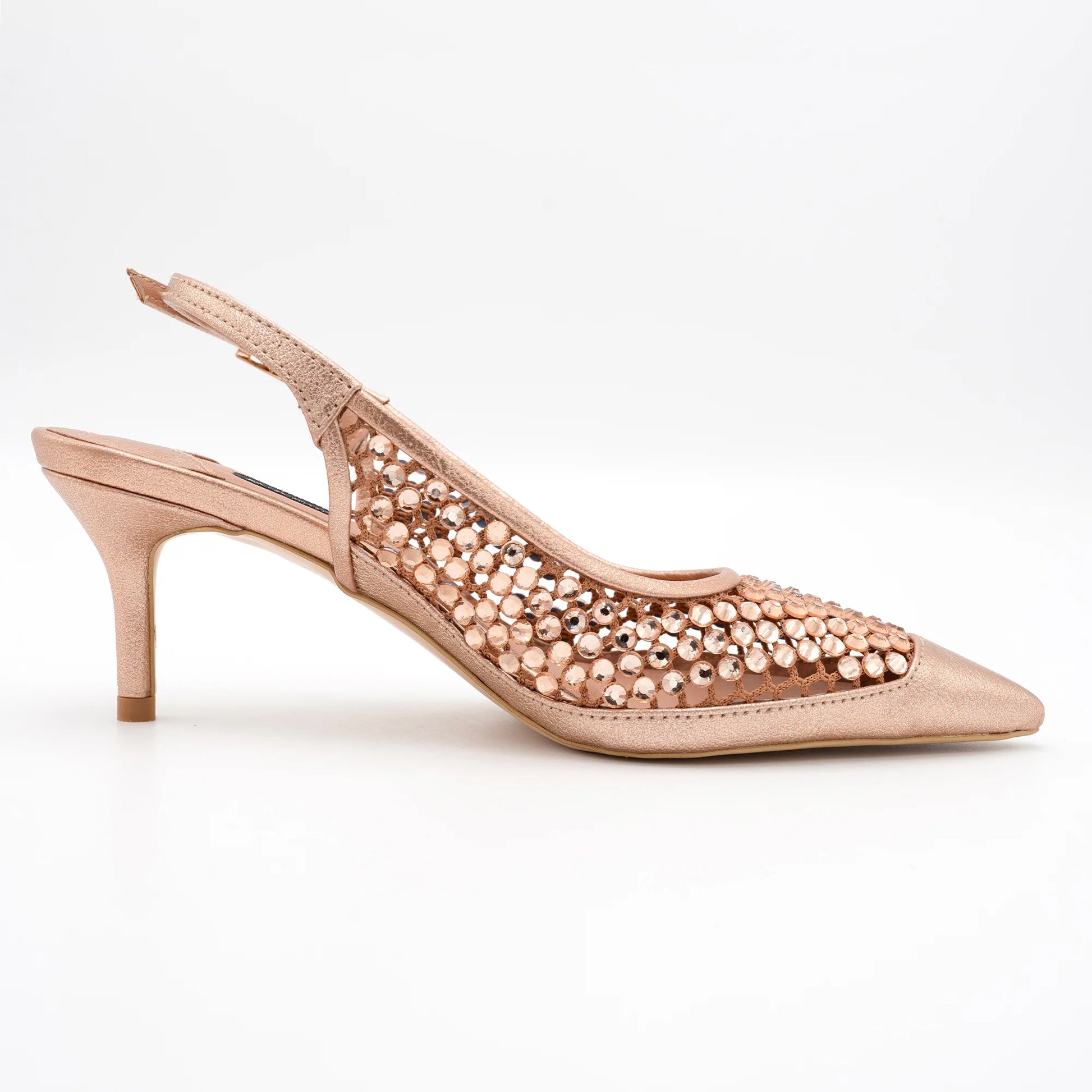 Crafted in a lustrous rose-gold tone, this slingback heel combines modern design with a timeless silhouette. The pointed toe coupled with a crystal embellished mesh upper brings a sophisticated charm to this evergreen beauty. Crafted in a lustrous rose-gold tone, this slingback heel combines modern design with a timeless silhouette. The pointed toe coupled with a crystal embellished mesh upper brings asophisticated charm to this evergreen beauty.