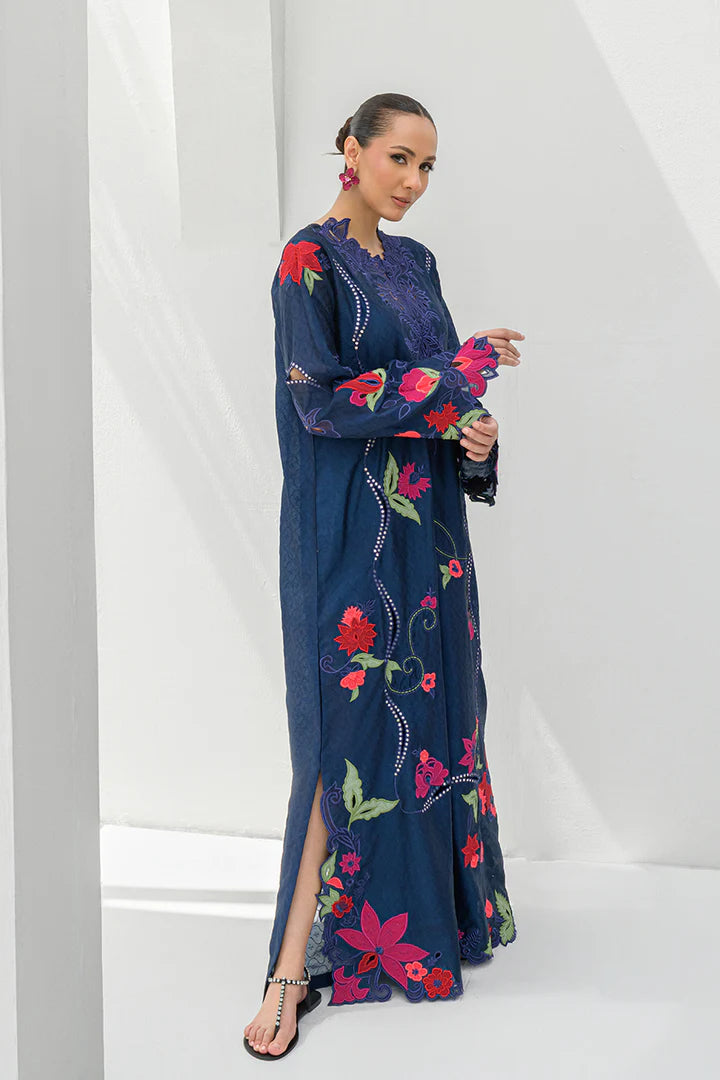 Cloaked in a deep navy hue, this pure silk kaftaan exudes regal charm with exquisitely appliques florals and accentuated with mirrorwork and organza embroidered neckline! The fluid drape evokes timeless grandeur and is a portrait of refined elegance!