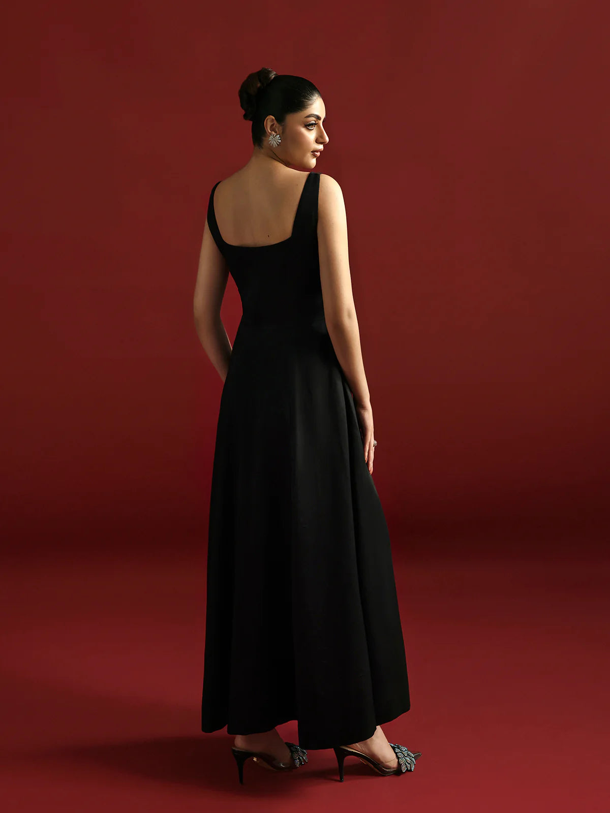 Black flowy frock is a timeless wardrobe staple that effortlessly blends luxury with comfort, making it ideal for dinners and parties alike.