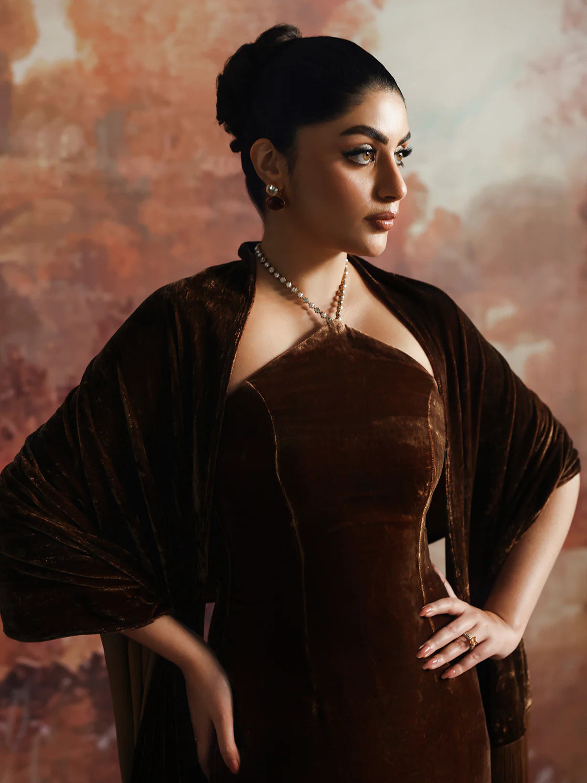 Our brown velvet dress paired with velvety scarf detailed with fringes, is an effortless dress perfect for moments of quiet sophistication.