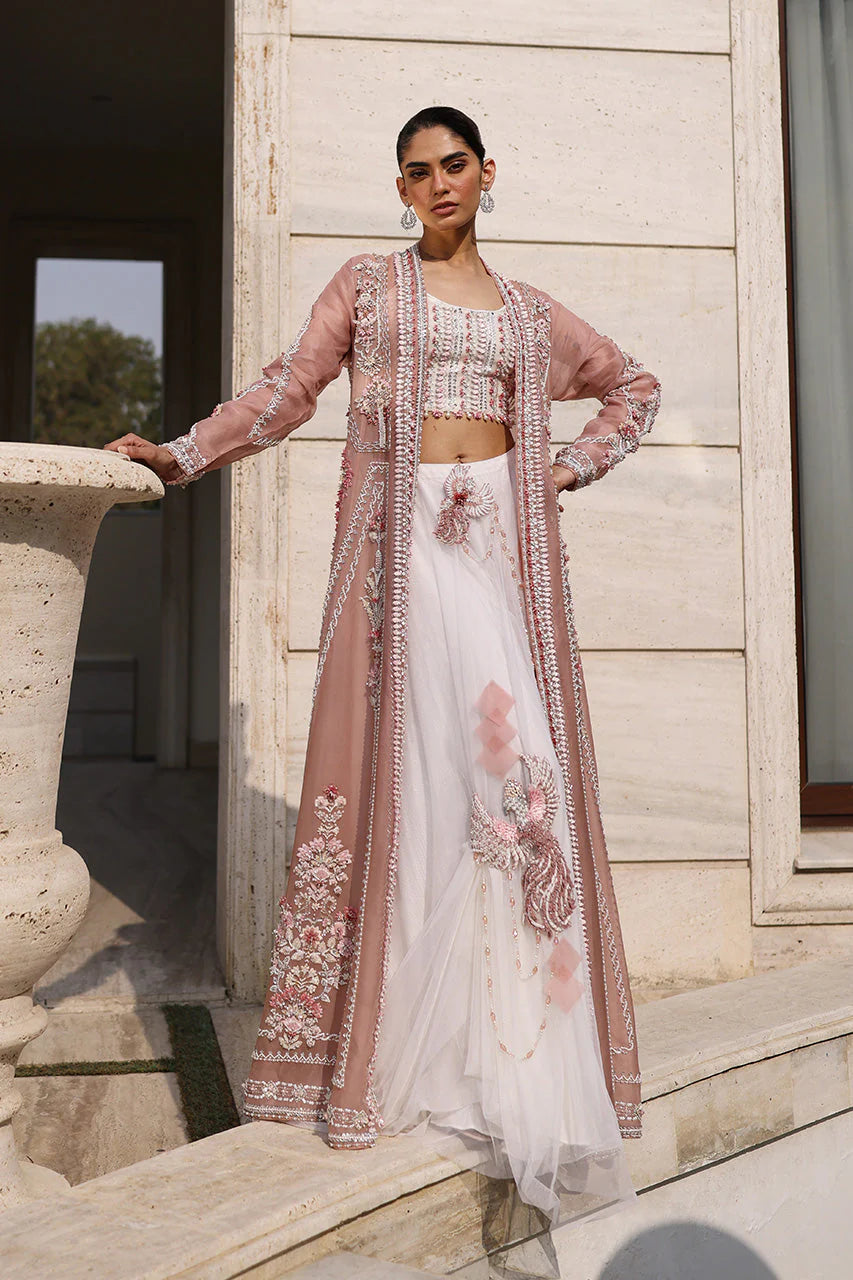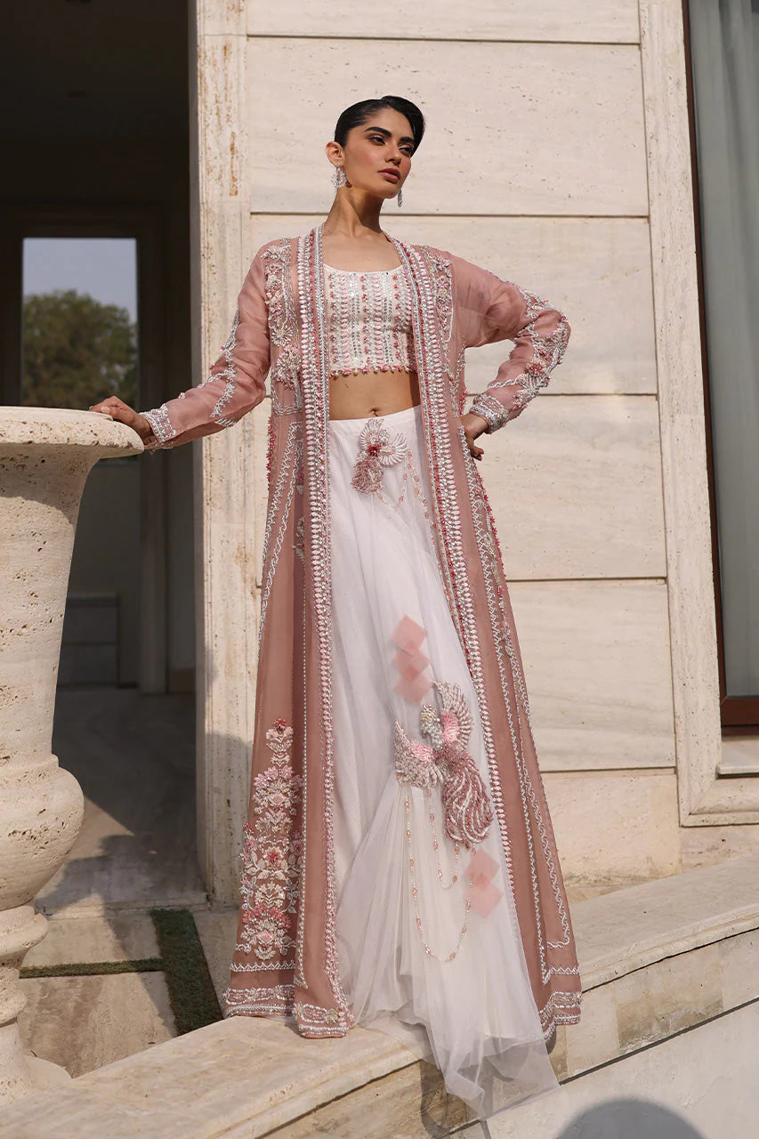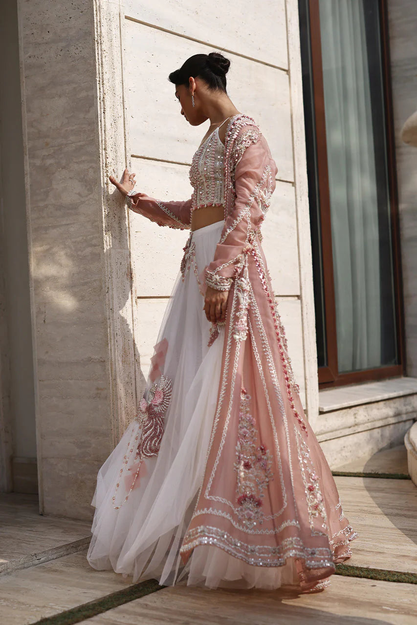 A soft pink narrative carries through this ensemble. The sheer organza jacket, cut in an A-line, is traced with florals and geometric handiwork that catches light across its length and sleeves. Its delicacy sets the tone for the layers beneath.