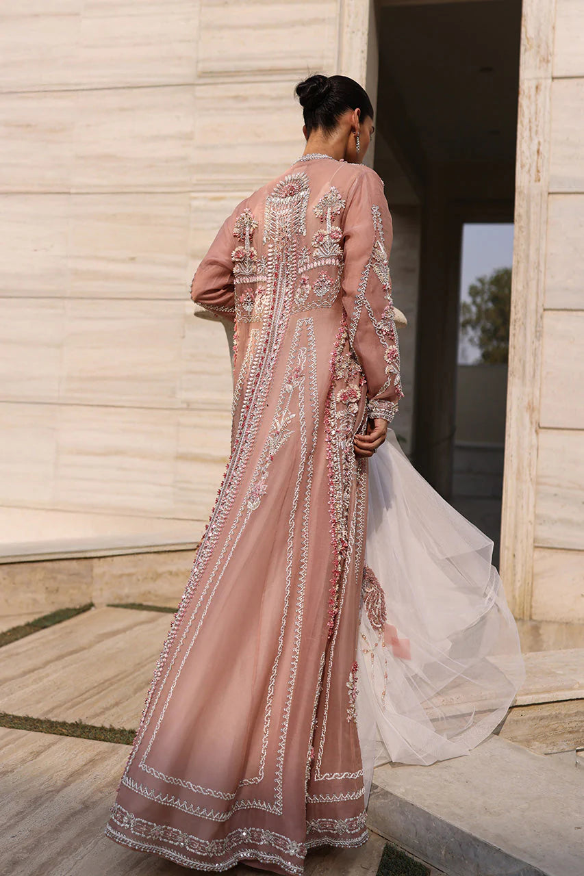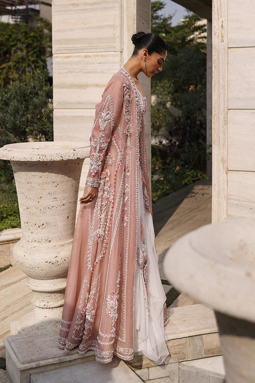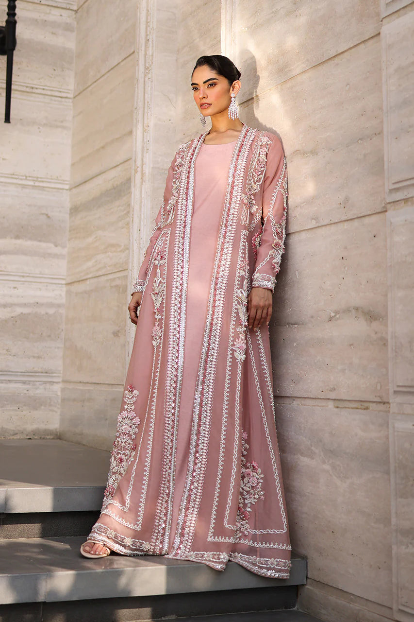 A soft pink narrative carries through this ensemble. The sheer organza jacket, cut in an A-line, is traced with florals and geometric handiwork that catches light across its length and sleeves. Its delicacy sets the tone for the layers beneath.