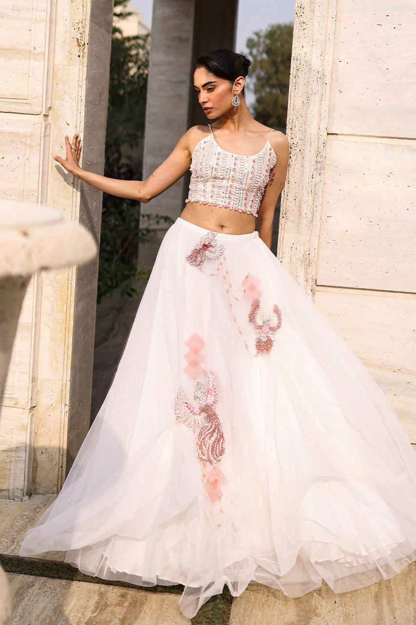 The white organza blouse strikes a new chord with geometric details, similarly hand-embellished with sequins, crystals, beads and silver zardozi and crystal droplets hemming its cropped length. The whimsical pièce de résistance, a gathered, white soft net skirt completes the look with masterfully detailed avian motifs placed along the front. Together, they create a romantic composition rooted in meticulous craftsmanship and contrasting styles.