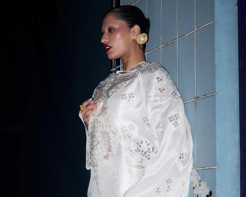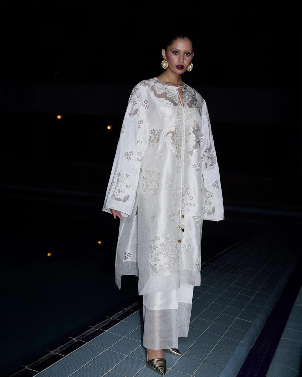 This distinctive outfit features an elegnat ivory silk shirt features delicate organza machine embroidery with hydrengia cutworl for a soft, graceful look. The neckline is finished with gold coin and white sequen tussels, adding a hint of shine. Paired with plain ivory silk trousers accented by an organza patch, the outfit blends simple sophistication with style.