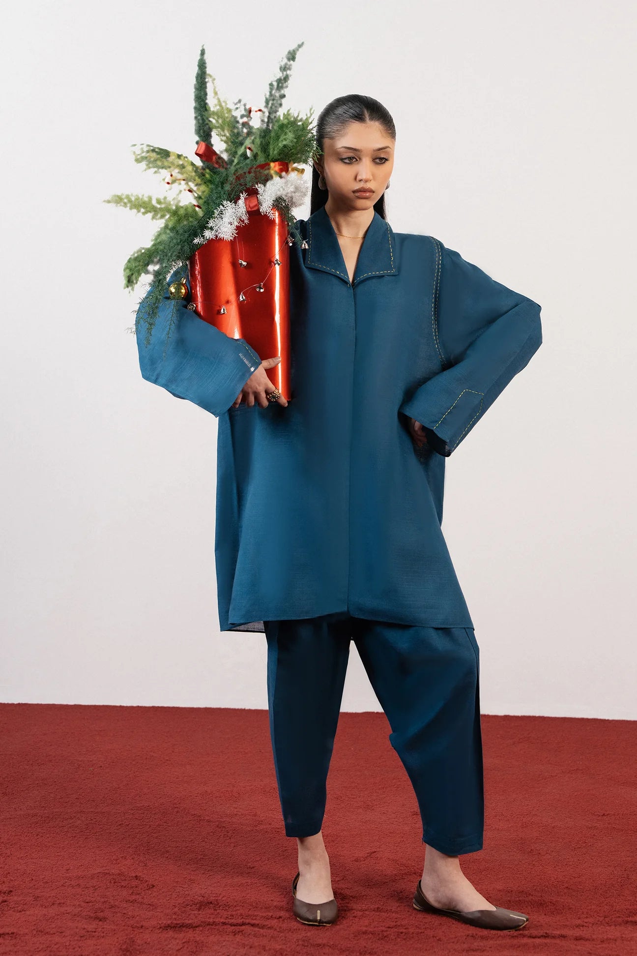 LYRA — Soft blue khaddar two-piece featuring a collared short kurta and tapered trousers. Minimal, warm, and perfect for cozy winter days.