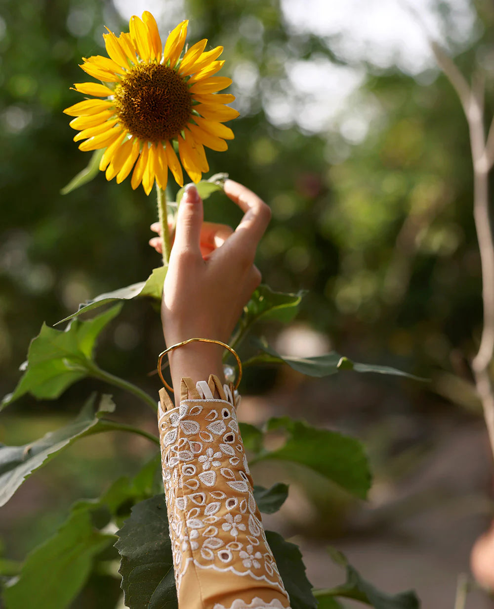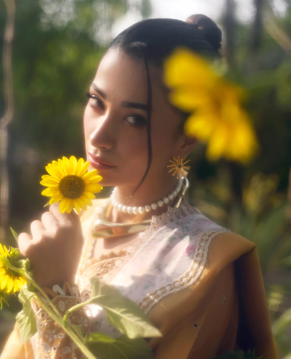 Embrace the warmth of ochre! This lawn shirt features a three-panel design adorned with white and tilla floral motifs, brought to life with textured embroidery and the needle bore technique. The arched neckline is delicately outlined with floral motifs, complemented by an organza hem border. The sleeves also showcase needle bore and motifs. Paired with a slub monar dupatta featuring a four-sided embroidered scalloped border and a silk-printed border, this outfit exudes elegance. Complete with cambric pants, it's a perfect blend of tradition and style.