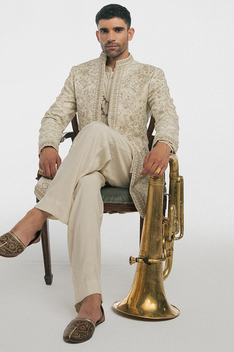 A sand beige embroidered kurta pajama set featuring intricate geometric and floral motifs. Detailed with kora, tilla and resham.
