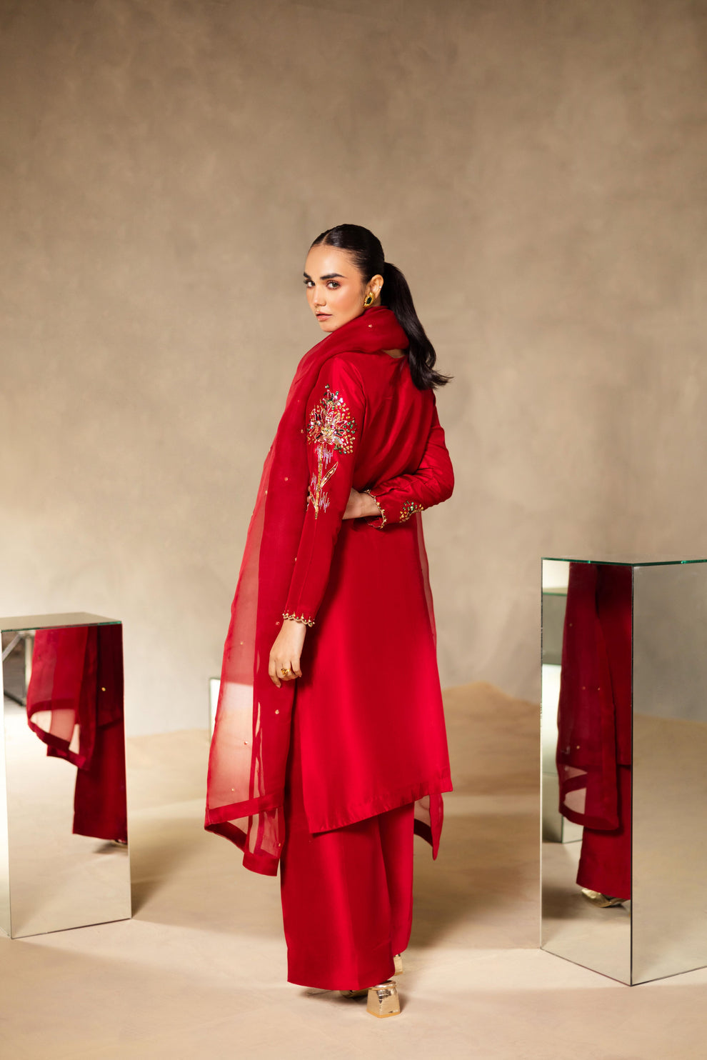 An exquisite blend of artisanal skill and contemporary sophistication in a captivating pome red shade, embellished with detailed Sequins and Zari embroidery. This ensemble is complemented by a luxurious Organza dupatta, making it the ideal choice to honor love and tradition.